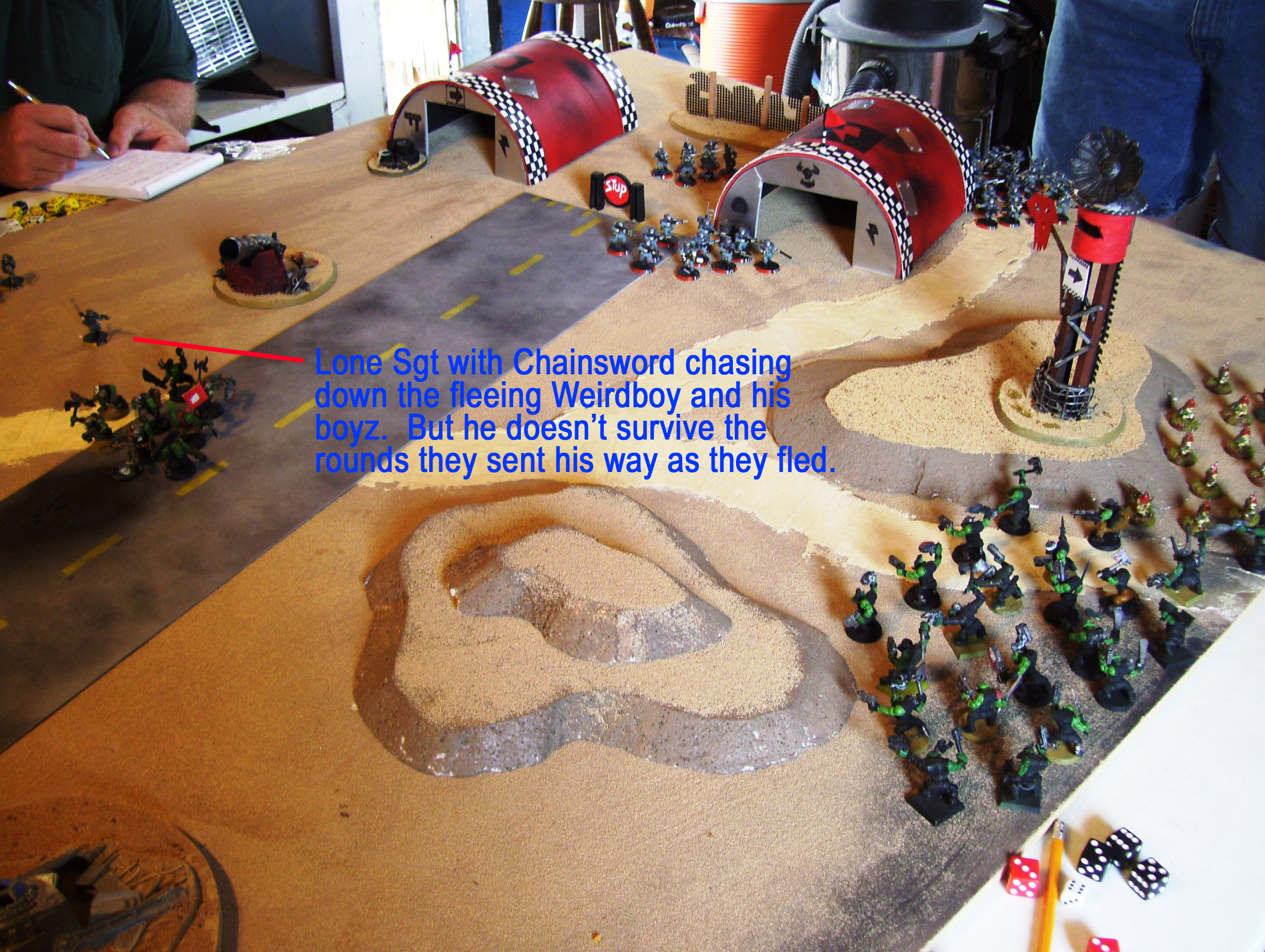 On the far side of the battlefield, holding his head in pain, Weirdboy Snikshak Dakazod continued to run towards cover, while the shoota boyz finished off the missile squad hidden in the trees.