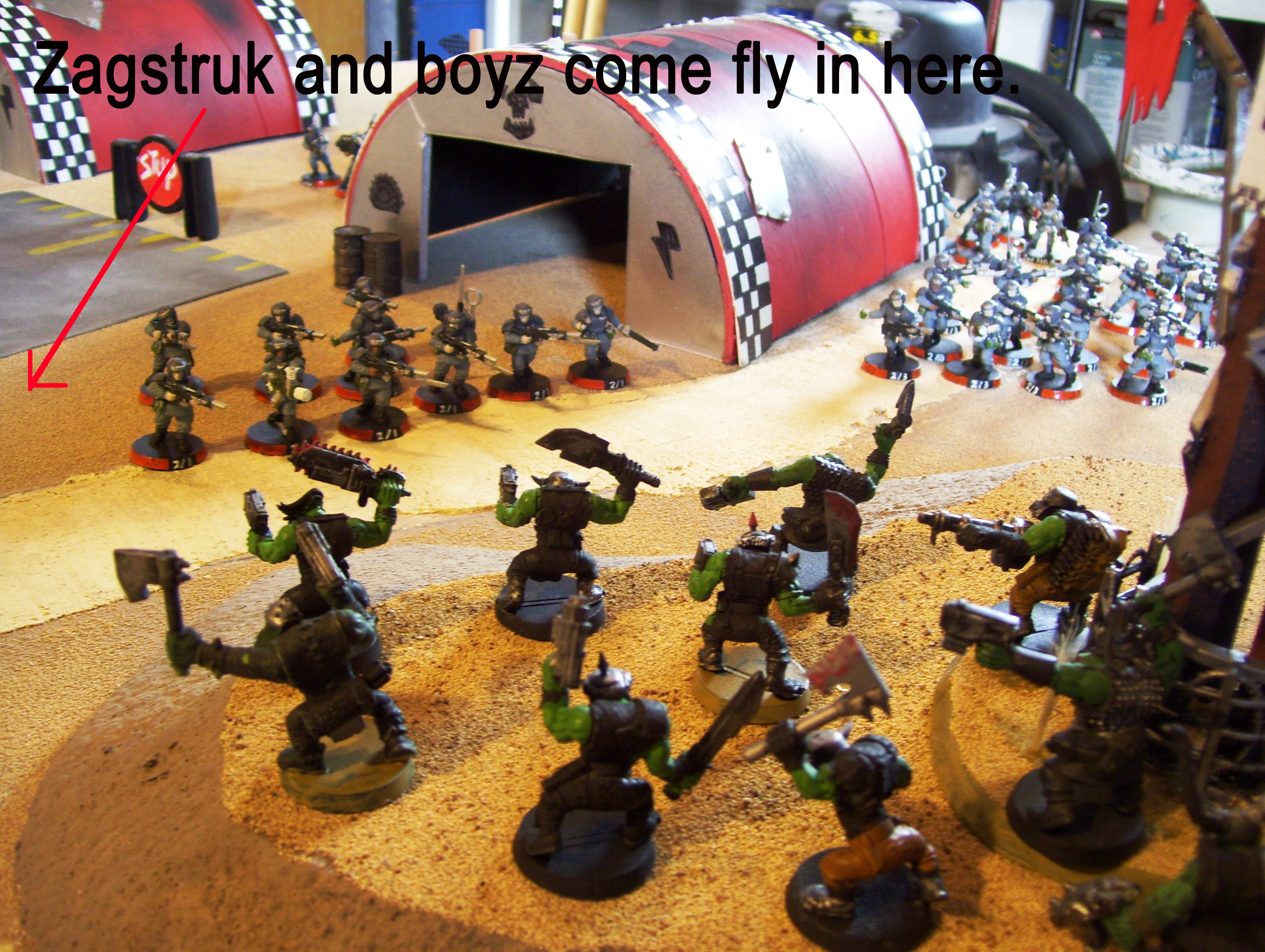 The boyz and grots guarding the air tower could see the oncoming humans moving to attack, but they followed their orders reluctantly and stayed put. Nob Hedsmasher could see the Imperial Guard soldiers sneaking around the Mek Shops, but he also caught a glimpse of ten flying shadows. Could it finally be the fearsome Zagstruk and the infamous Vulcha boyz?