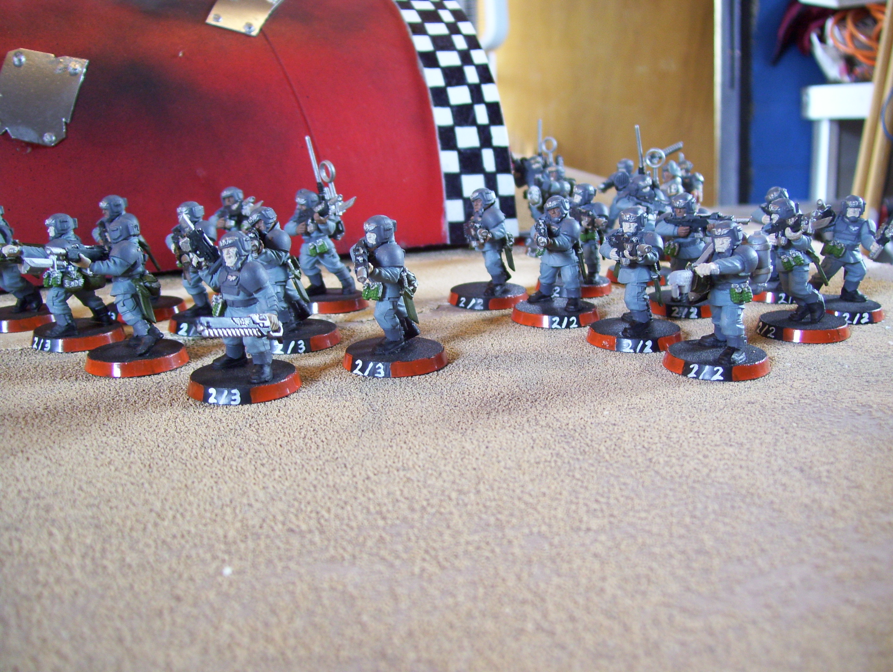 Lt. Lopez's 2nd platoon all stopped short of the objective once the rokkit pack wearing orks and the slugga boyz all appeared right in front of them. They were roaring and shooting in the air. Lopez ordered a massed fire volley from 3rd squad. Hopefully the squads rapid firing lasguns would thin the ork ranks. Just then, 1st squad disintegrated in front of the young lieutenants eyes. Flak armor and helmets with gibbering bloody heads still in them flew in all directions as a massive nob and his rokkit boyz fell upon them. None of them stood a chance and the whole squad was torn to ribbons in seconds.