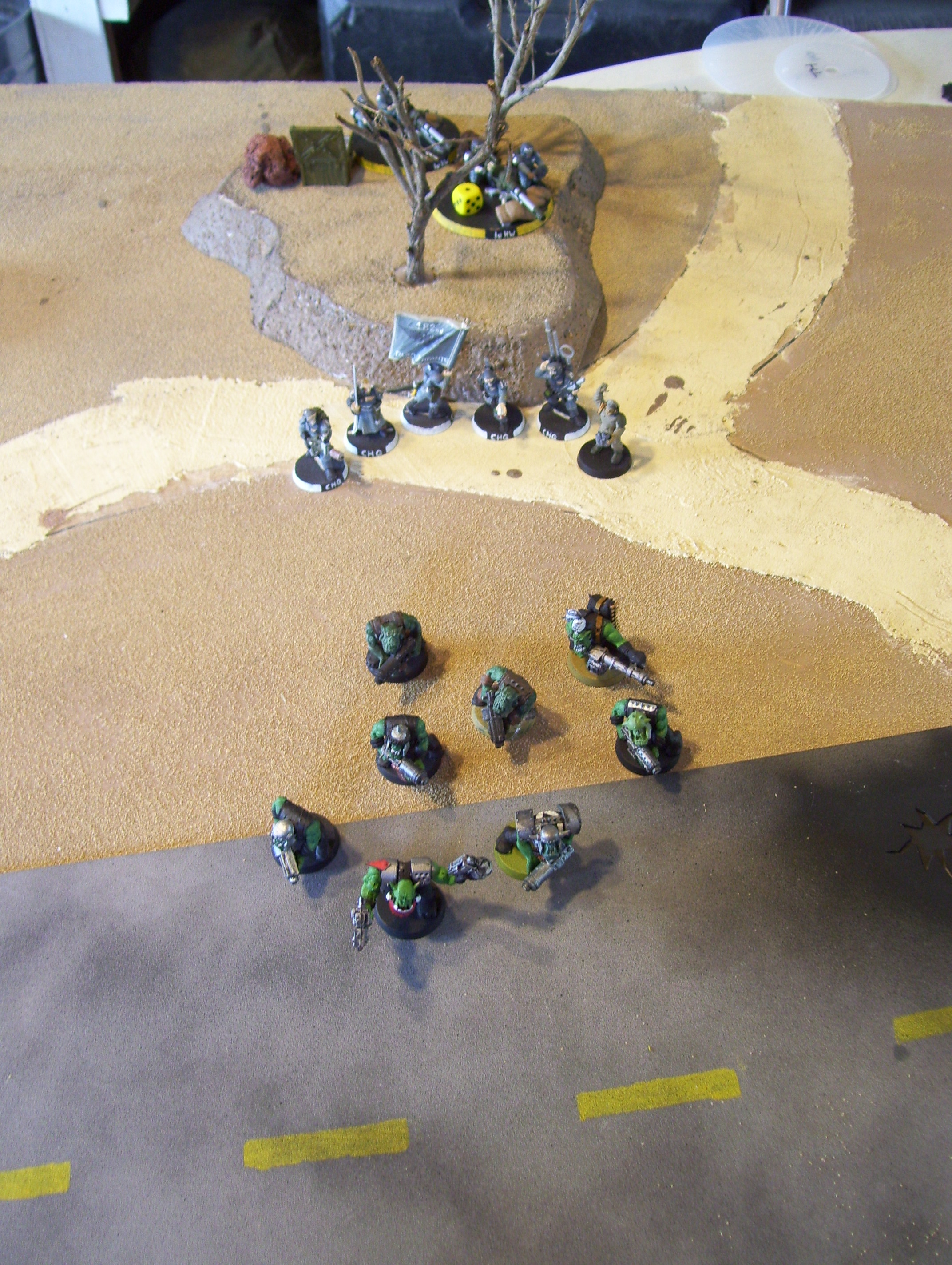 Nob Hedsmasher and his boyz ran over the hill past the tower towards the guardsmen. They couldn’t get them this turn, but next turn they will finally get to bloody up their weapons.