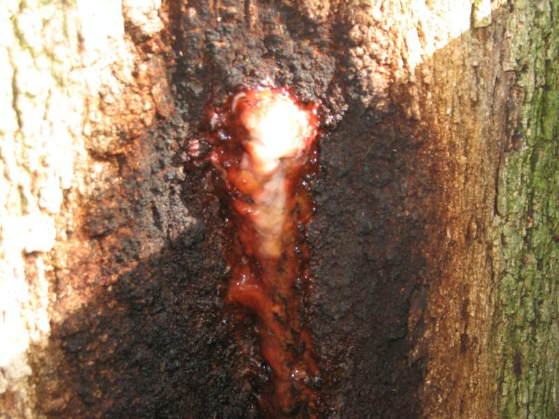 It didn't smell like anything besides sap, I think it was a mixture of drying/fresh sap, and some strange fungus growing inside. It seemed like it was just damaged wood underneath, nothing gnarly.