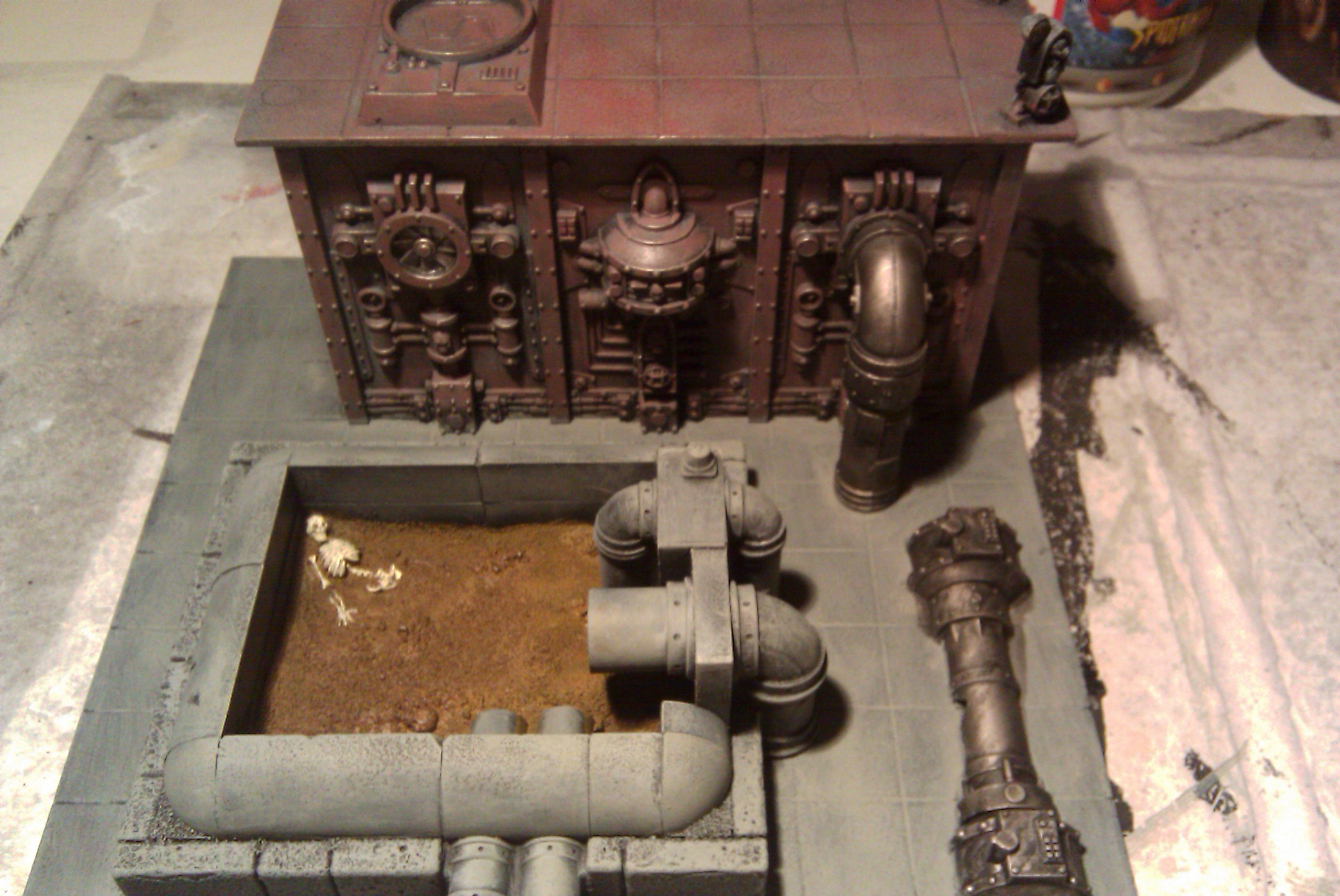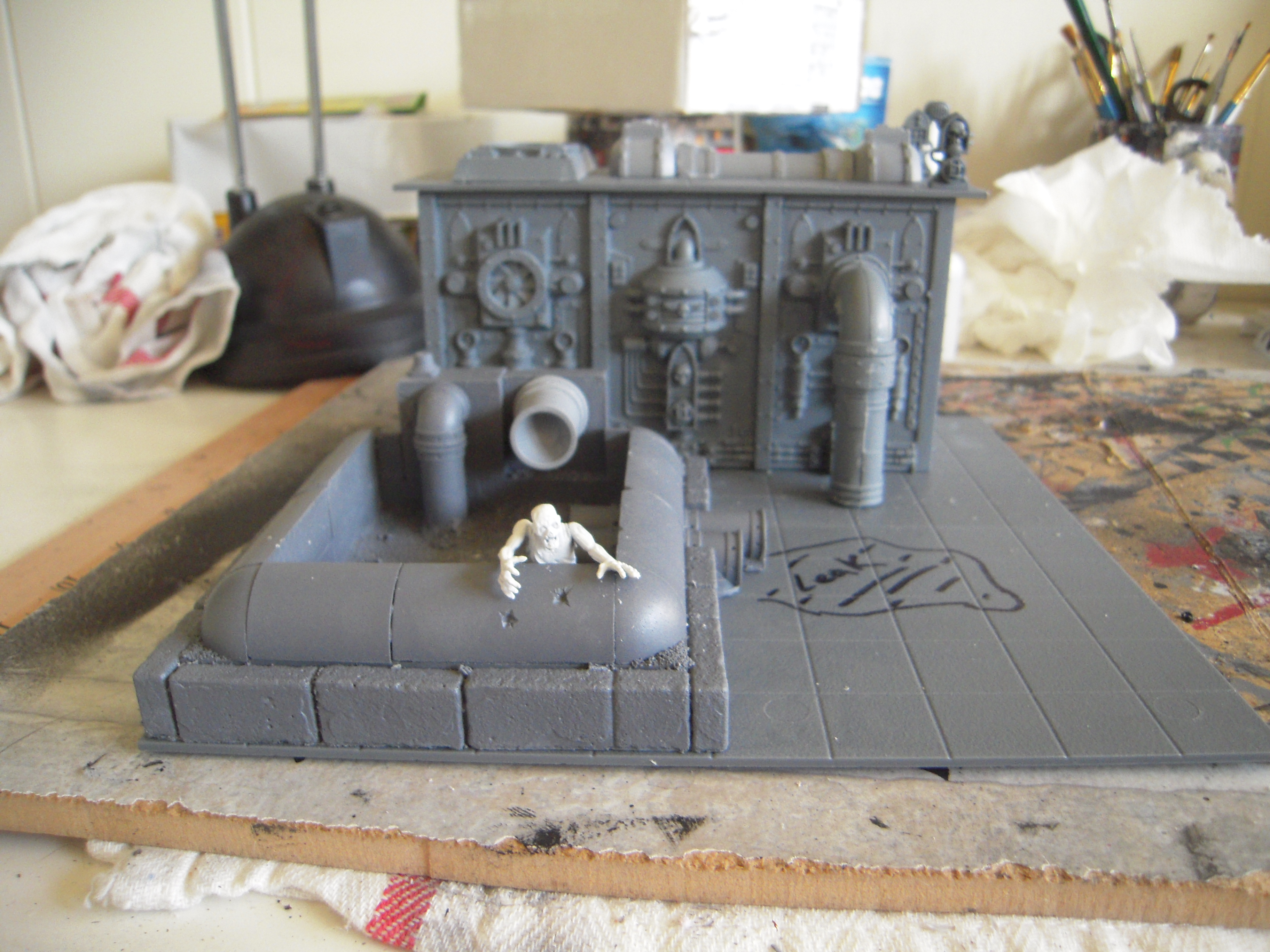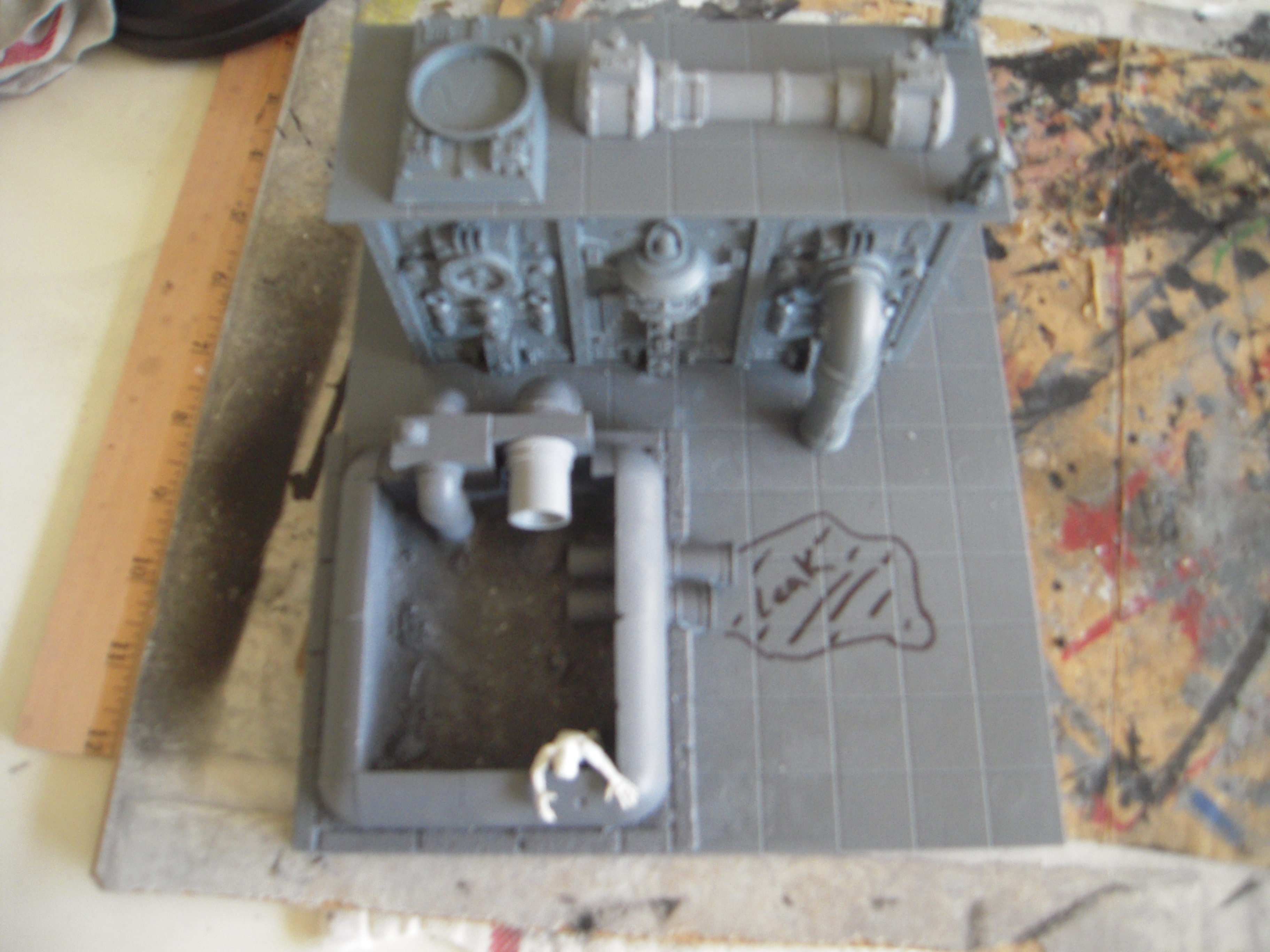 The water treatment plant is on the painting table. Here are a few shots of the plant. In one of them you will see a skeleton reaching for a lasgun, I need to know if I should keep it in there or not ( note: it will not be the lasgun pictured, that is for another project ). Let me know what you think so far and as always keep the comments coming!!!