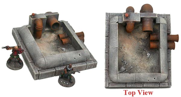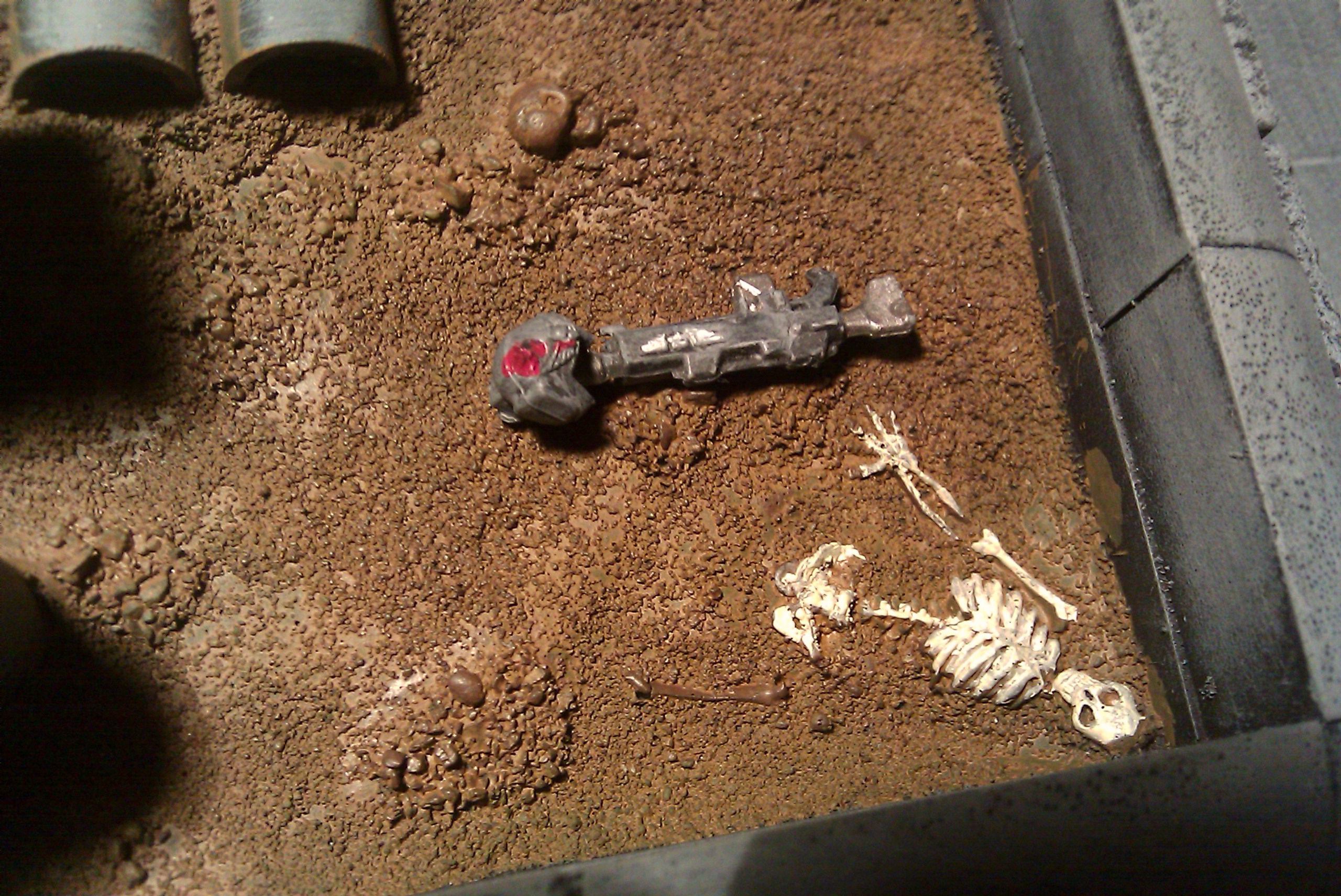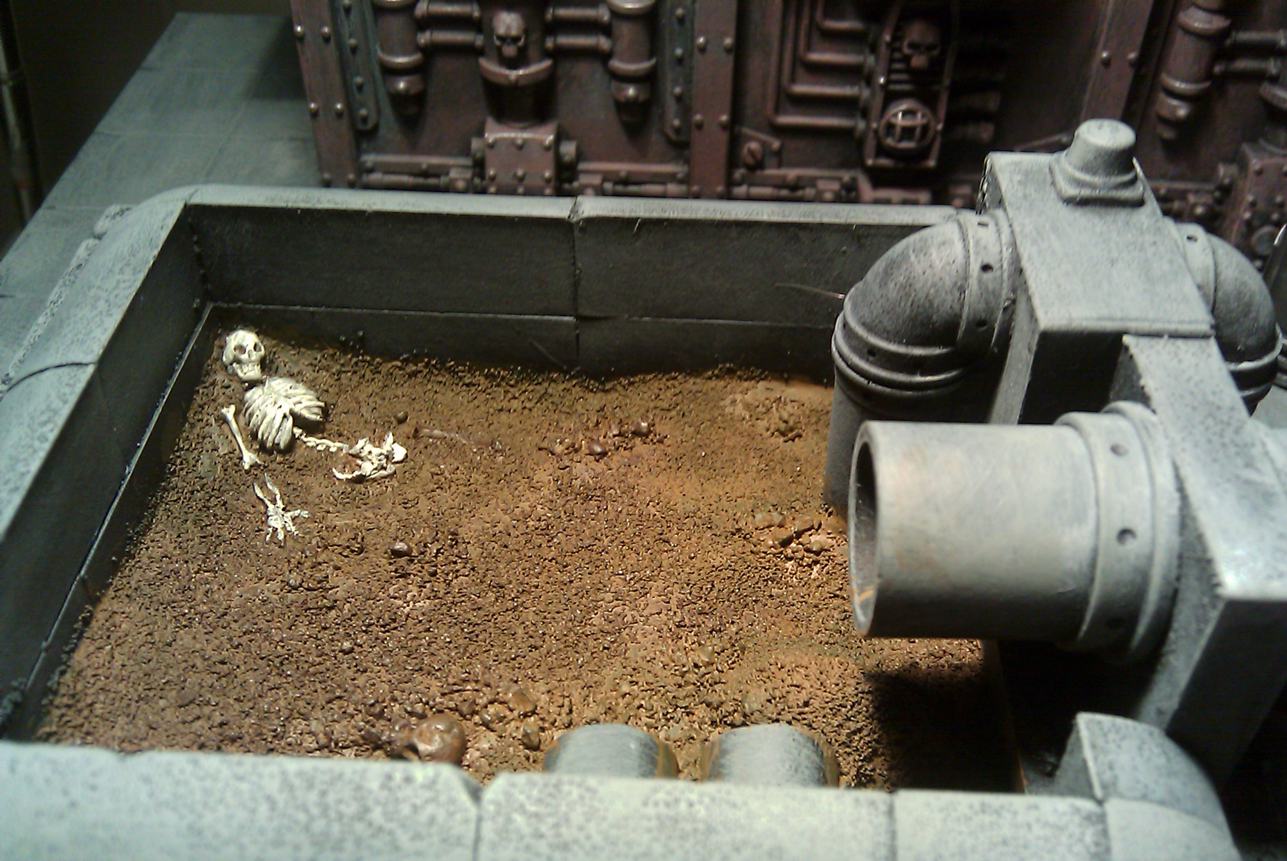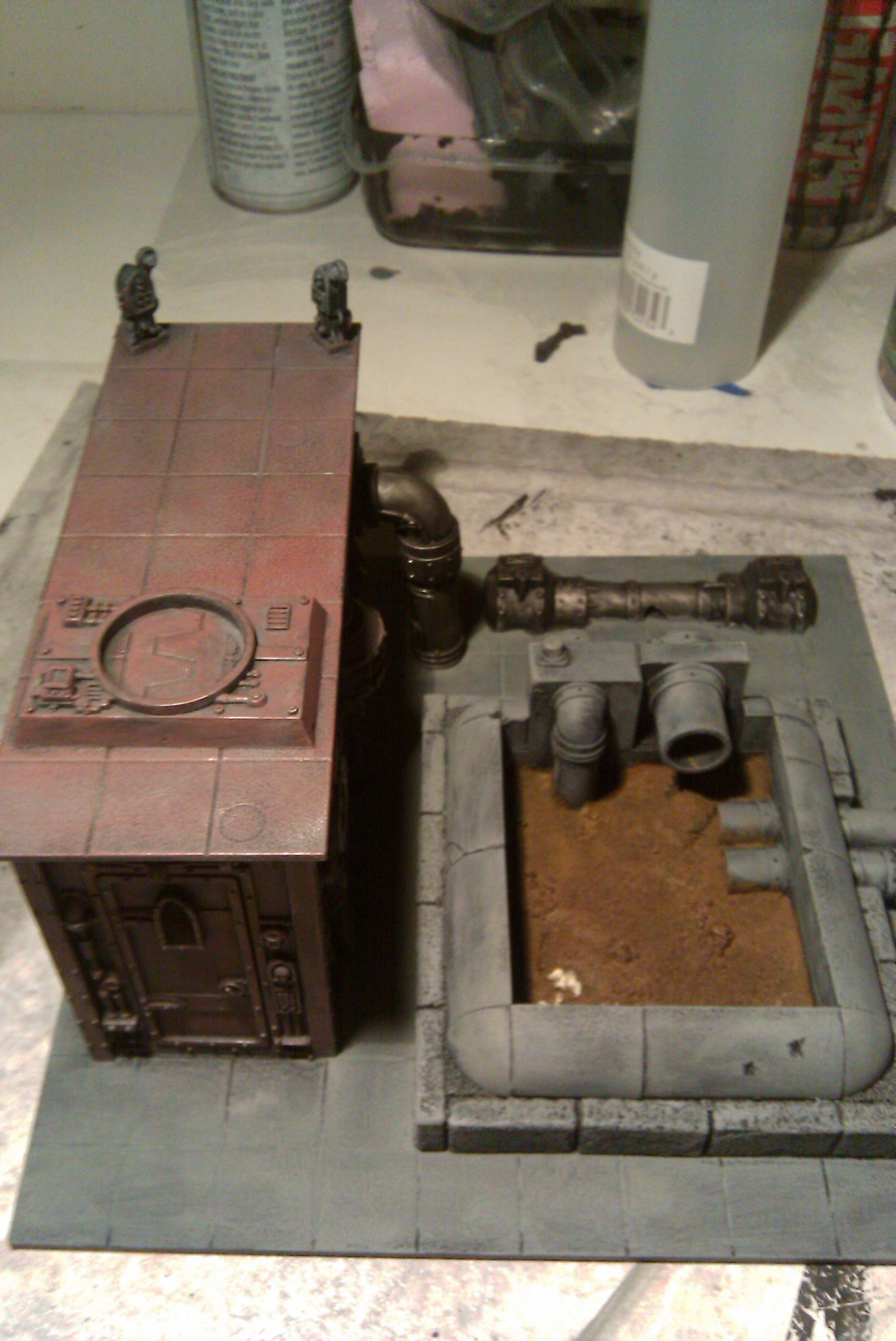 The water treatment plant is on the painting table. Here are a few shots of the plant. In one of them you will see a skeleton reaching for a lasgun, I need to know if I should keep it in there or not ( note: it will not be the lasgun pictured, that is for another project ). Let me know what you think so far and as always keep the comments coming!!!