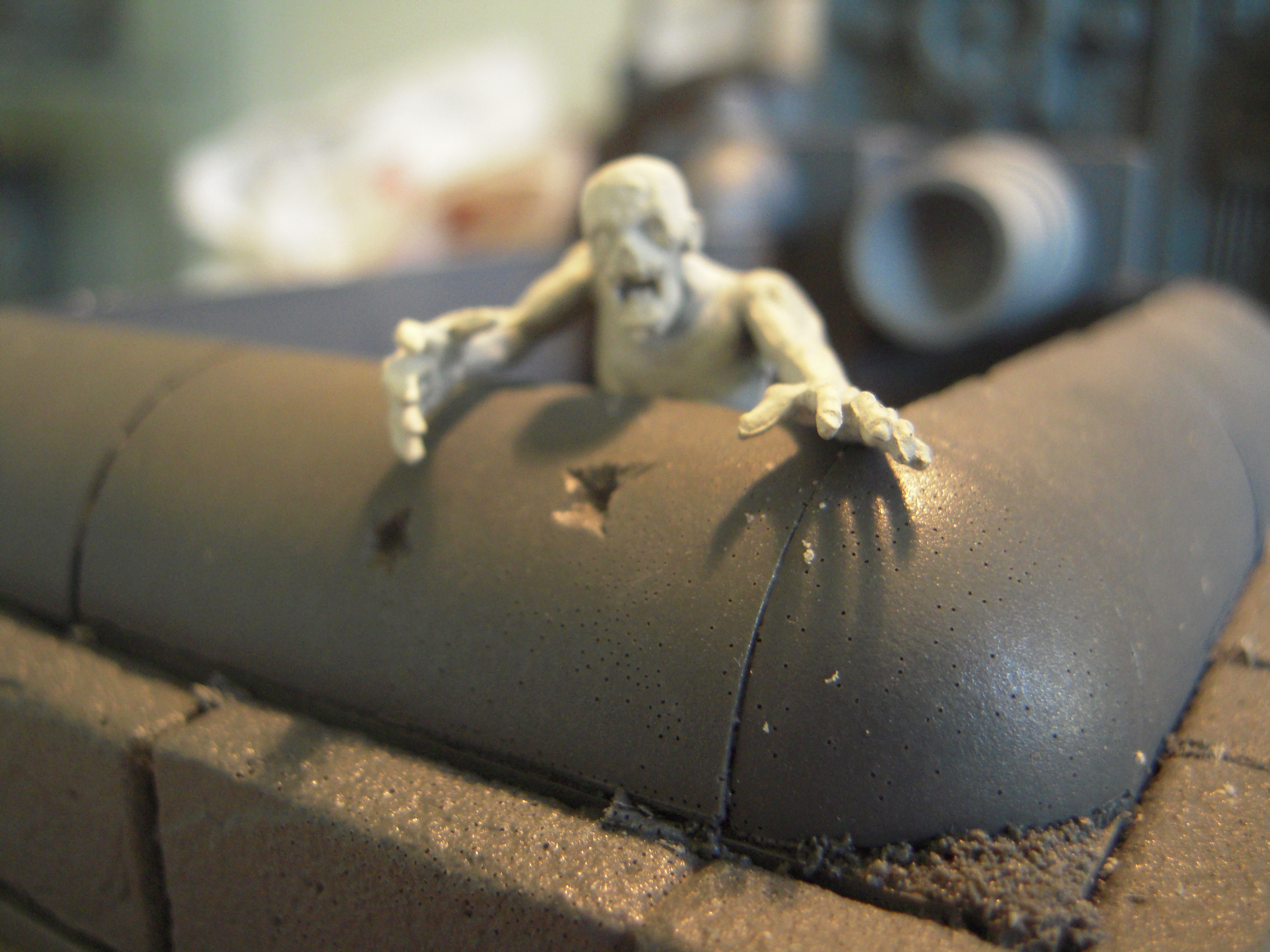 Look good so far though I'm not to sure about the Zombie. Have you decided about your colour for the water yet? How about mixing some thraka green wash into water effects for a kind of sewer water look.