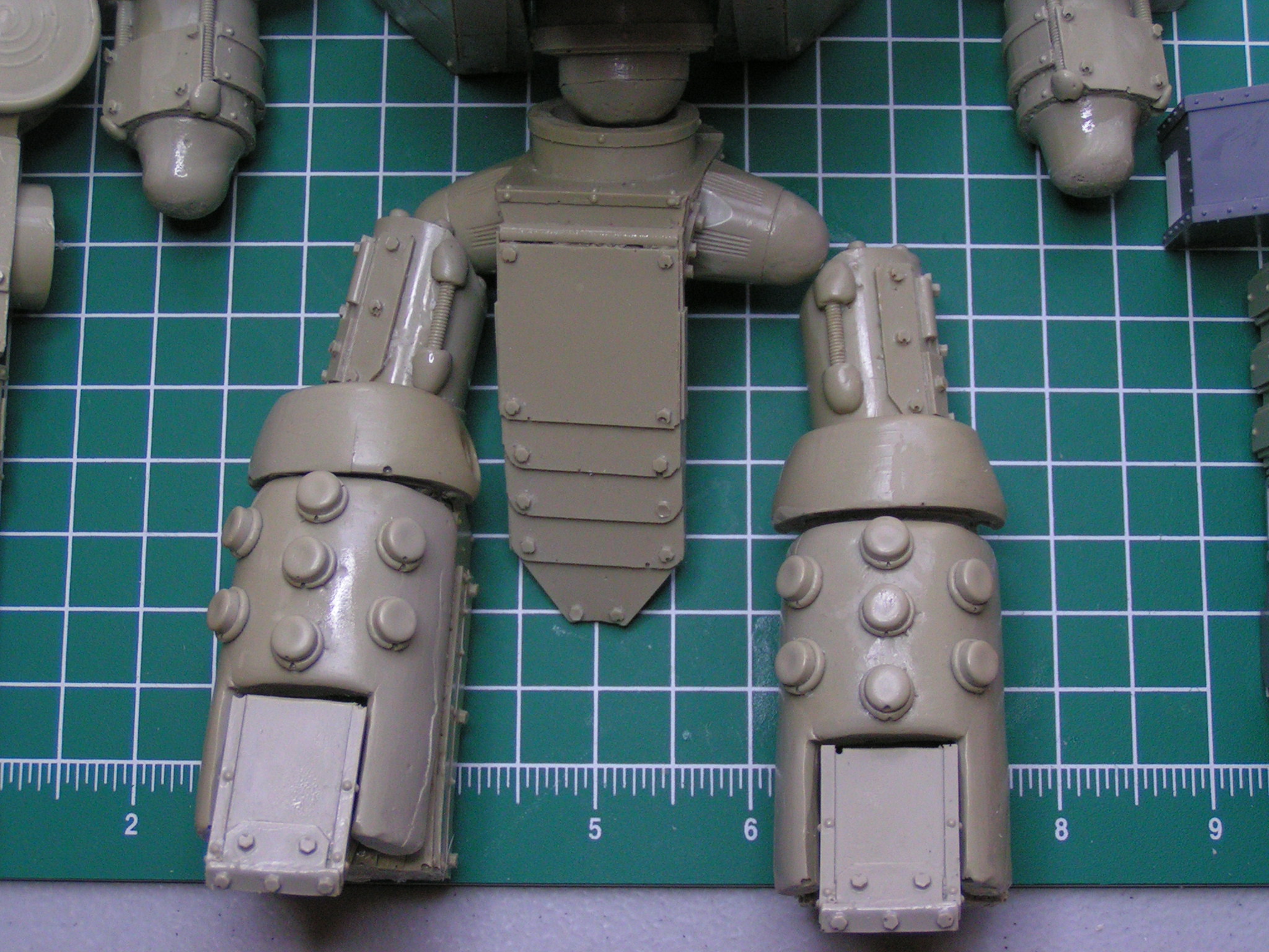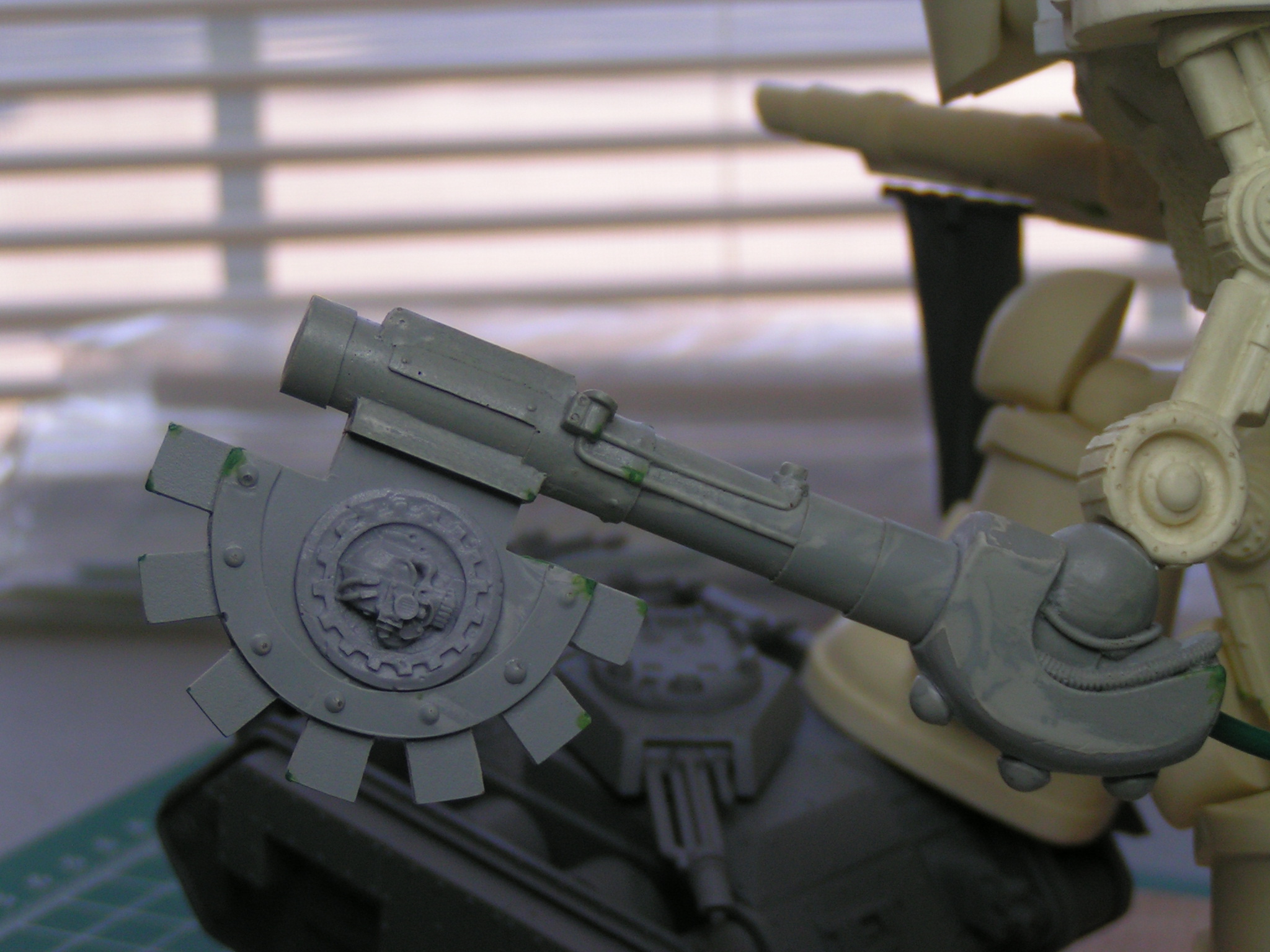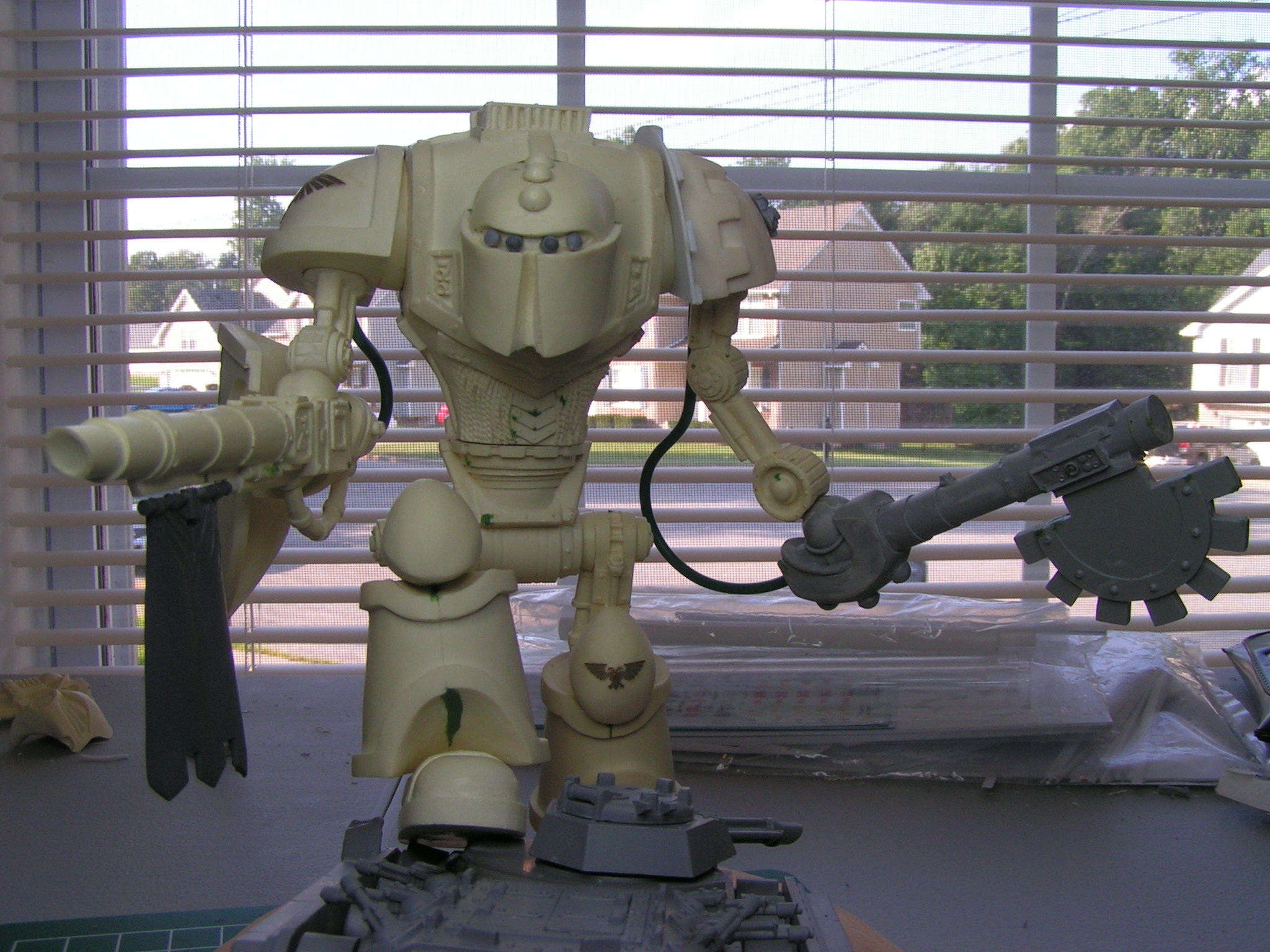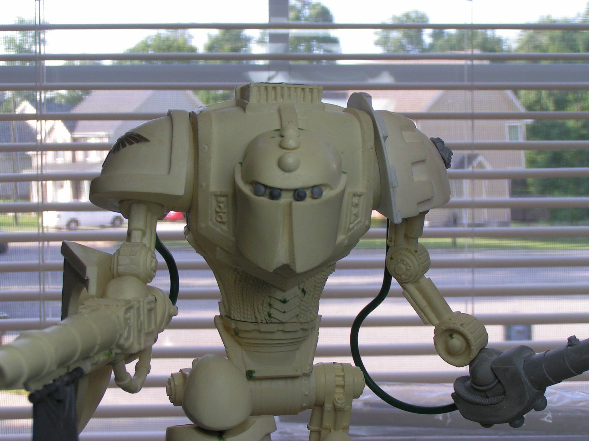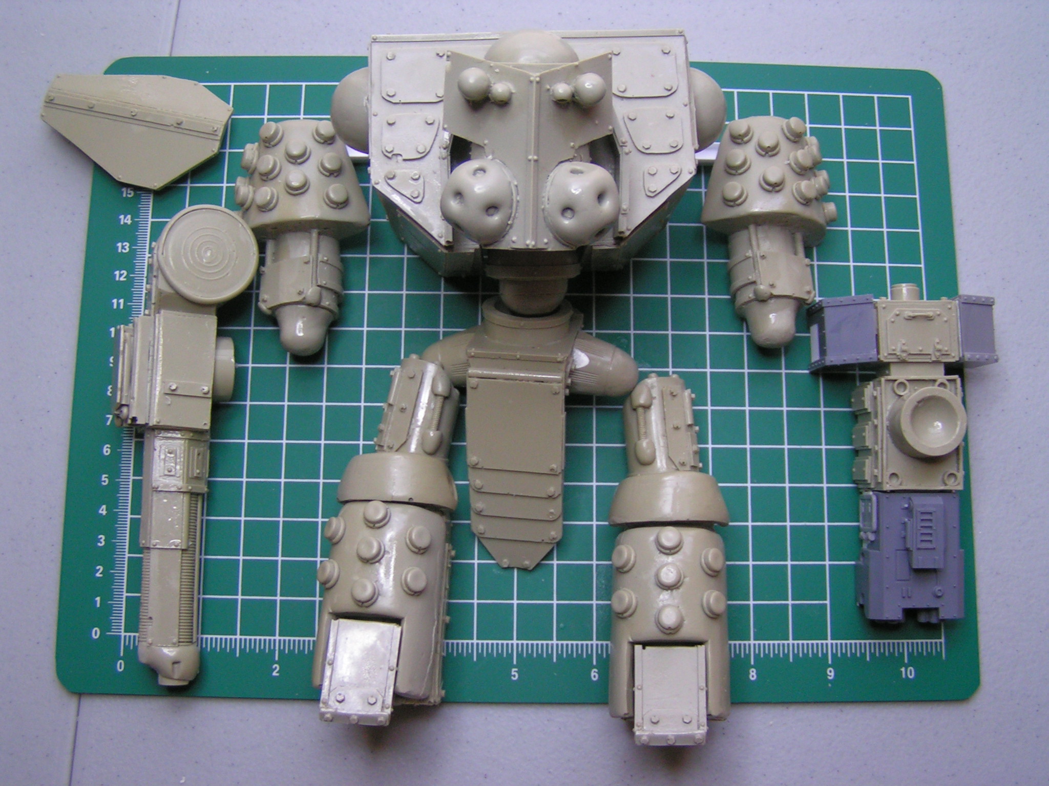 Here's my first quick update. All I've added so far is a brass Imperial Eagle to the left knee, power cables to each arm, and a banner to the cannon arm. Let me know what you think. I hope to have this guy completely built by the end of the week.