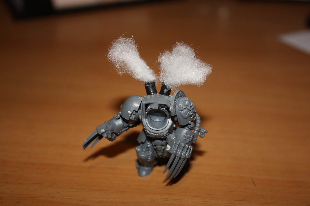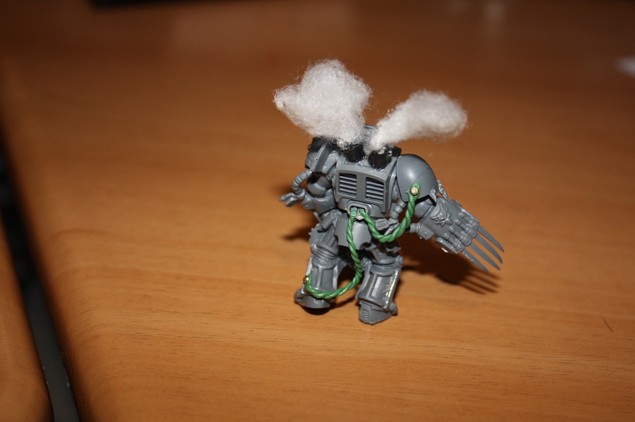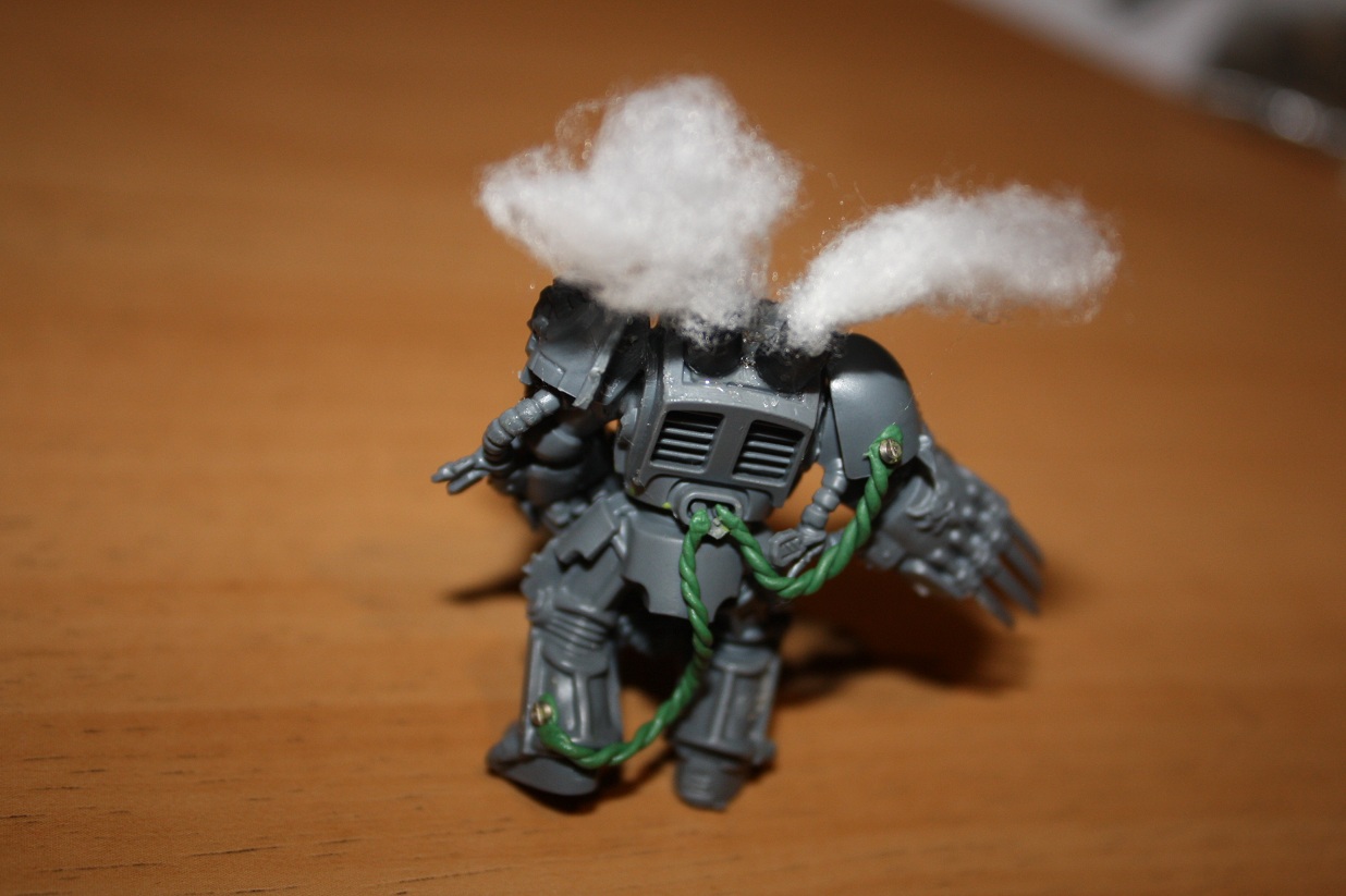 Alright, I went into the city the other day and visited a hobby store to get some ideas. There I came across some miniature buckets that were meant to go on a model ship, and I thought they would work great as a boiler/backpack for my steampunk marines! So I bought a pack, came home and got to work. The bucket itself was just a bit too big, so I chopped it in half and stack it on that way. Then I modelled some wires out of green stuff, stuck a bit of cotton wool on it and well, I'll let the pictures speak for themselves. By the way, this is, again, a trial run, so any criticisms you have, feel free to fill me in so I can improve.