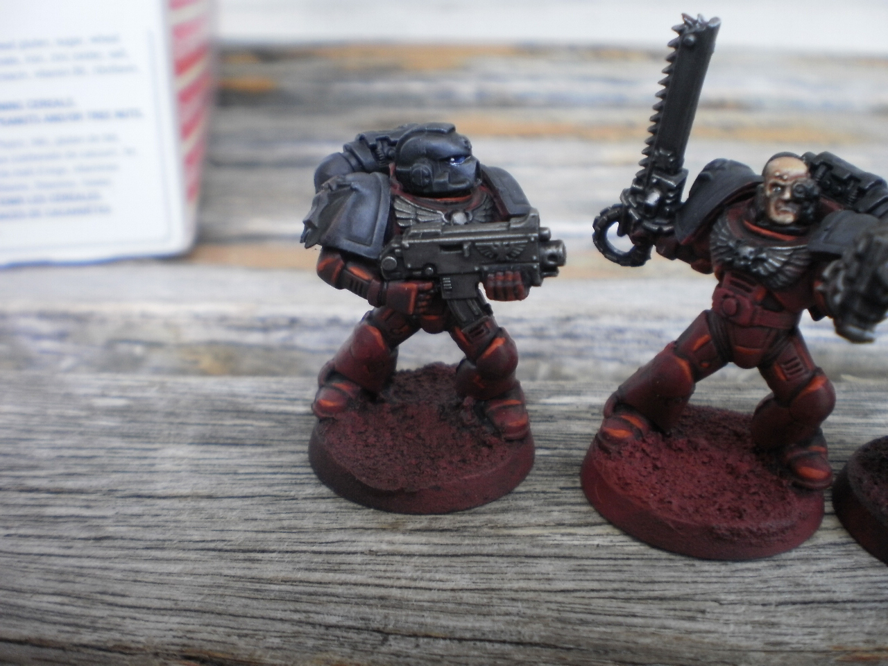 the pads, helmets, backpacks were painted black and then drybrushed with the adeptus battlegrey, then washed with badab black.