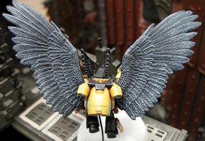 It's a nice looking model but for me it doesn't really suggest Raven Guard. Yes I know wings are appropriate stylistically but the nature aof Raven Guard is stealthy surgical strikes, attacking from the shadows, creeping around taking out enemy supply lines and infrastructure, etc. and I can't see that having enormous wings sticking out of your back are gonna make that very easy.