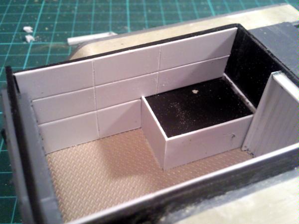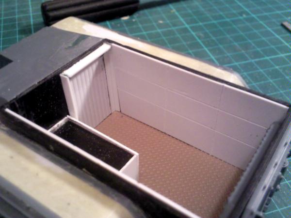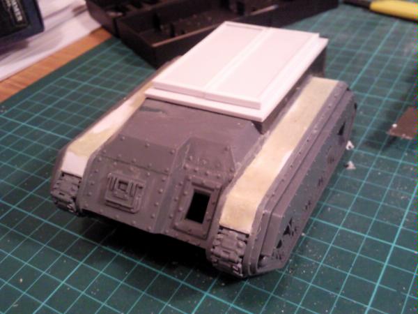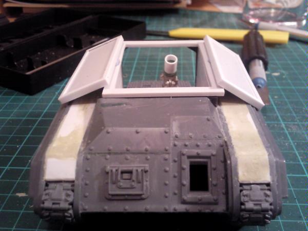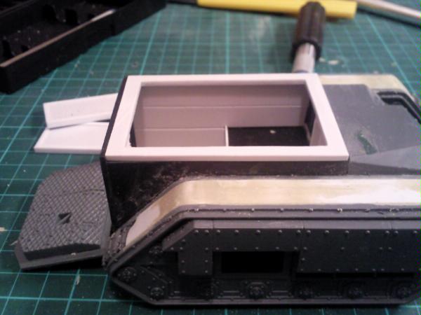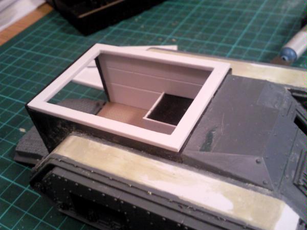 Time for an update! Well after not being able to do much hobby wise for the last month (Parenthood has its downsides believe it or not!), I have been able to spend a couple of nights catching up with my Griffon project and getting a little progress done. First off I have clad the interior of the fighting compartment. Looking at the Forgeworld Medusa in the Modelling Masterclass book really made me fell that my effort was a little plain so I decided to add a little bit of detail to the interior. I have scored a 20mm by 10mm grid into some 0.30 guage plasticard and fitted this to the walls. I also added a door to the driving/command compartment. This was made with some profiled plasticard and some lengths of plastrut angle to form the frame. All of this will break up the walls a little and hopefully catch the light when painted and provide a little texture. This done I returned my attention to the trackguards. As per my previous post these were formed by gluing plasticard in the track channel. Originally I envisaged that the 0.30 guage strips that I had fitted were the perfect thickness to sit on the wheels and be flush with the surface. Unfortunately either/both the thickness wasn't correct or the plastic was too thin and has not spanned between the wheels very well and sagged a little. I have corrected this with a bit of filling (using a PVA glue and Milliput mix - PVa helps sticl to the glossy plasticard) and sanded this smooth. I have also started on the roof hatch and installed the hatch frame. I'm not too keen on the lip at the front of the fighting compartment, but I can't really think of what to do with it at the moment? Hopefully it will be covered a little when the conmmanders hatch in installed. Finally I have made a couple of doors for the top hatch. I made these with 1mm plasticard and some 2mm C section plastrut. I am planning to mount them splayed completely open rather than vertical (ala the Trojan from my previous post for example) as this will show off the interior a little bit more. I have bluetac'd them inplace to show how they would naturally fall if open, plus an example of how they will sit if closed (not that they will be openable, but I like to think about these things!). Sorry about the line across the picture, bloody camera phones! Well thats me for now. Next up I will be doing the crew and details which I will stick to the hull. I am also planning to start on the painting, which should also give me a opportunity to try out my new airbrush (woot for birthdays and generous partners  ).