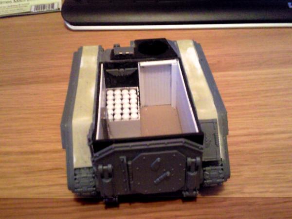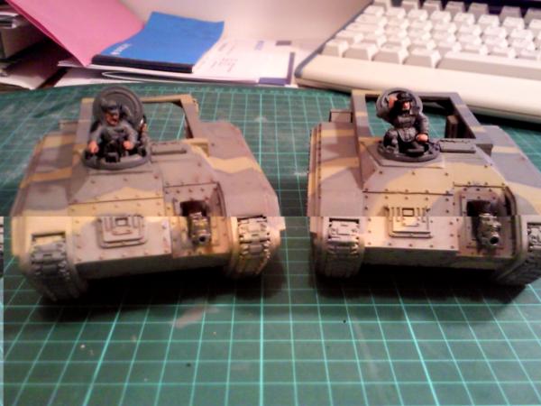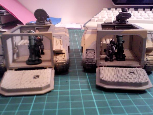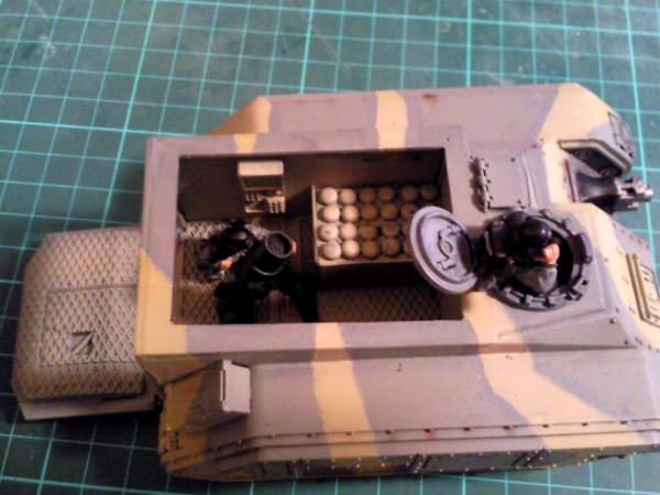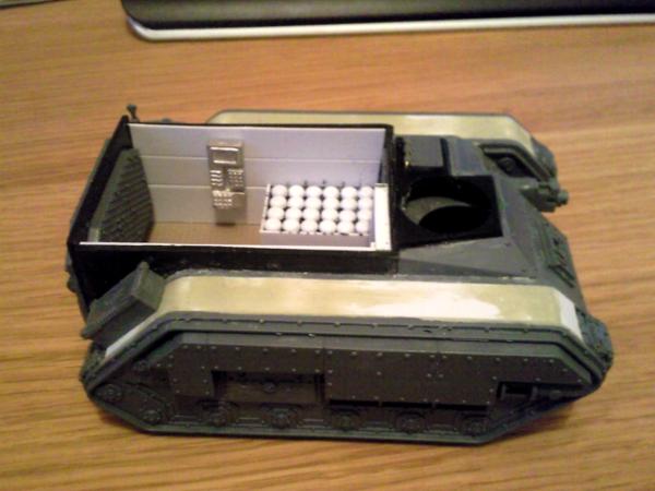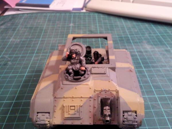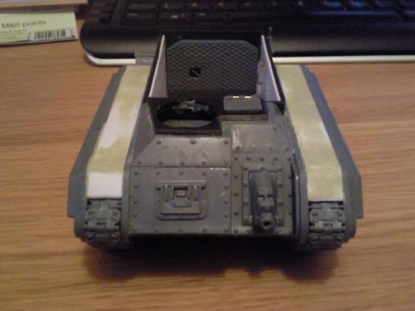 @Reccius - borchacho? The mortars are the basic mortar from the original GW mortar teams from the 2nd edition range of metal Imperial Guard models. I extended the barrels with some plastrut tube and made a band around them with Green Stuff (all shown on page 1). The basic mortar is still available from GW's collectors range I believe as part of the various mortar teams (except for the Cadian one?) they are still selling (but not on its own). @alarmingrick - not sure exactly what you mean by bigger? The rear compartment is suprisingly limited especially once I put a few things in there so I am not sure how much bigger I could have been without leaving no room for the crewman. I wasn't that keen on the demolisher sized weapons that some have posted here and thought that the metal one fitted the bill perfectly when compared to the plastic one that you get with the Cadian Heavy Weapons teams. I did do a longer one (see page 1) but it was just too high for the crew to "use".