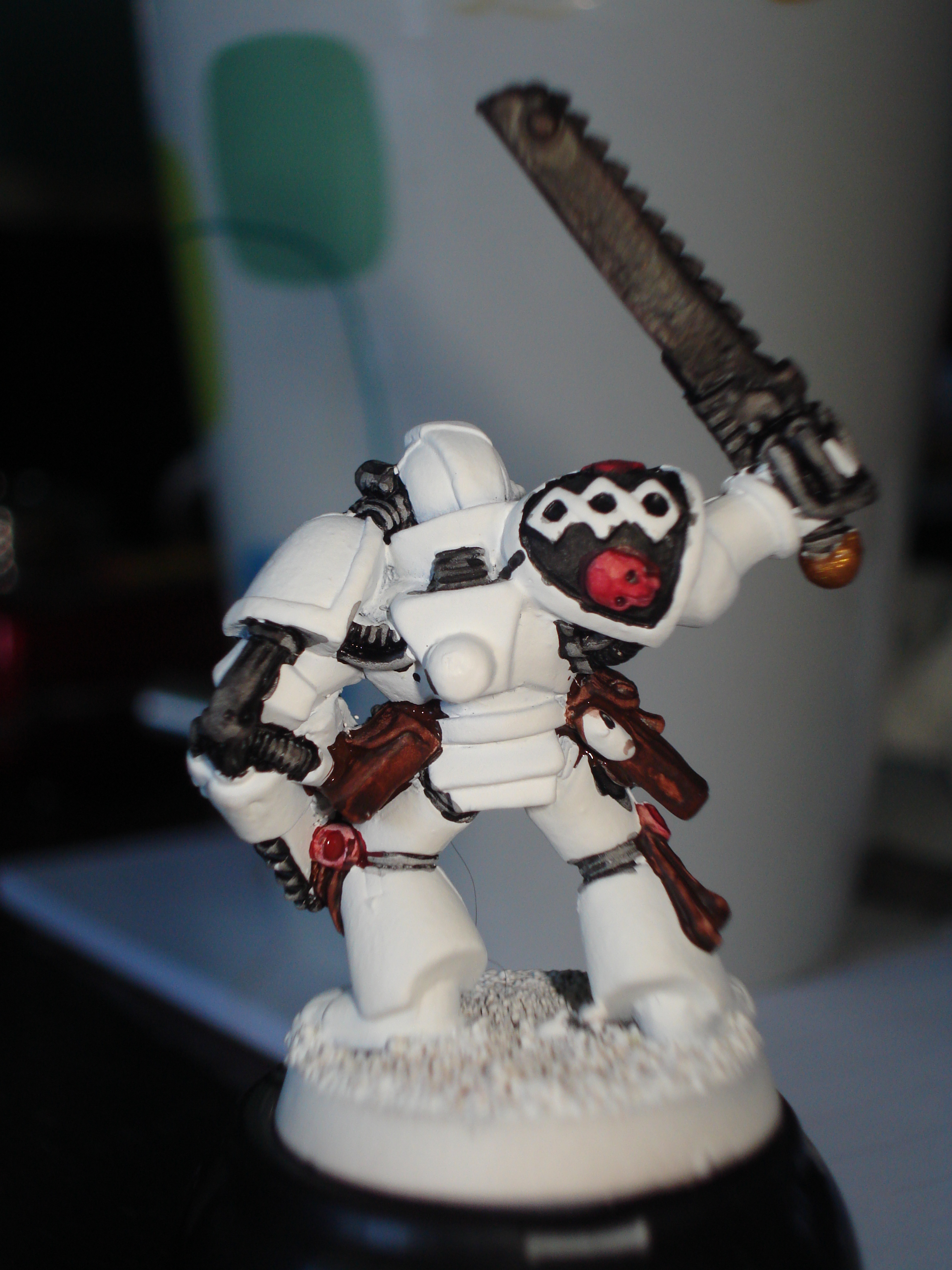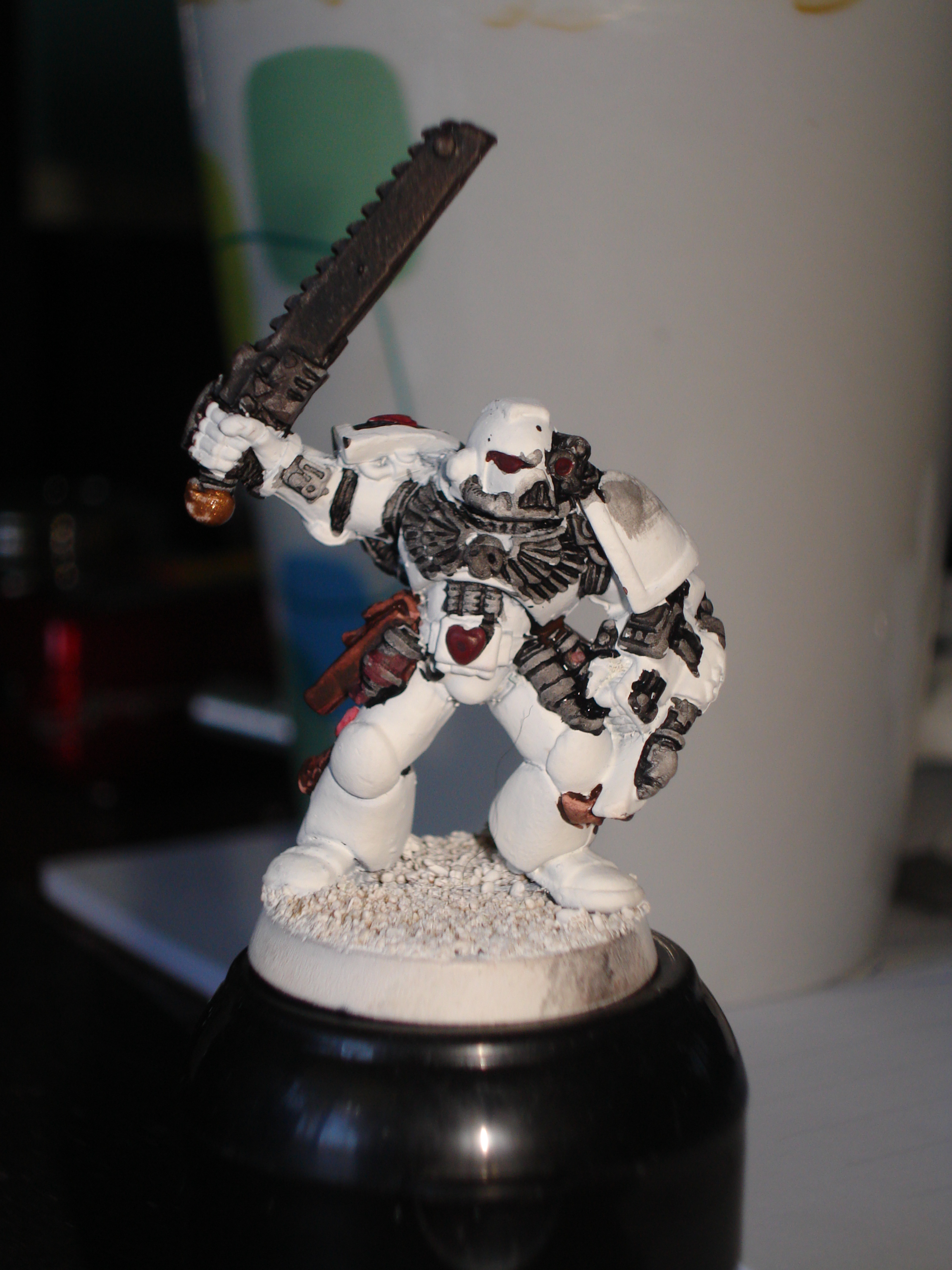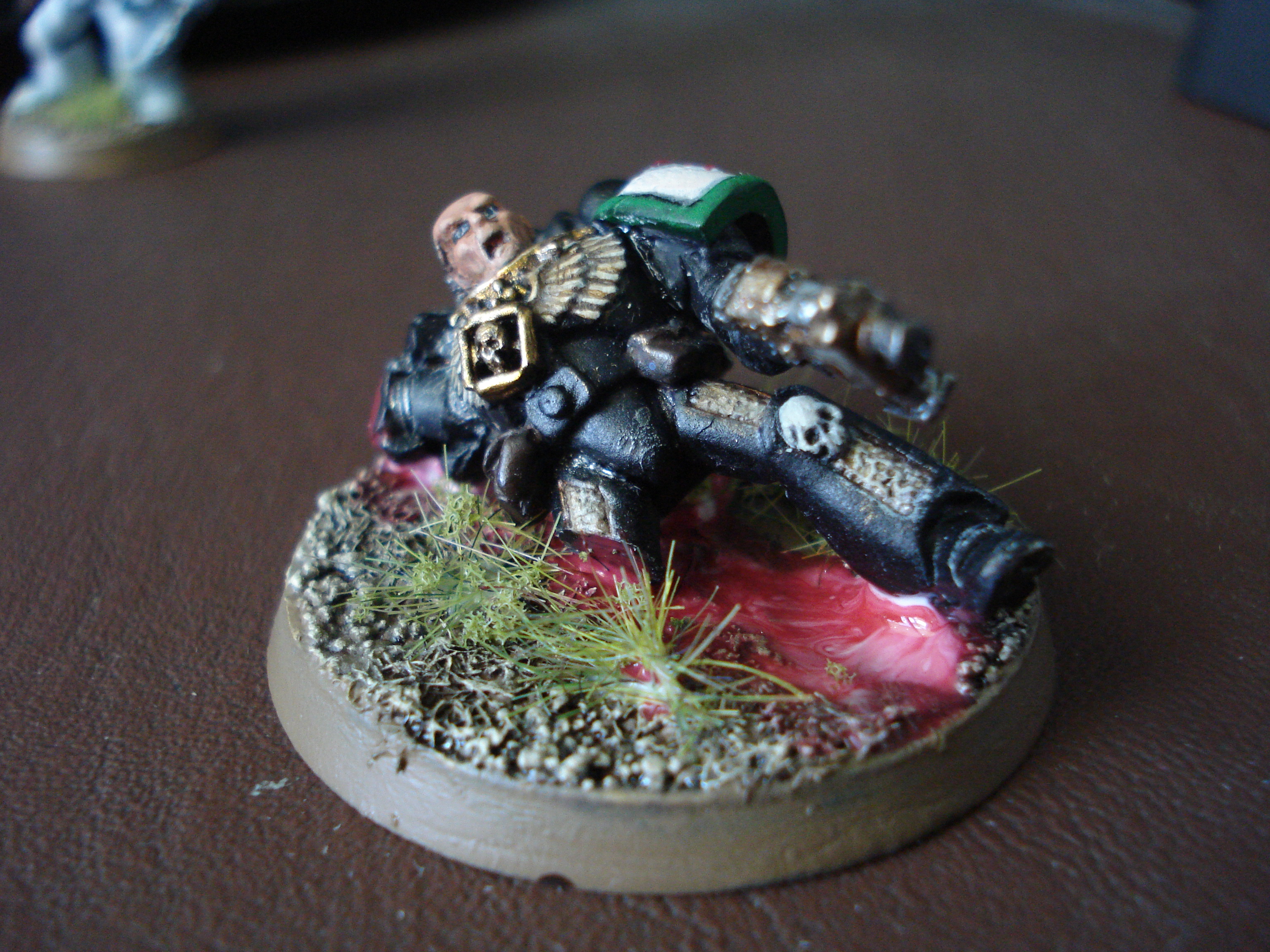 Here's todays efforts. I've tried to tidy up themodel a bit, and i've given it the final hightlight, started the base and nearly finished the chainsword. whilst waiting for the preverbial paint to dry, i re-did the helmet of an old seargent to practise my white.