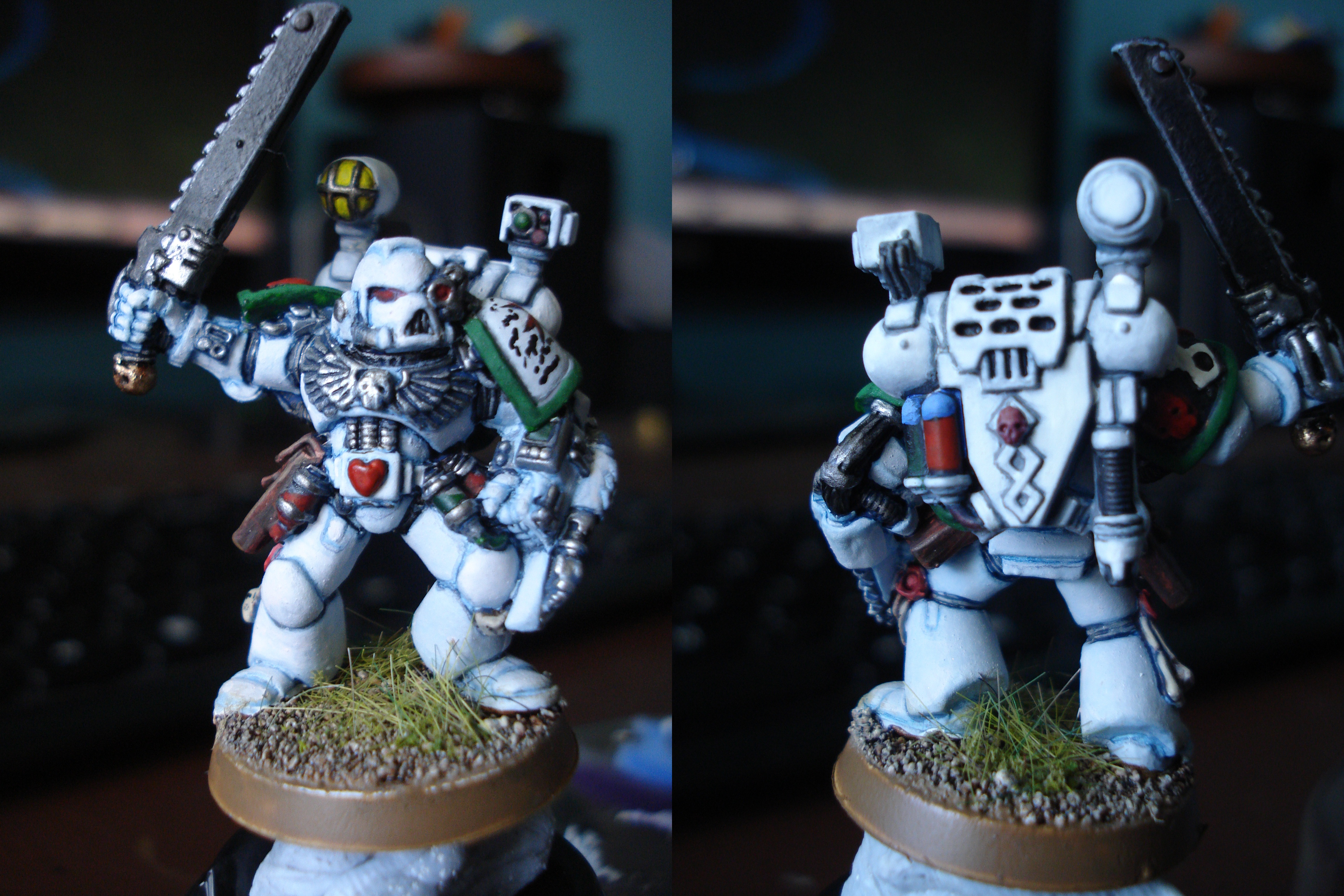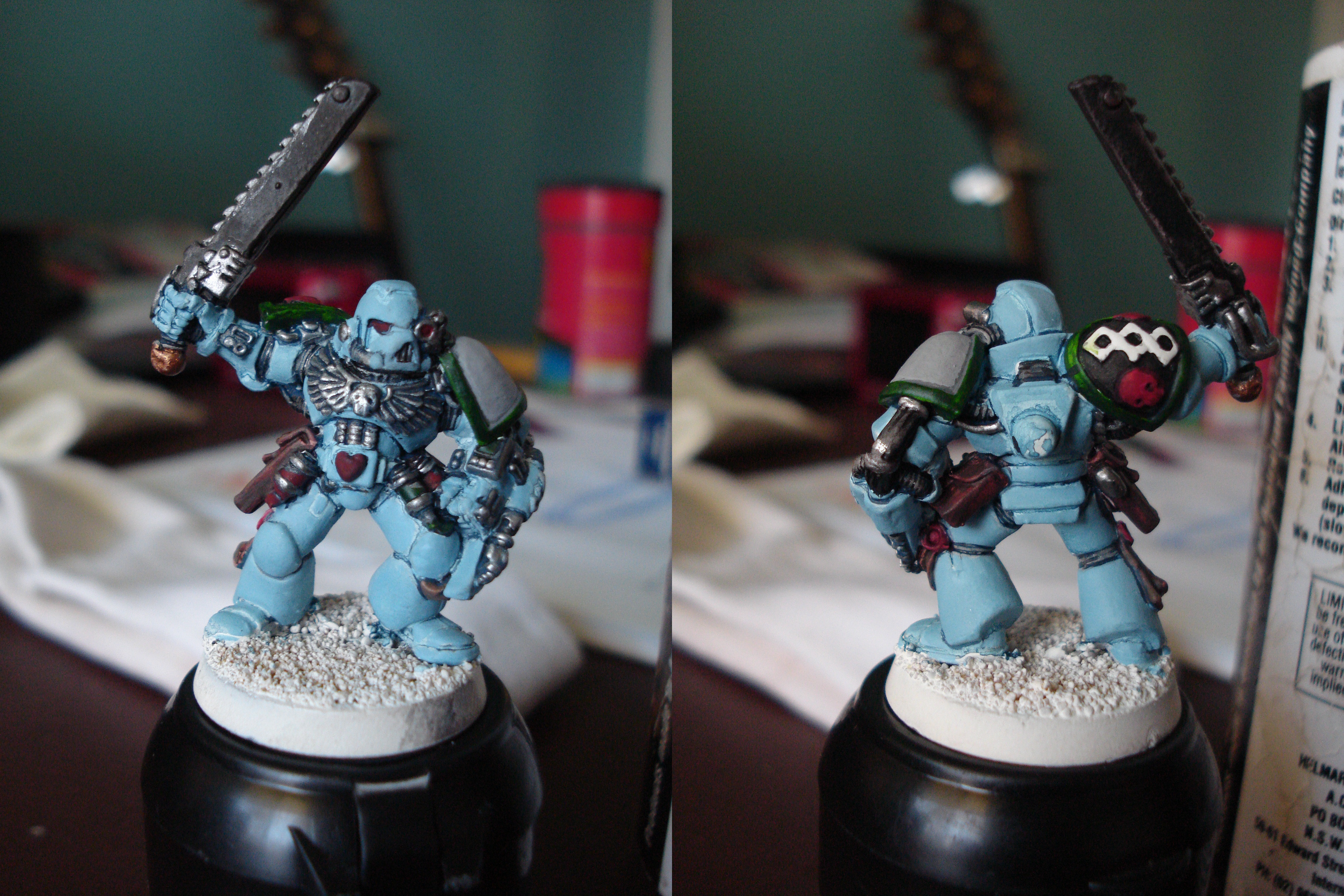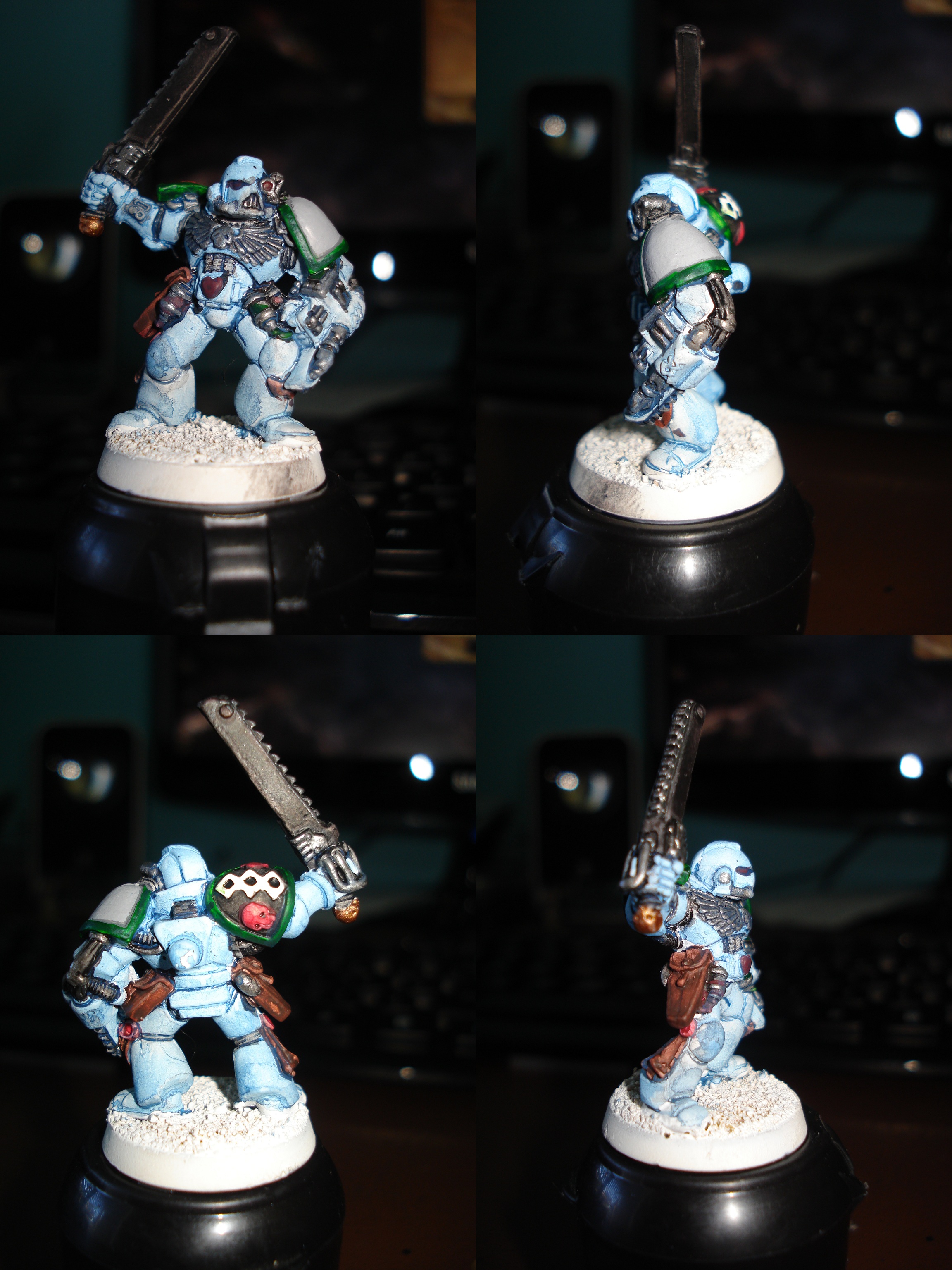 Here's todays efforts. I've tried to tidy up themodel a bit, and i've given it the final hightlight, started the base and nearly finished the chainsword. whilst waiting for the preverbial paint to dry, i re-did the helmet of an old seargent to practise my white.