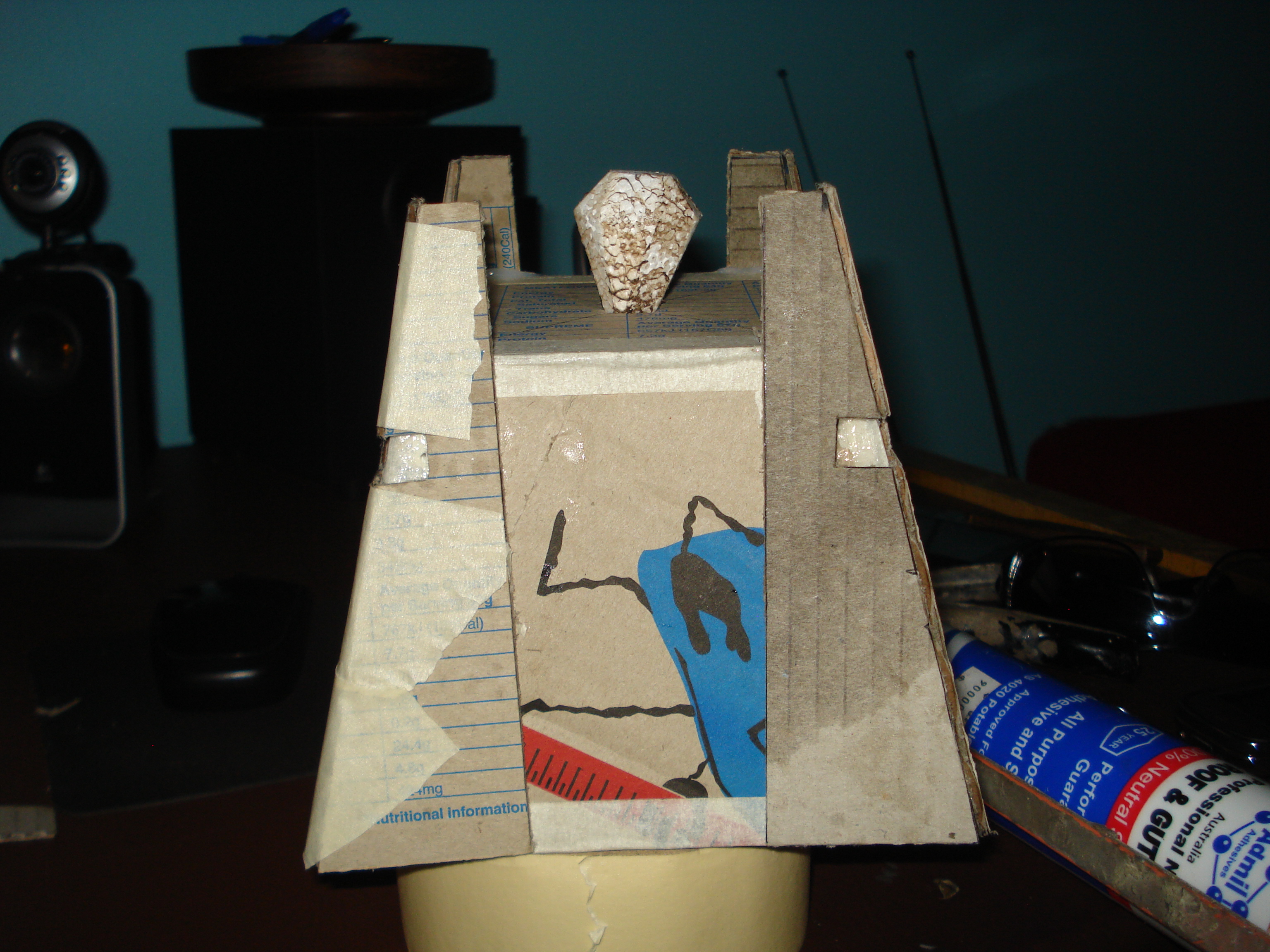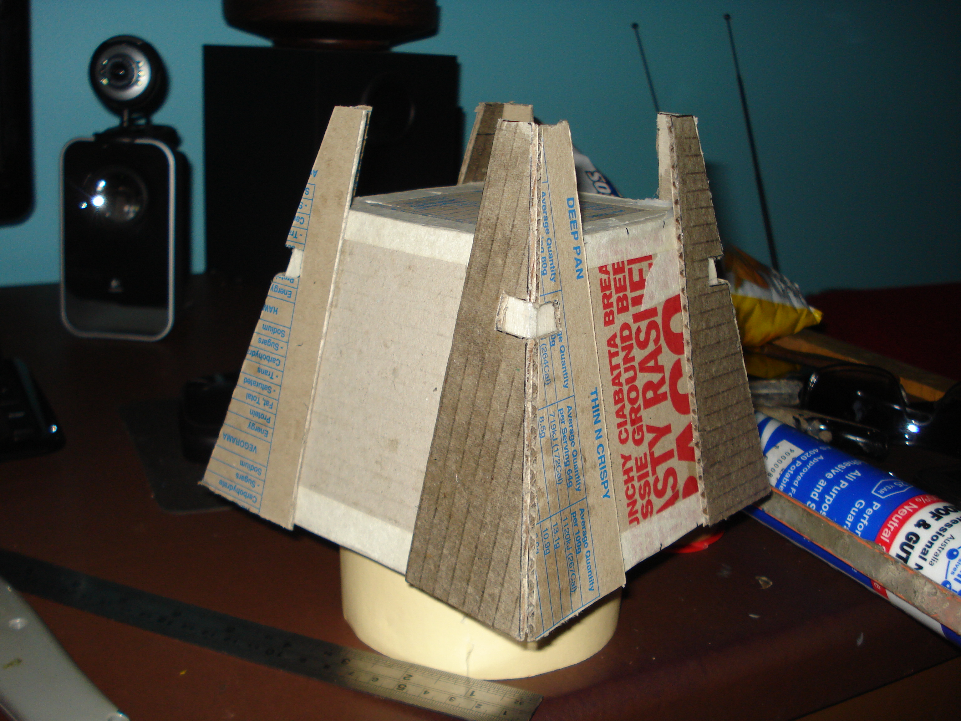i've started to get a friend more into the game, and he's loving the theme of the Necrons. I've got a lot of small (500 point) armies, cause i love to mix and match. Just after Xmas we had a 5x5 game between the two of us, where we played orc, necron, marines, chaos and nids, 500 points a piece. nids held the objective, the rest were trying to take it. at the end of it the necrons were standing proud victors, and it got us talking about having a 1k army, nids vs necrons (i love my nids). for a challenge, he suggested we proxy a monolith, but after some thought, i decided to make one. it's pretty basic, but with some more layers of cardboard and a slap of paint, i think it could be convincing.