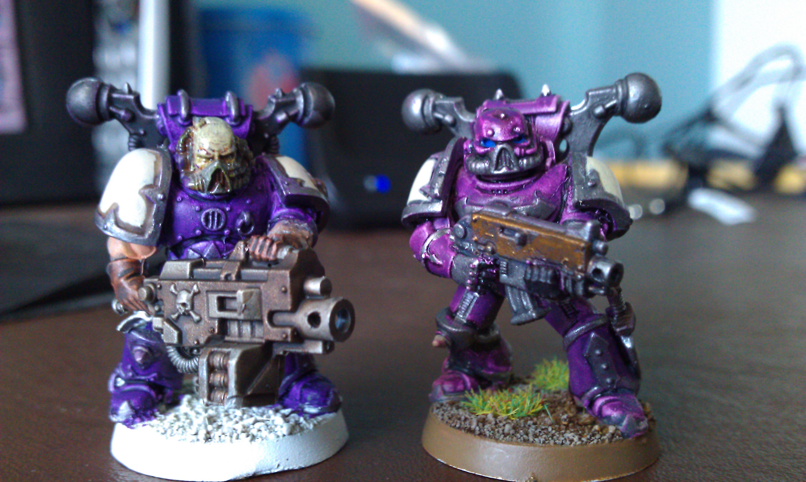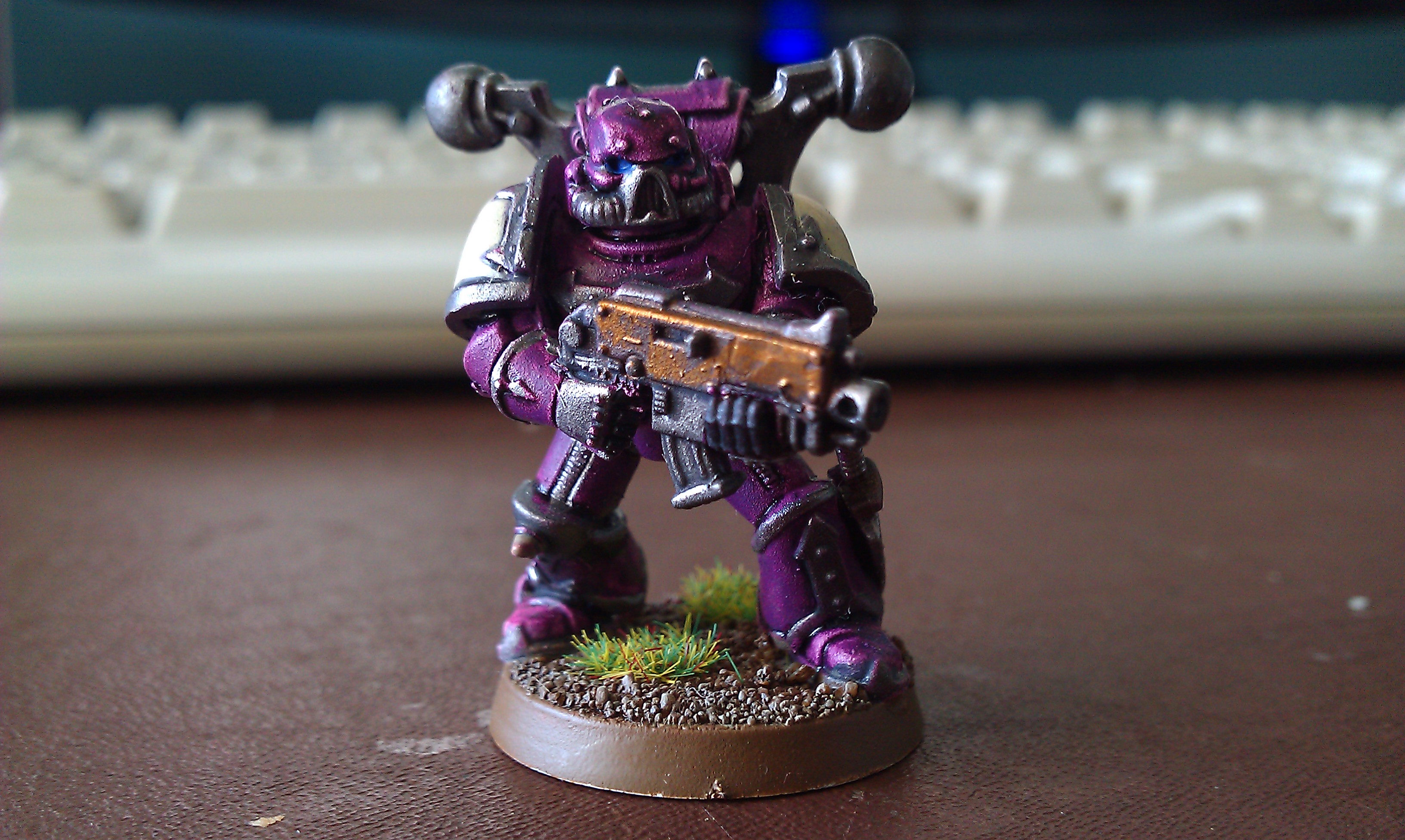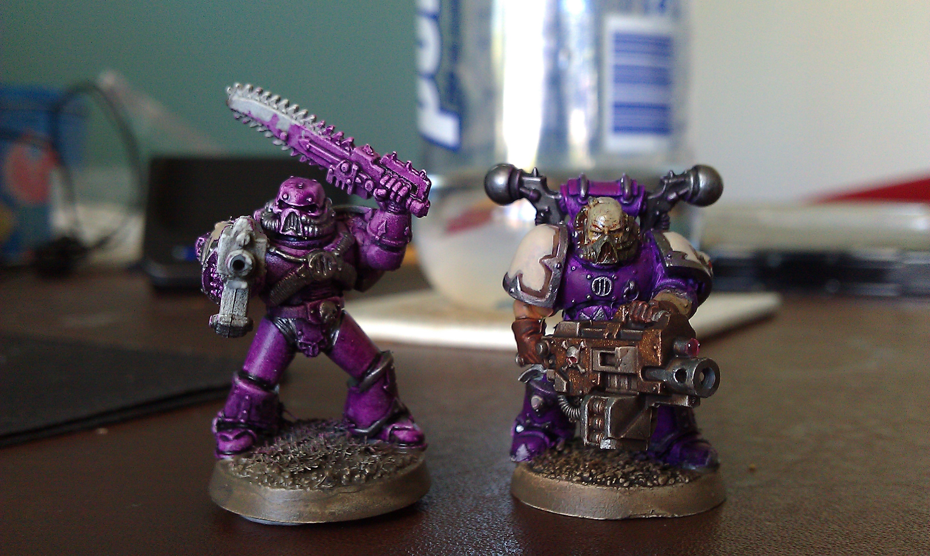 Next up - i've finally decided on a scheme for my chaos dudes - see the test model below. i need to come up with a chapter icon though, but i can't decide, does anyone know of any good source material? i'm thinking they'll be undivided for now (despite the slannesh purple).