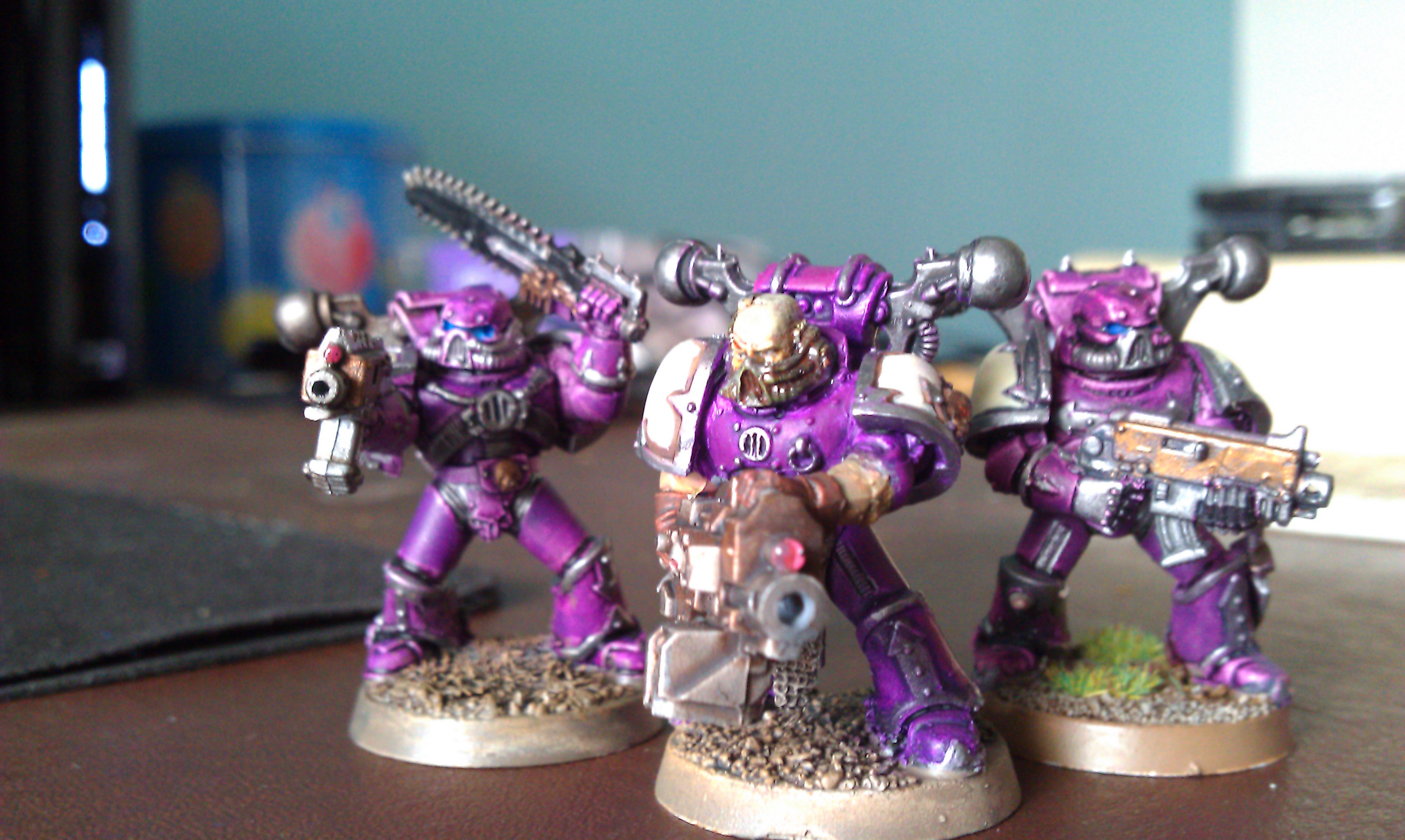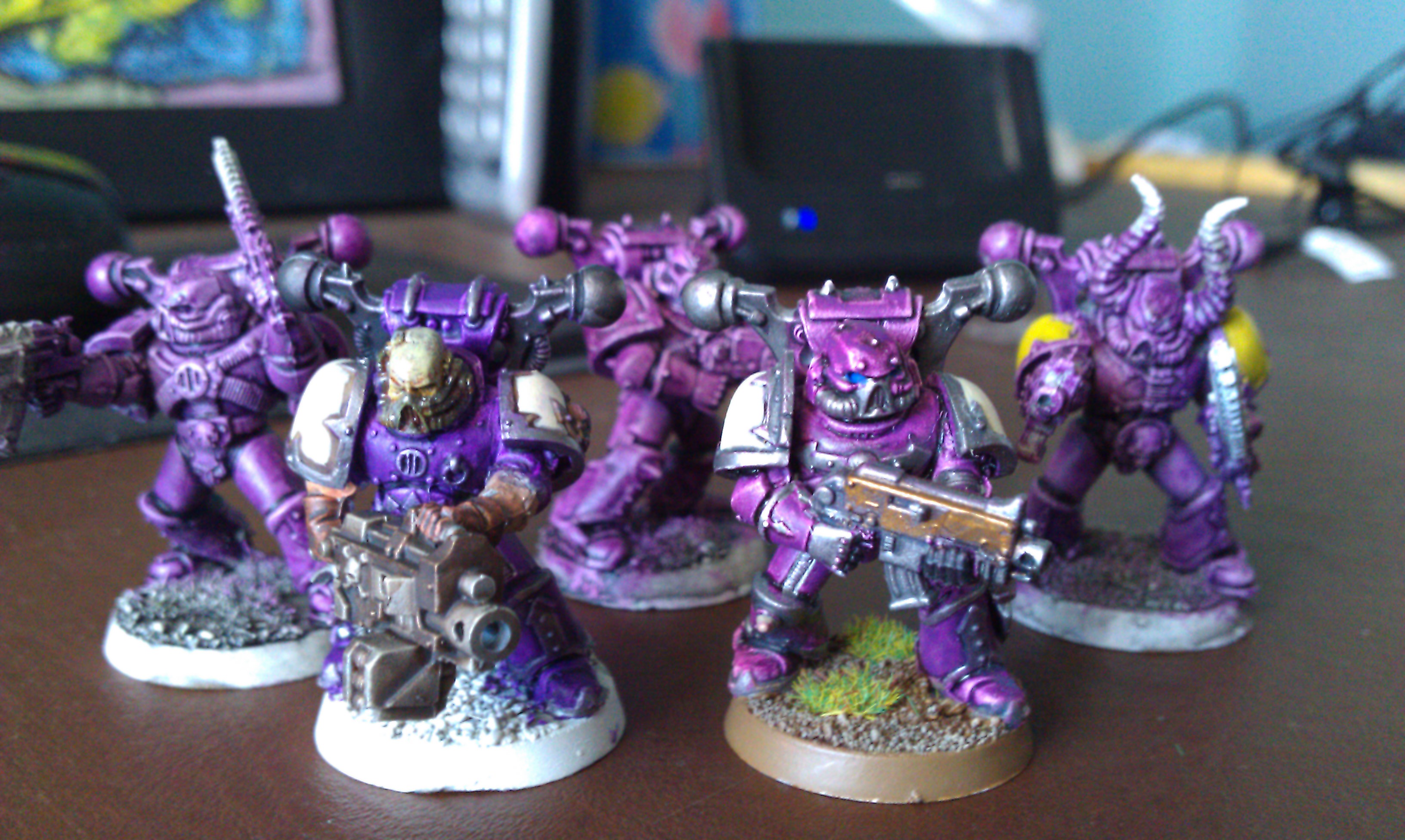 The grey knights look great. They make a regular marine player jealous. But that chaos fellow, I don't know if it's just the photo, but he looks like he's covered in glitter. Maybe it looks cool on the table top, but the sparkly look is not good up close.