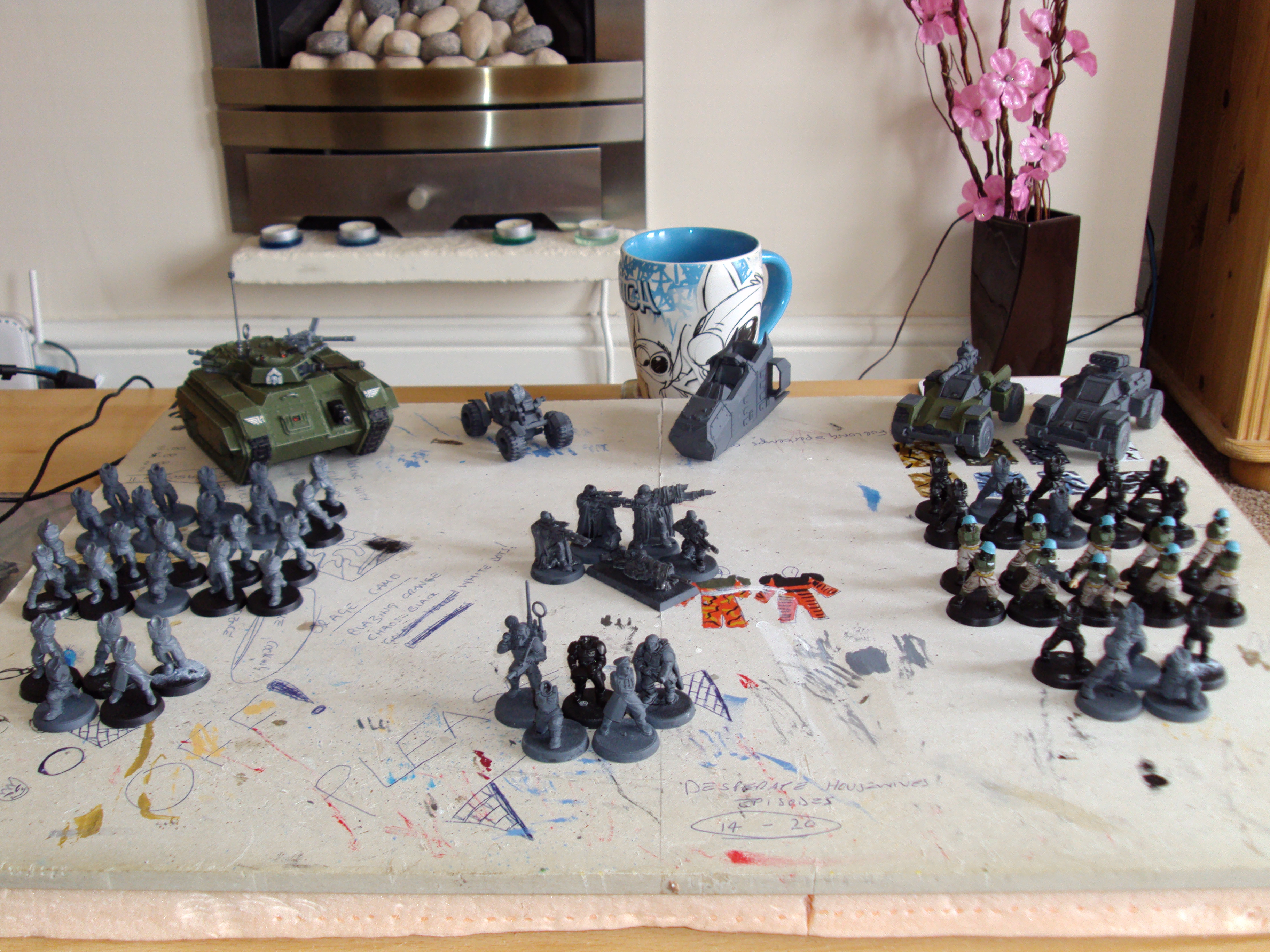 As far as tanks and other military hardware painted white in the U.N way, is completely off the table! Reasons: 1) White is a W**K colour to try and paint perfect. Especially on such a large canvass! 2) These would stand out more than the little blue helmets. 3) See the 2 above, then any questions that follow consult again the first 2! On a serious note though, I do like the idea - it is unique and, at this time I think I will stick with blue helmets! Sorry guys its the way I roll  That said however I will probably get to painting the 40th helmet and think 'ah crap blue is bad'  And then consult you guys again for colour input lol at which point you all say ''bugger off'' and ''we told you so''. HAPPY DAYS! Also I've attached a pic just to keep the picture people happy  It's of the regiment that is assembled so far. Still to assemble and put on the table is: 1x Cadian Command squad box - I have no clue what I will do with these at the mo. (IDEA's!) 1x Catachan Command squad box - I have no clue what I will do with these at the mo. (IDEA's!) 1x Cadian Shock Troops box - possibly acting as Vets! 2x Catachan Jungle Fighters box 1x Hellhound 1x Basilisk 1x Leman Russ 2x Manticore/Deathstrike Thats it I think at the moment. Thanks for reading. Regards