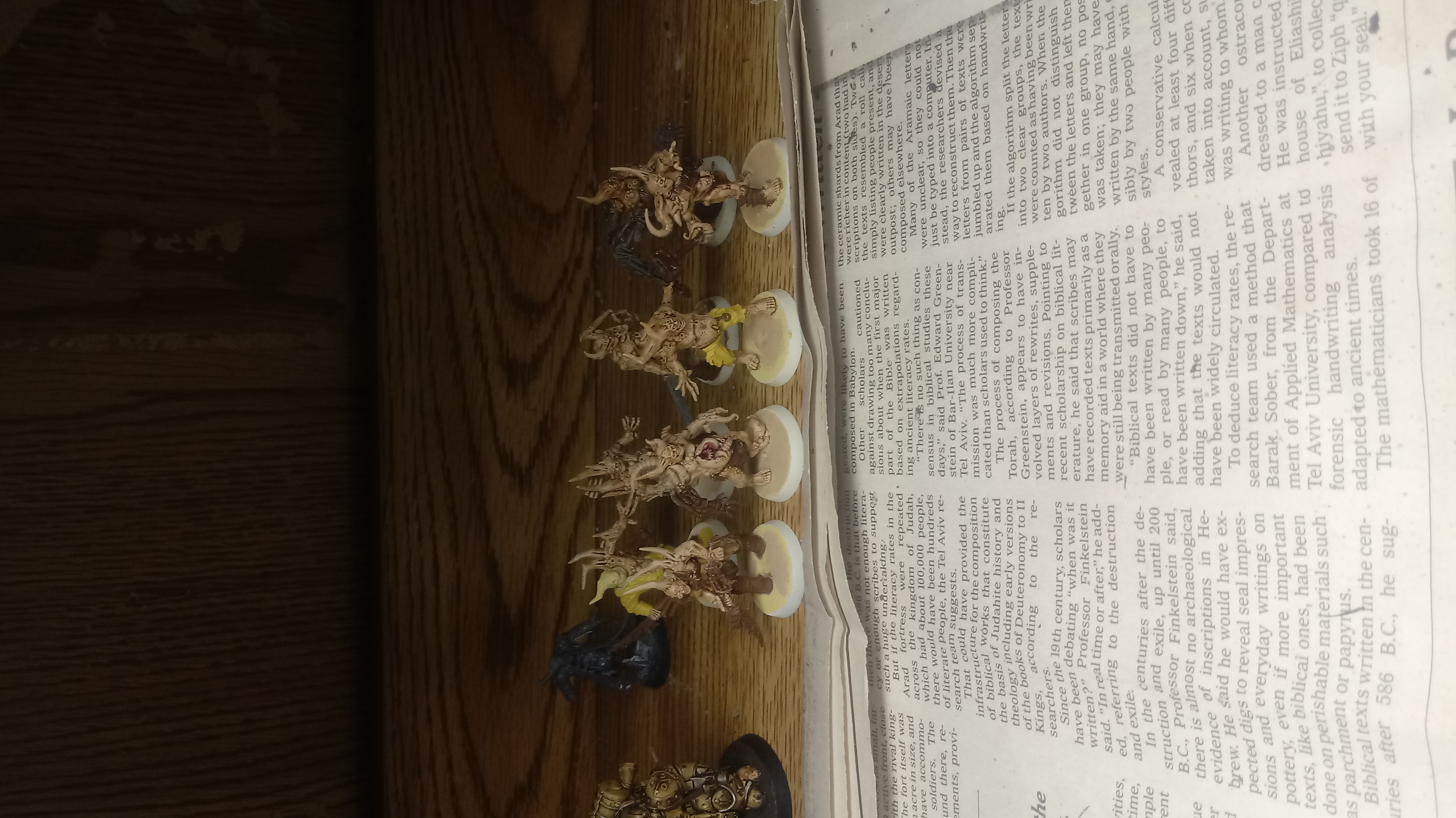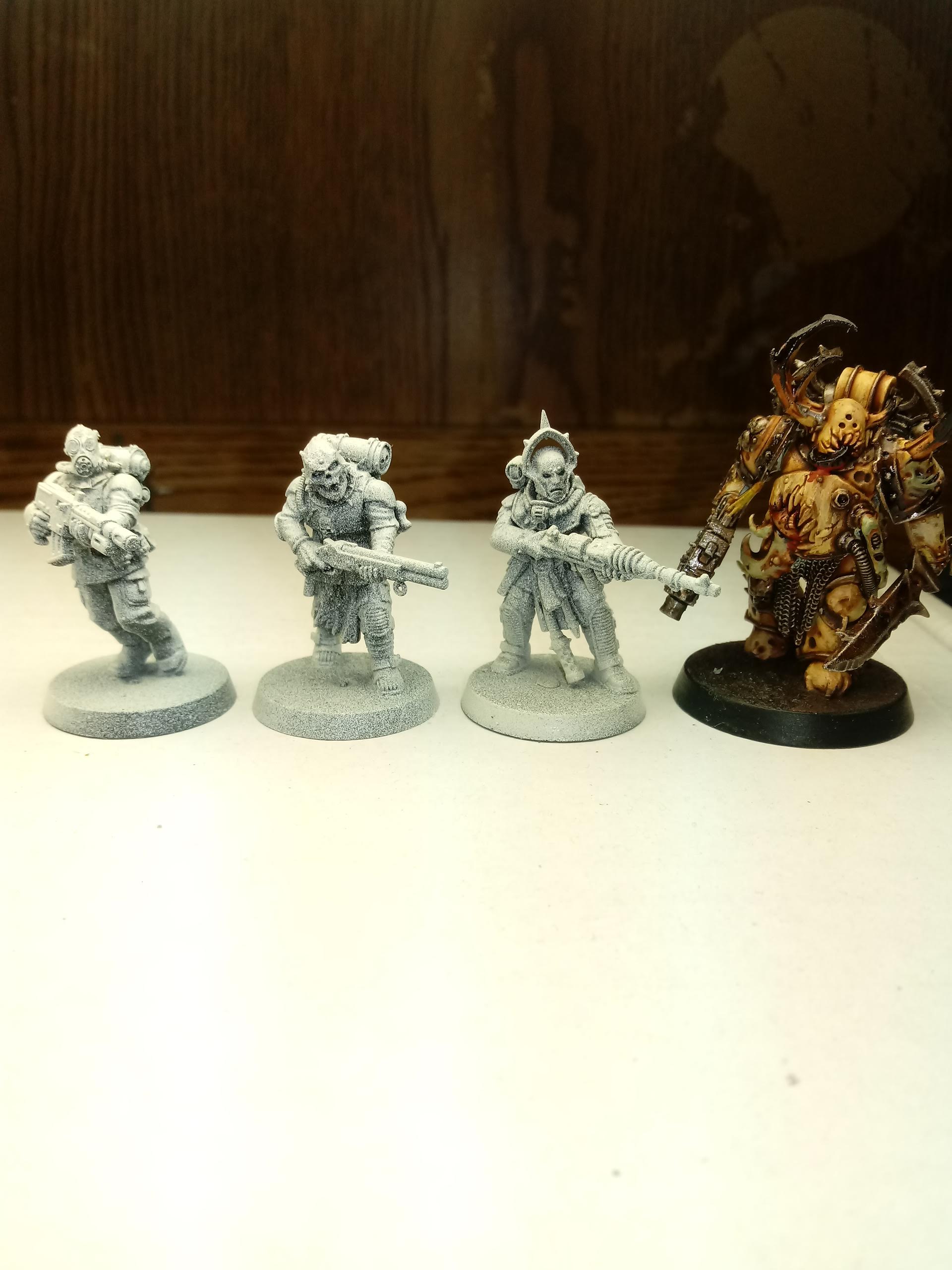 Included in the photo (in respective order), are a Vraksian Renegade Militiaman, a Vraksian Enforcer, a prototype of the Disciples of Xaphan, and a Plague Marine which will represent the Tainted warband.