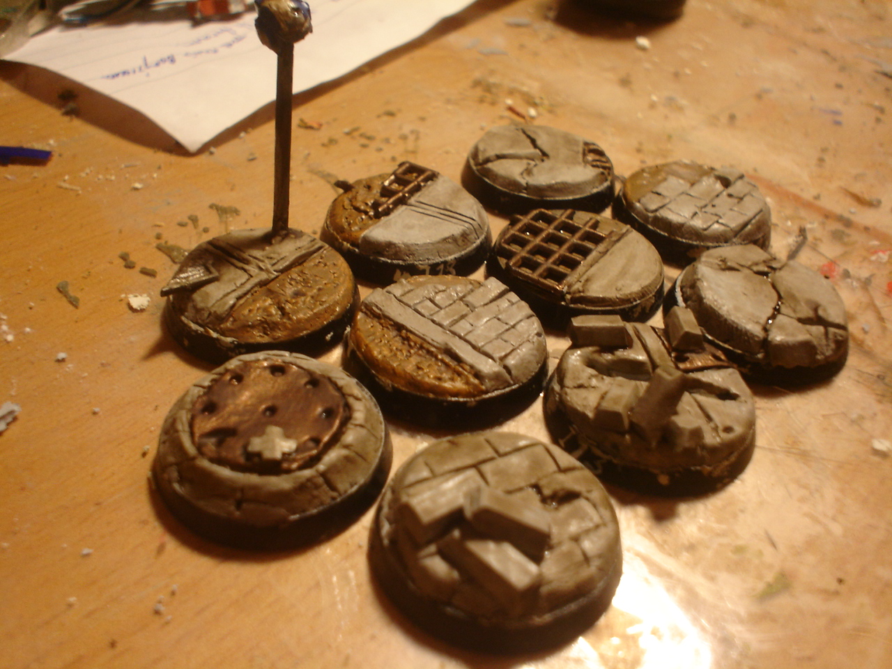 Wow, excellent bases and a very good theme. Old ruined cities provide lots of good chances to really run away with basing If you want more even cobbles, use the sharp edge of a ruler, or the back of an eating knife to score the lines. Also, you can have fun pressing the clay into different objects to give added texture, such as wood, bark, skin,etc.