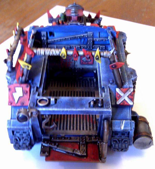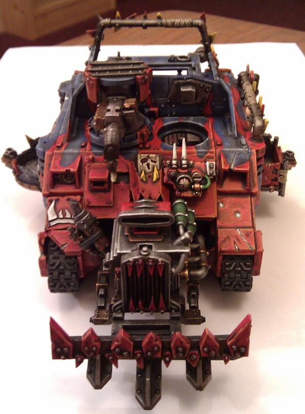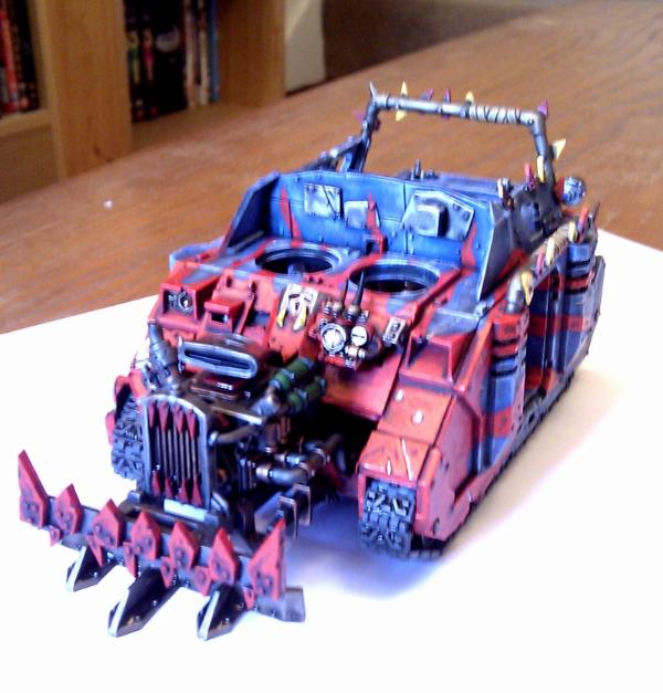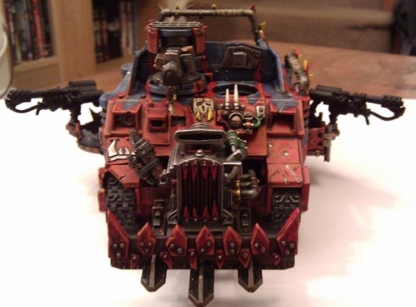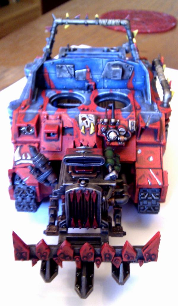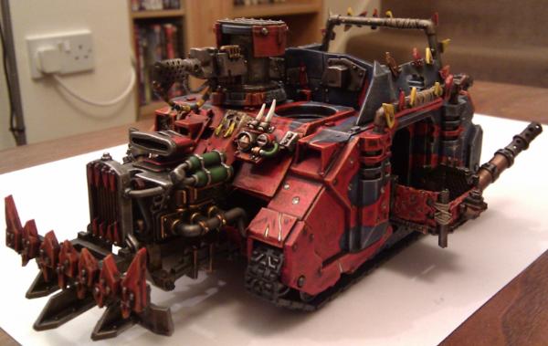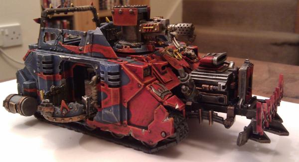 Nearly done on the Hull now. I've finished the first highlight of the flames, they're really bold now. I also found an bonus side effect of using GW Blood red: It goes thick and clumpy very easily and doesn't have the best covering abilities. While this would probably be quite frustrating, and require many thin coats if I were doing a pristine BA Rhino, it does a great job of looking like it's been haphazardly slapped on by an ork over the original Rhino colours. All the Handrails have been painted, and I've put another black wash over the engine, and will finish with more highlights to make it look oily and well used. Then add a couple of exhausts and the main hull will be done. Which is good, as pay day has been and gone, and I've just taken delivery of some Forge World Skorchas and some Grot Sponsons. I can get to work on these when the hull is done.