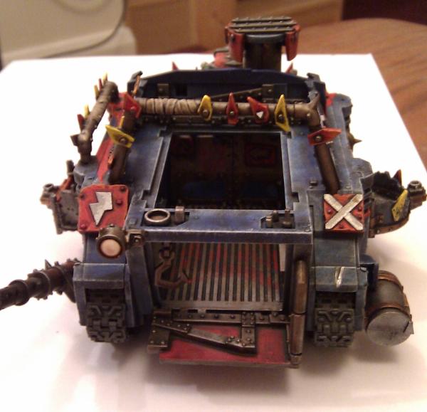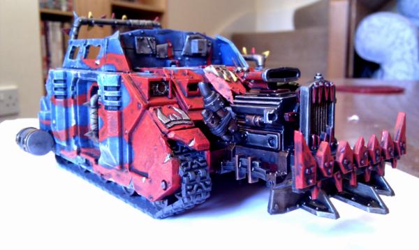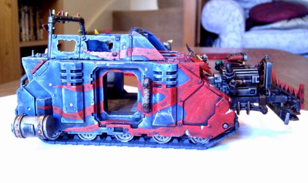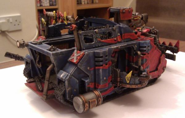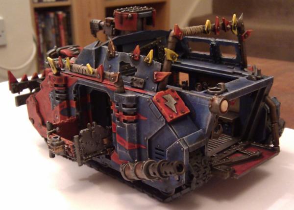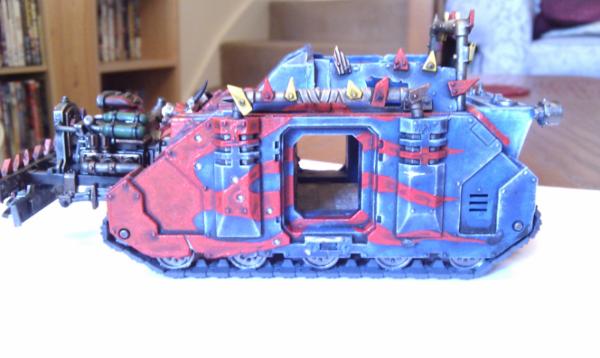 I think that the blue is looking great! Maybe if you feel up to doing another orkified rhino, it could be a BA rino with blue flames