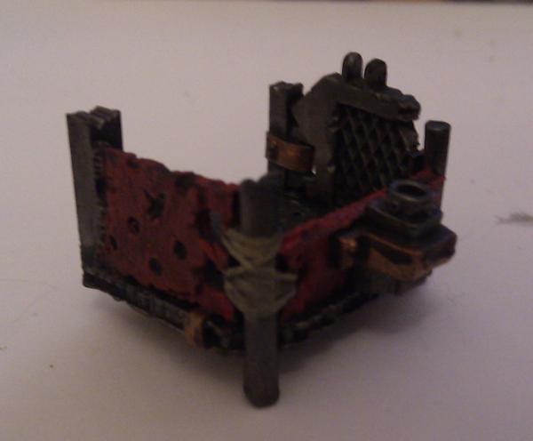 The Skorcha turret was made earlier on, but I had to do some slight remodelling. It was made from a heavy bolter turret from a Leman Russ, with an ork plate cut from a piece of the trukk, something unidentifiable from the Rhino sprue, a very carefully cut off barrel and pipes from a Shoota/Skorcha combi weapon from a Nobs spue and the footplate of the Trukk's turret on top of it.