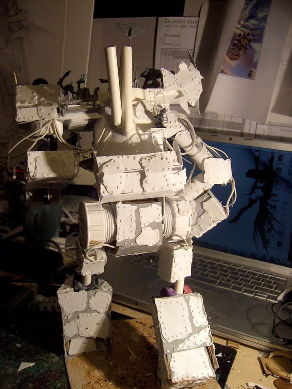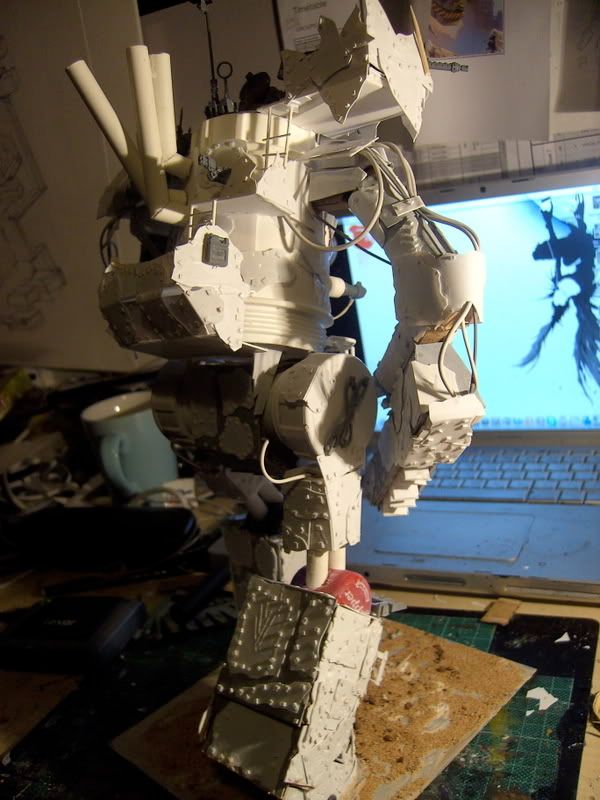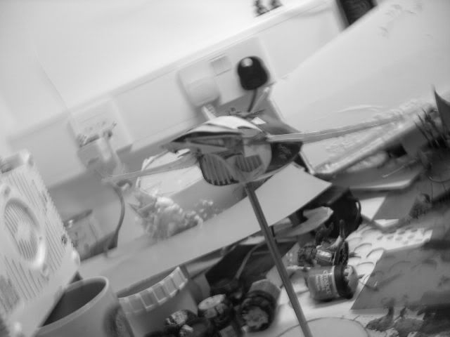 Some footnotes on this design, the wings need to be made larger and into a more fitting design to go with the artwork, though i'm not fussed at this stage because the chassis is the biggest design challange, namely the fuselage and the rear section. those engines are pen lids, however i'm waiting on my order of plasticard to progress further with them. i am quite happy with the curve on the section though, so once i get the aforementioned order i will be going over it and covering those airports to some degree (to fit with the eldar way of doing those things).
