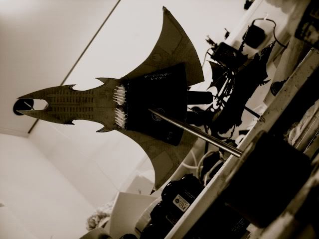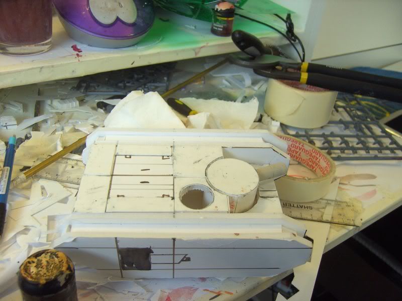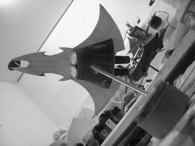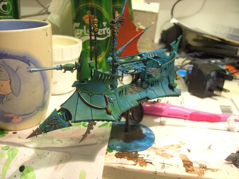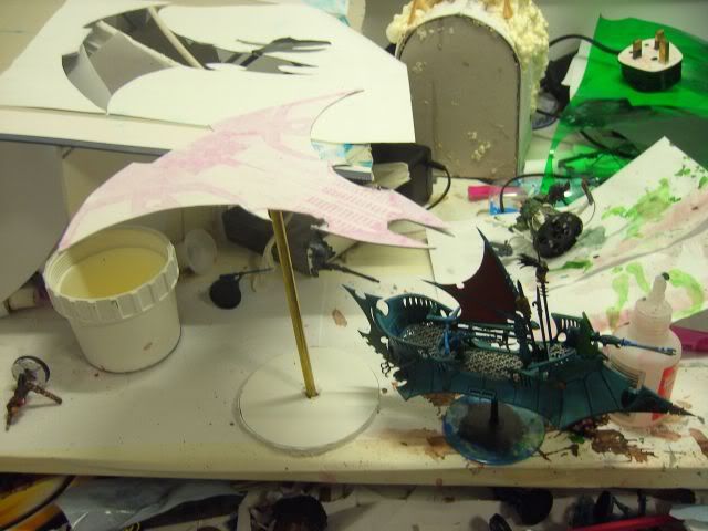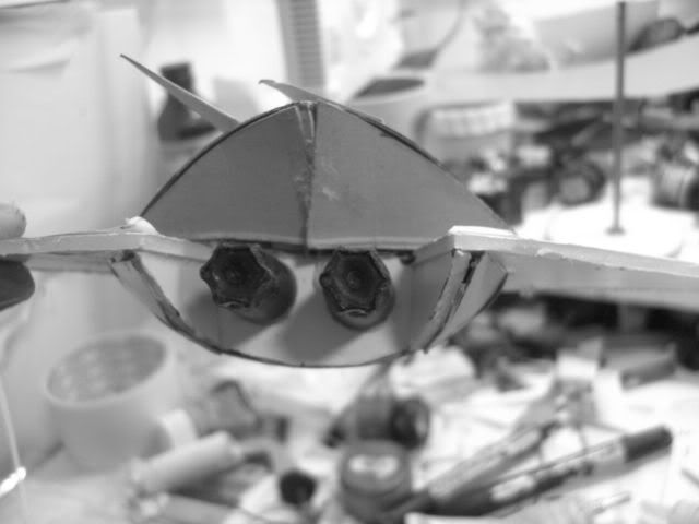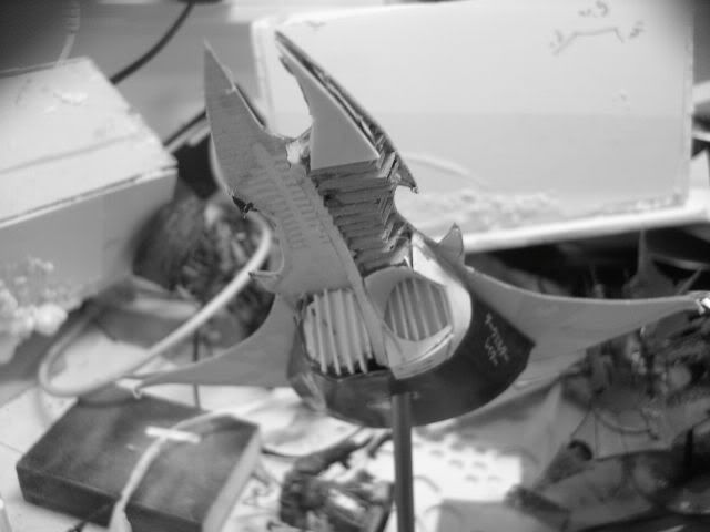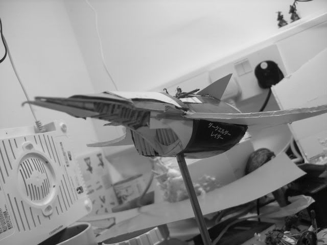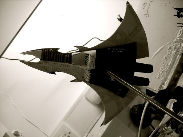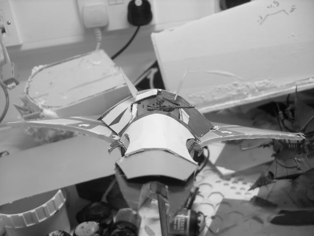 there are no cut out sections yet to give it that DE feel, nor are there the spikes. the forward nose cone will be done in plasticard last, as it had to fit over the ribbing and still be capable of hosting the twin linked cannons. the lances will either go on the under section or possibly on the wings, though that is an issue for later on.