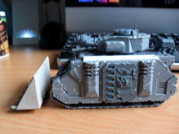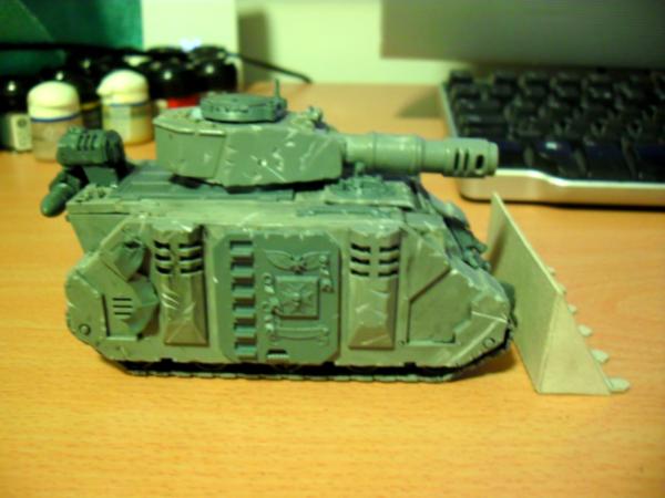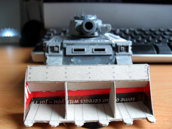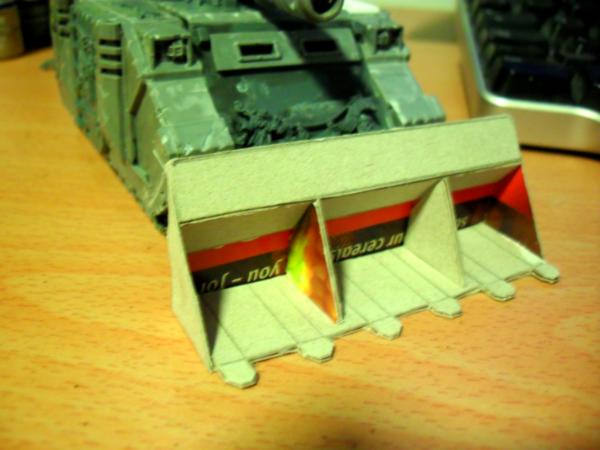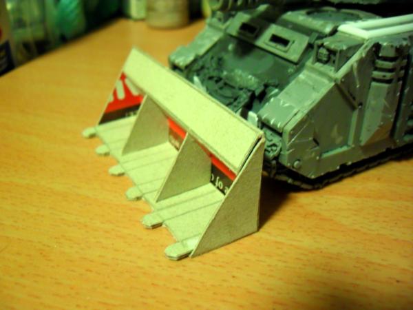Haha, yes I read about your underhanded tricks, trying to cause casualties before the battle, shame on you Gits  . Glad you have managed to fix it. History wise do you mean in the history of the Vindi or the history of Siege warfare. Rush Shields are historically accurate, both for the protection of archers and engineers. So I'm guessing the Siege shield on the Vindi is an evolution of that. The moveable turret is more designed from a modelling and fluff aspect rather than a gaming aspect. Rules wise it could easily follow the norm. Armour wise the Vindi has F13 S11 R10, if you check out the photos for mine I actually have the LR doors on, with a view to adding ablative armour similar to the MkI variety. Automatically Appended Next Post: Right as promised here is the mock up of the dozer. I think its gone alright consider this is another first.   I'll probably add addition vertical struts. I was looking to achieve a repressor shield and I think this will look very close when the detailing is done. How about you guys what do you think about the design? BTW thanks again for all the comments, I do read them all and take on board what you are all say.