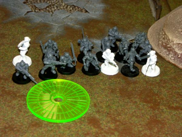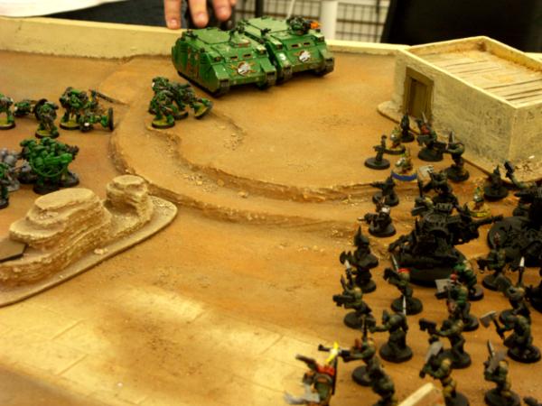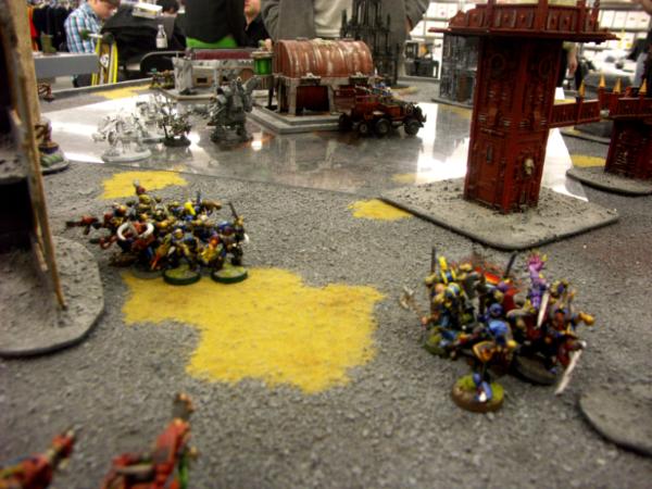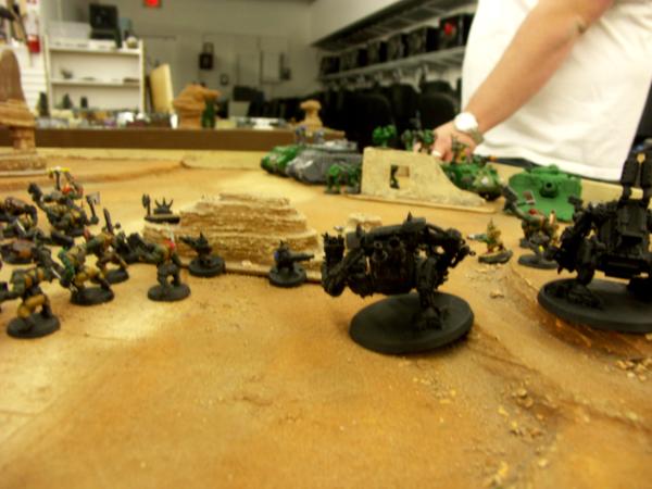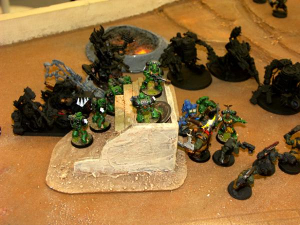 A merry mob of Orks marching towards the 2nd Salamander player in the group.