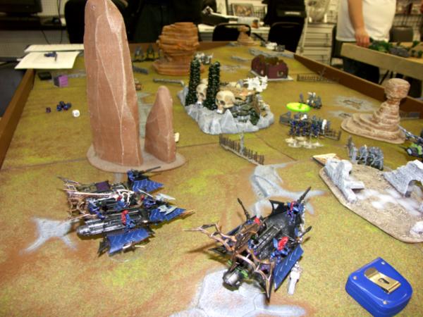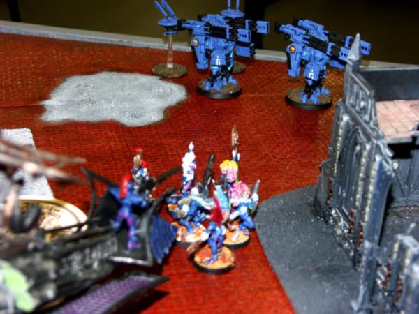 On the right flank my Ravagers tear open the Devilfish and send the Firewarriors out into the horrible cold of being able to be targeted. The Venom does a number on them while another Ravager pops one of the Gun Drones (as I recall the Tau broke, but the Drones held).