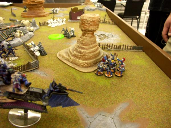 He moves up one squad of men to rapid fire at the Wyches, but thanks to FNP the Wyches take only moderate casualties (two, if I recall correctly). Being fearless now I don’t even need to make the leadership check for 25% casualties – awesome! (though I do dislike having fearless on a dedicated h2h unit) He does now contest the objective with me (though honestly I’d forgotten my Wyches were a troop slot and was frankly at this stage of the battle trying to figure out why I’d only fielded two troop options – derpy-da-doo)