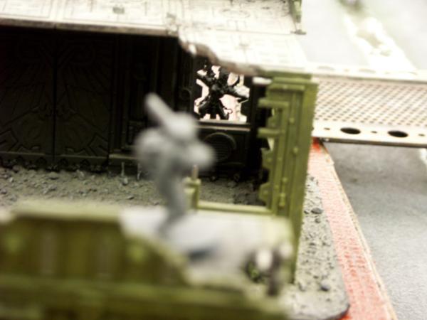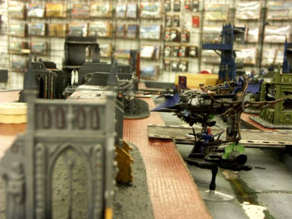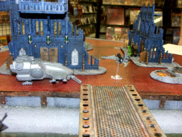 The Commander splits from the Fireknives. They promptly blast the Haemy’s Raider out of the sky. I use one of my old standby tricks of deploying off the jutting nose to pop out on the other side of the building I was cowering (bravely) behind. ‘Ha-ha, Lorek, you fool,’ I say, ‘I have cover saves and shall soon assault you.’