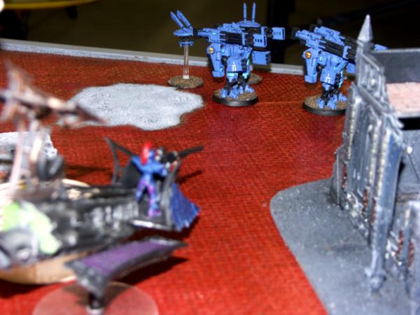 Commander came out in the mid right field with the Devilfish on the extreme right, the Broadsides lumbered in on the mid left field with the Hammerhead on the extreme left. His shooting phase was pretty accurate as he lit up a Ravager, a Wych Raider, and two different Venoms. However, my cover saves were ungodly as I made something like 5 of 6 of them and the end result is only the Venom on the bridge on the left flank suffered an immobilized result. Other than that the DE forces were untouched.