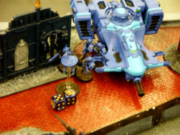 In the last picture above you can see a Venom and Ravager threatening the Tau on the right flank, also visible is the poking in nose of my Haemy’s Raider on the left side of the picture – I wimped out of attempting that charge but did decide to get the lance into play.