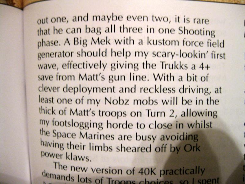 The reason I ask for the photo of the cover is so I can go get a copy of said article. Not because I question the legitimacy. Last time I saw a WD battle report between Phil Kelly Orks and a Guard Player was for Battle Missions and there was no mention of the KFF save value in the article.