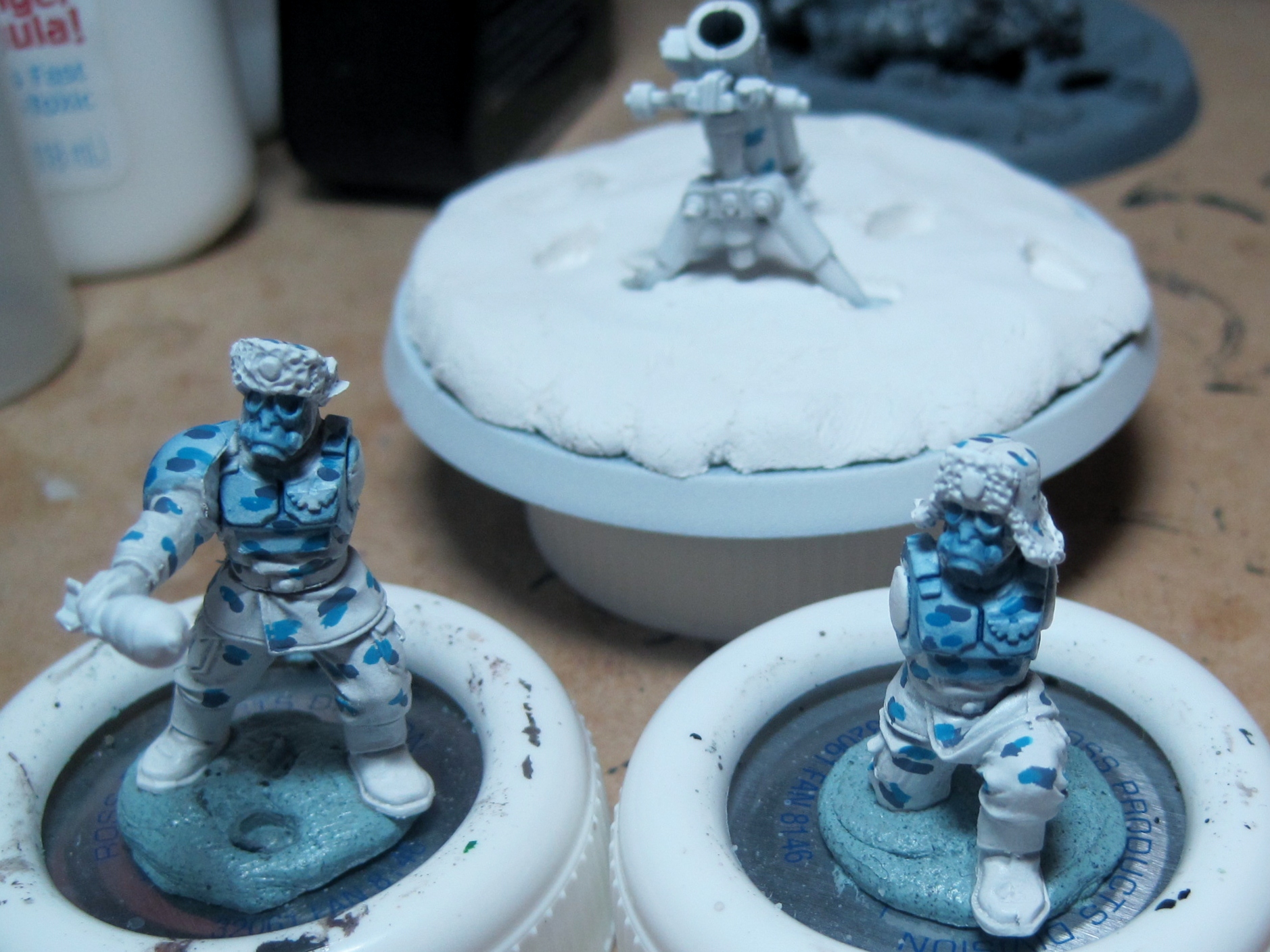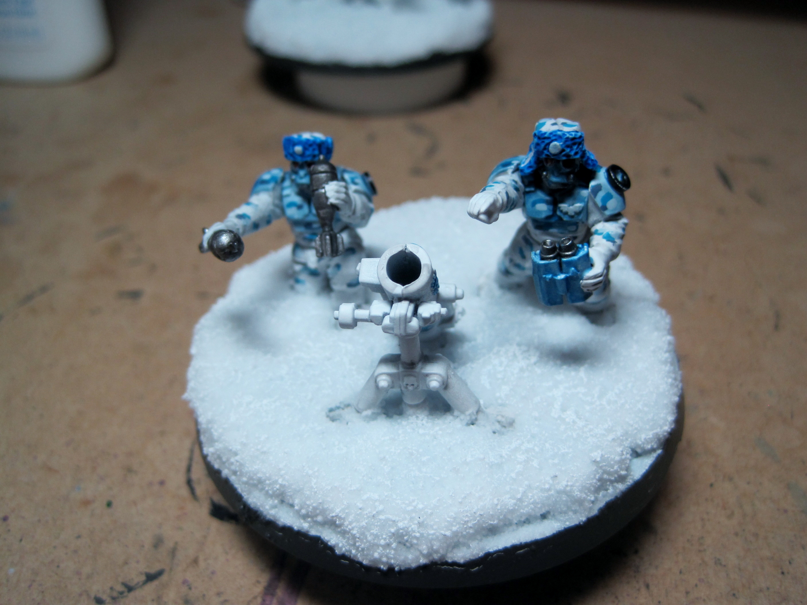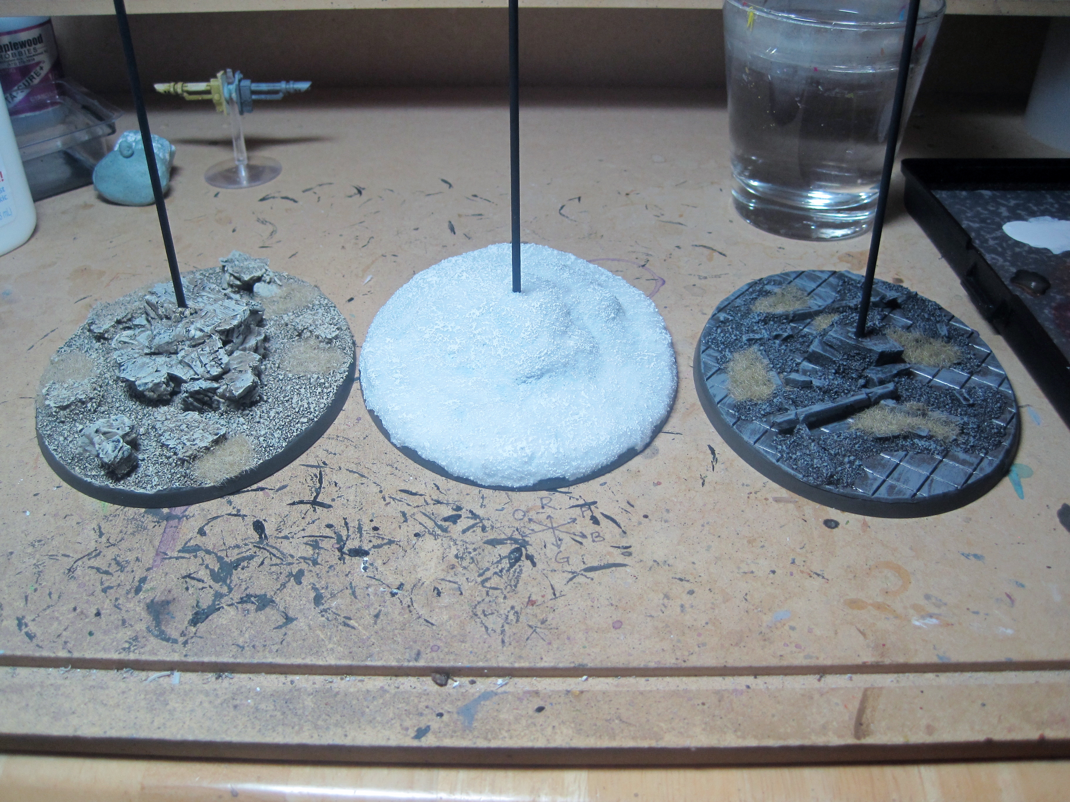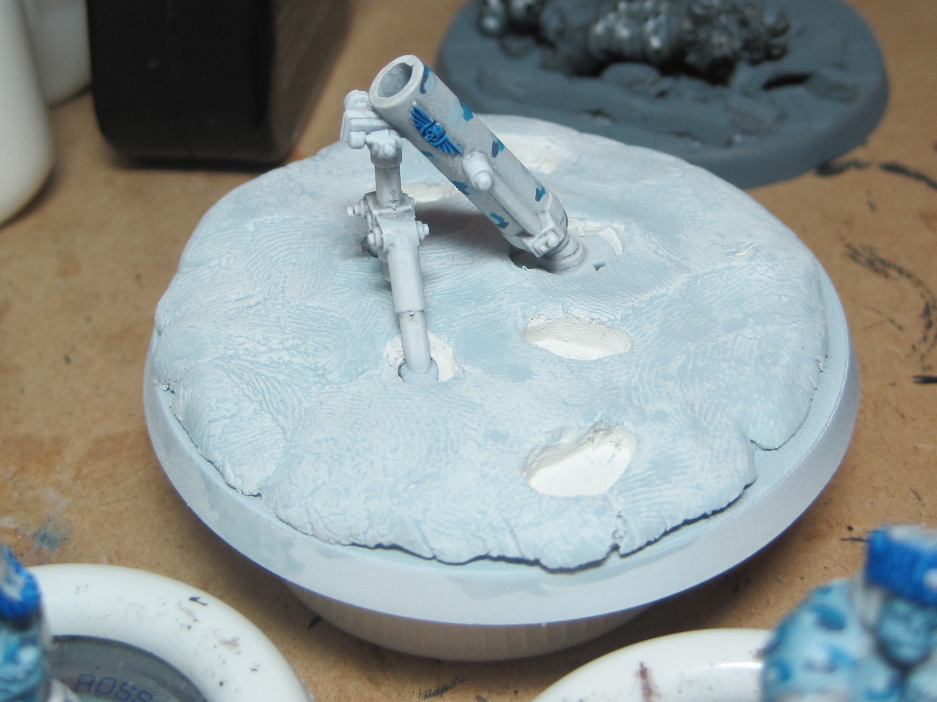 D'oh!! Ach, crivens!! You're correct. That would have been a nice touch, but at this point it isn't going to happen. I put a blob of clay on the base and pushed a model into it. Primed white, than a watered down ghost gray (very light blue/gray), a layer of woodland scenics snow, drybrush white. I think it creates a nice little effect.