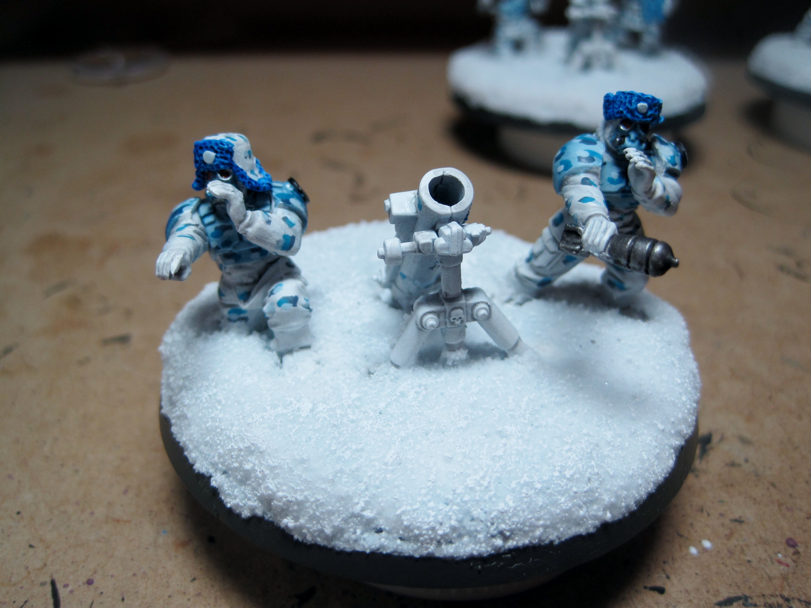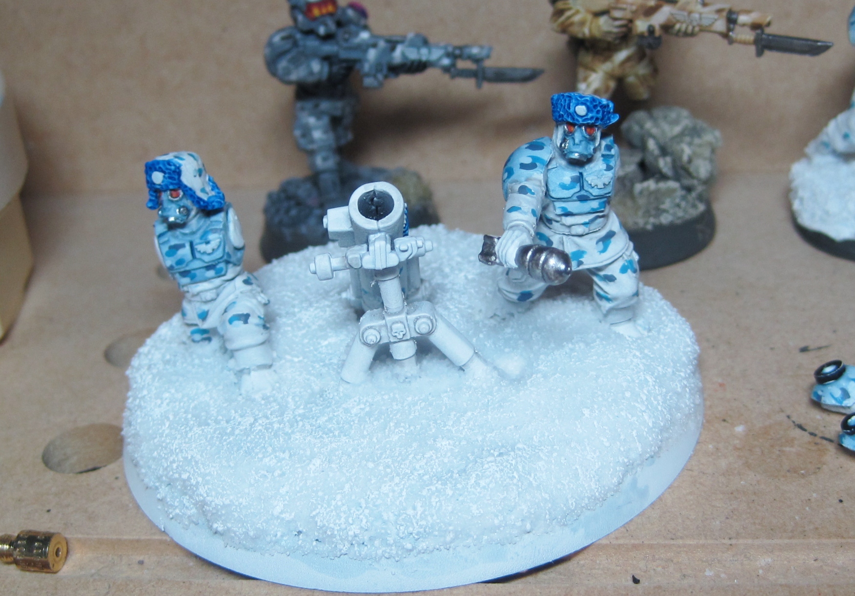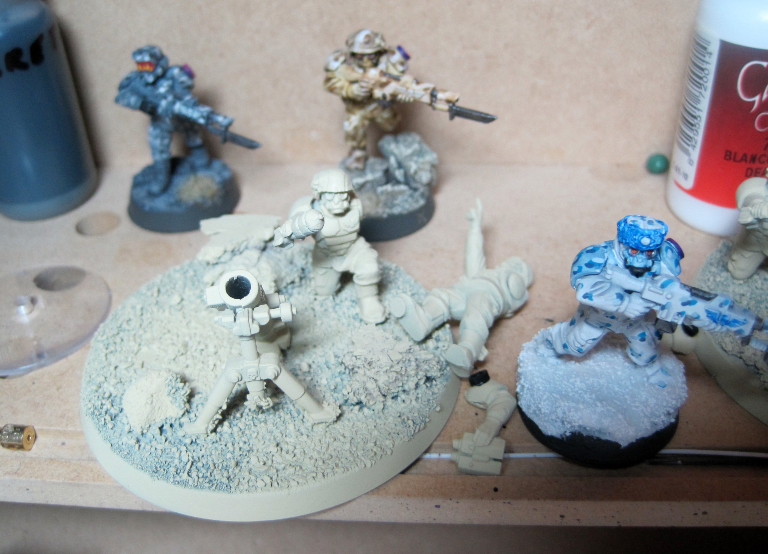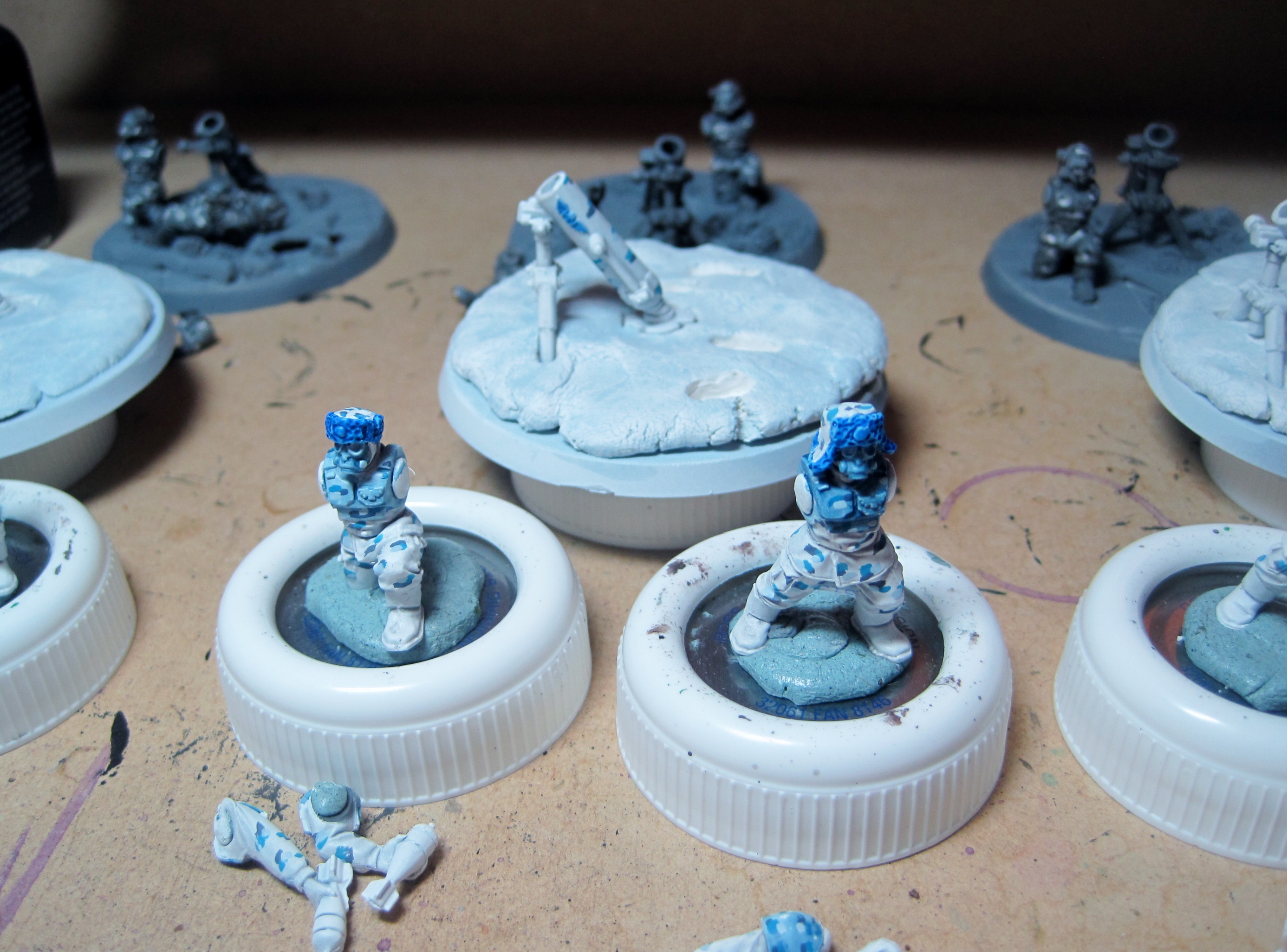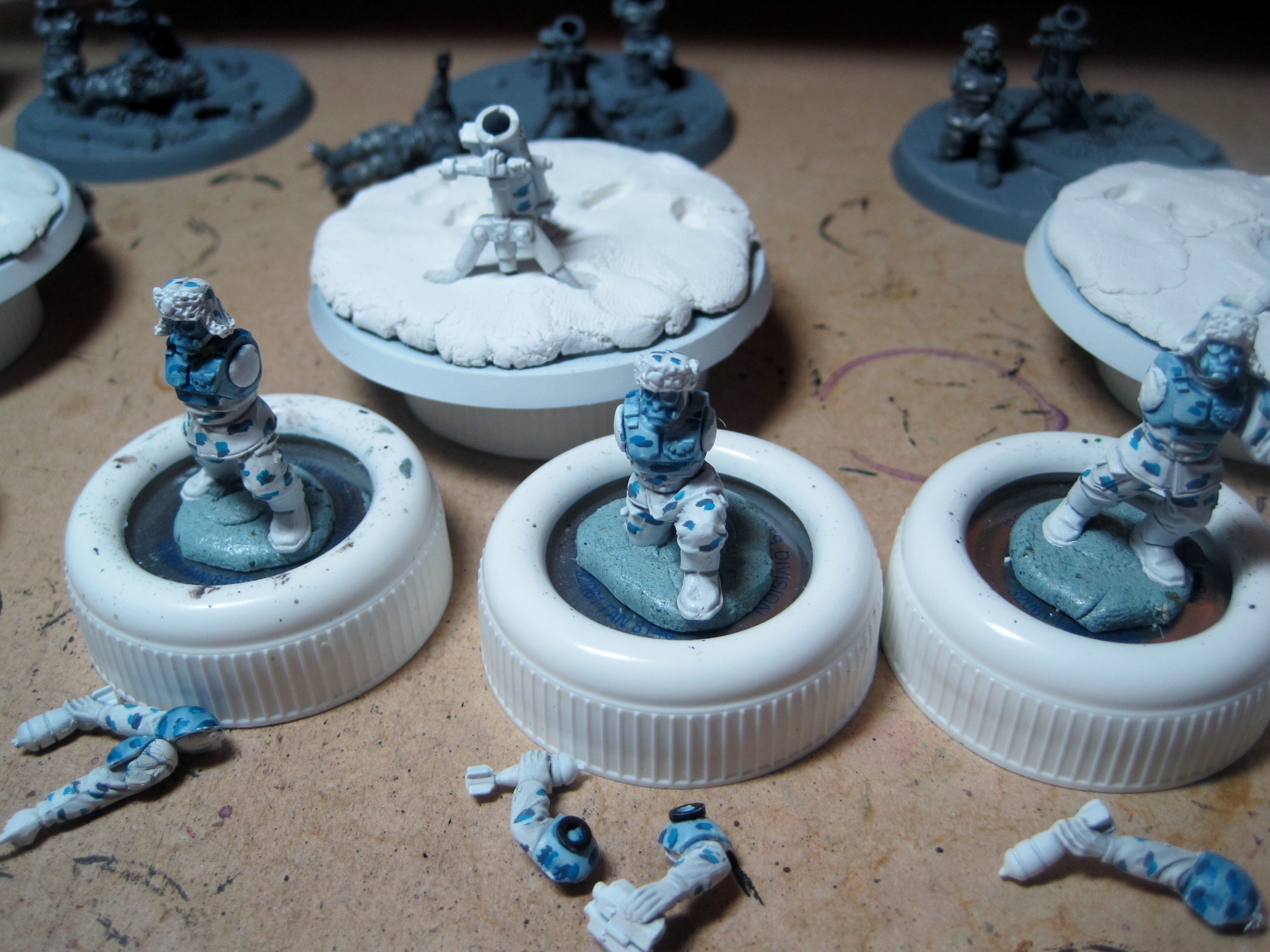 D'oh!! Ach, crivens!! You're correct. That would have been a nice touch, but at this point it isn't going to happen. I put a blob of clay on the base and pushed a model into it. Primed white, than a watered down ghost gray (very light blue/gray), a layer of woodland scenics snow, drybrush white. I think it creates a nice little effect.