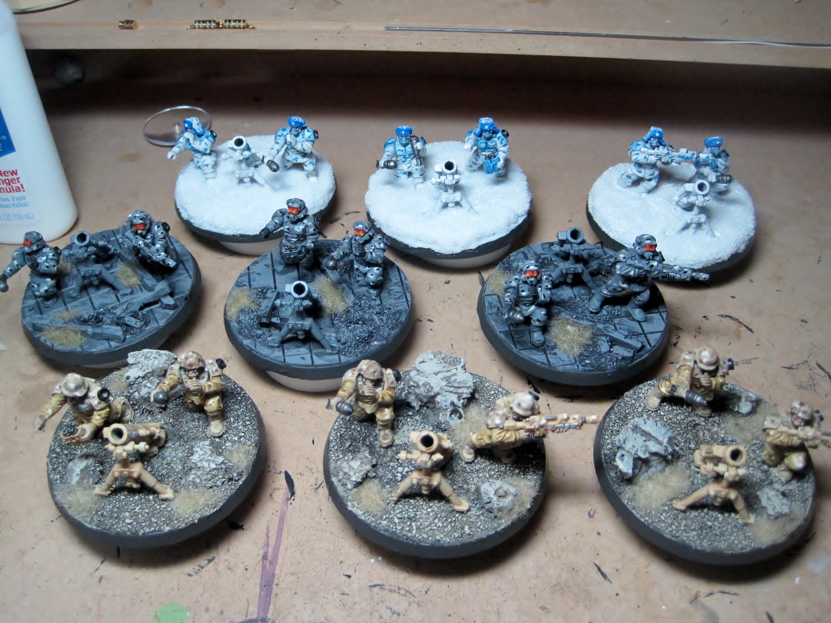 Part of me thinks the seperate camo types look silly, Part of me thinks the seperate base types look really silly, Part of me thinks the Munitorium screwing up would easily explain it, Part of me knows exactly why you did it, part of me thinks why not turn it into 3 seperate armies. All of me thinks this looks great!