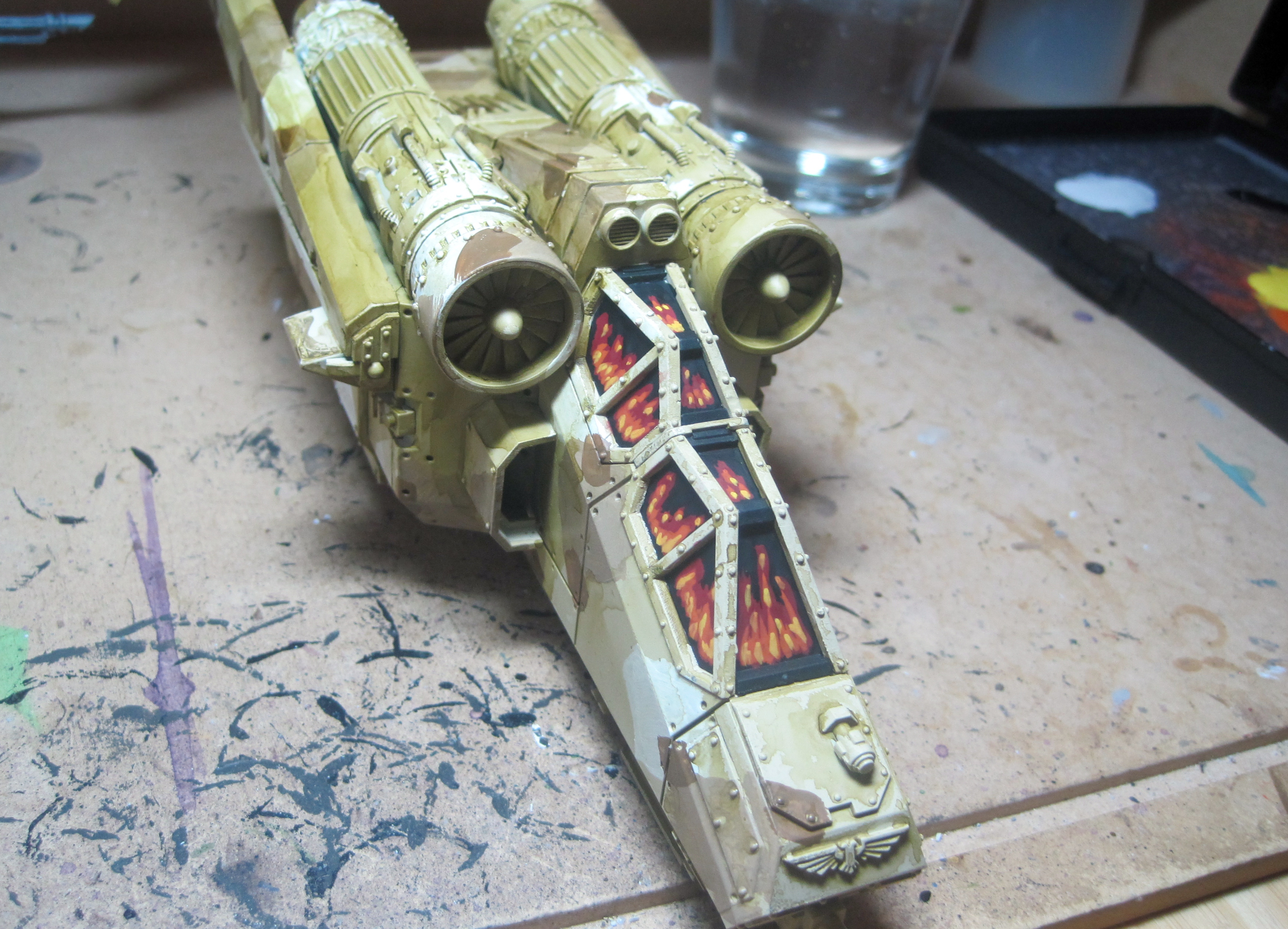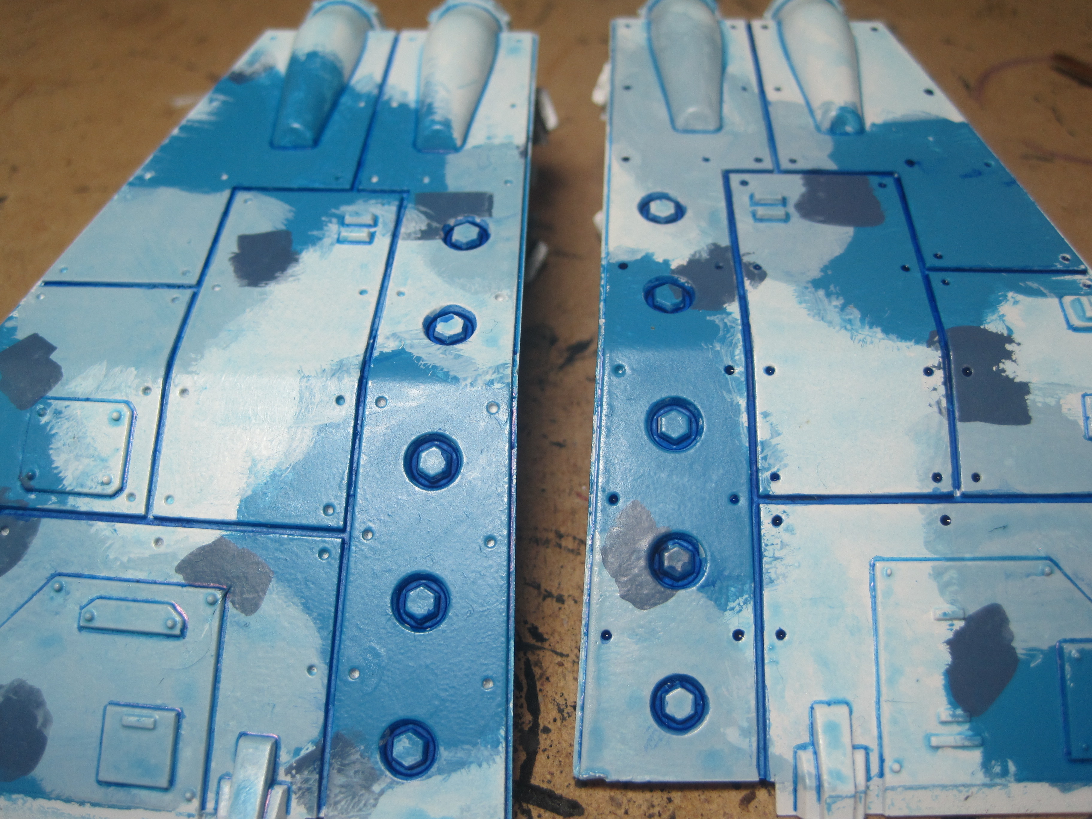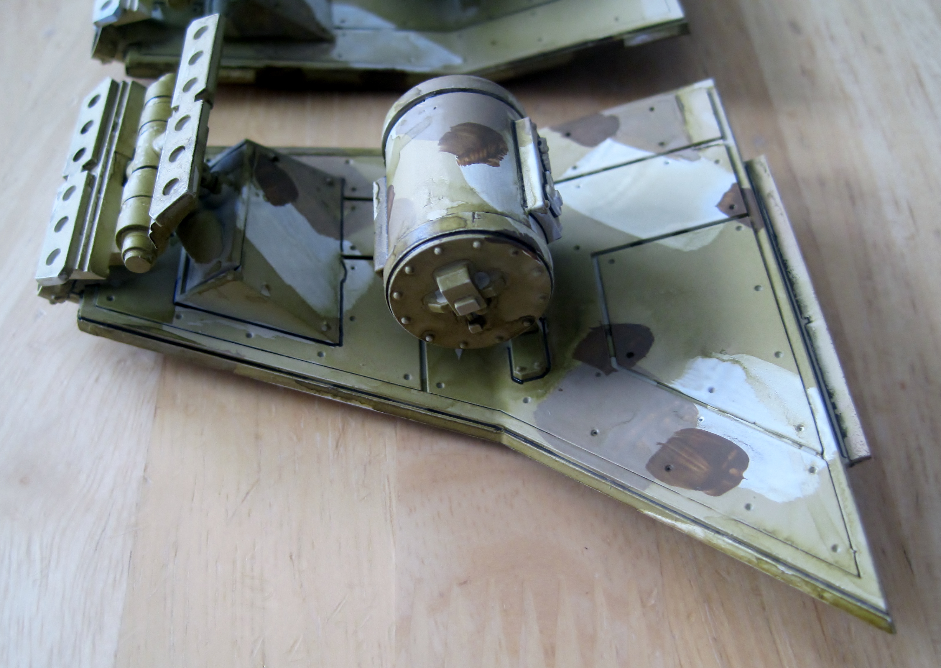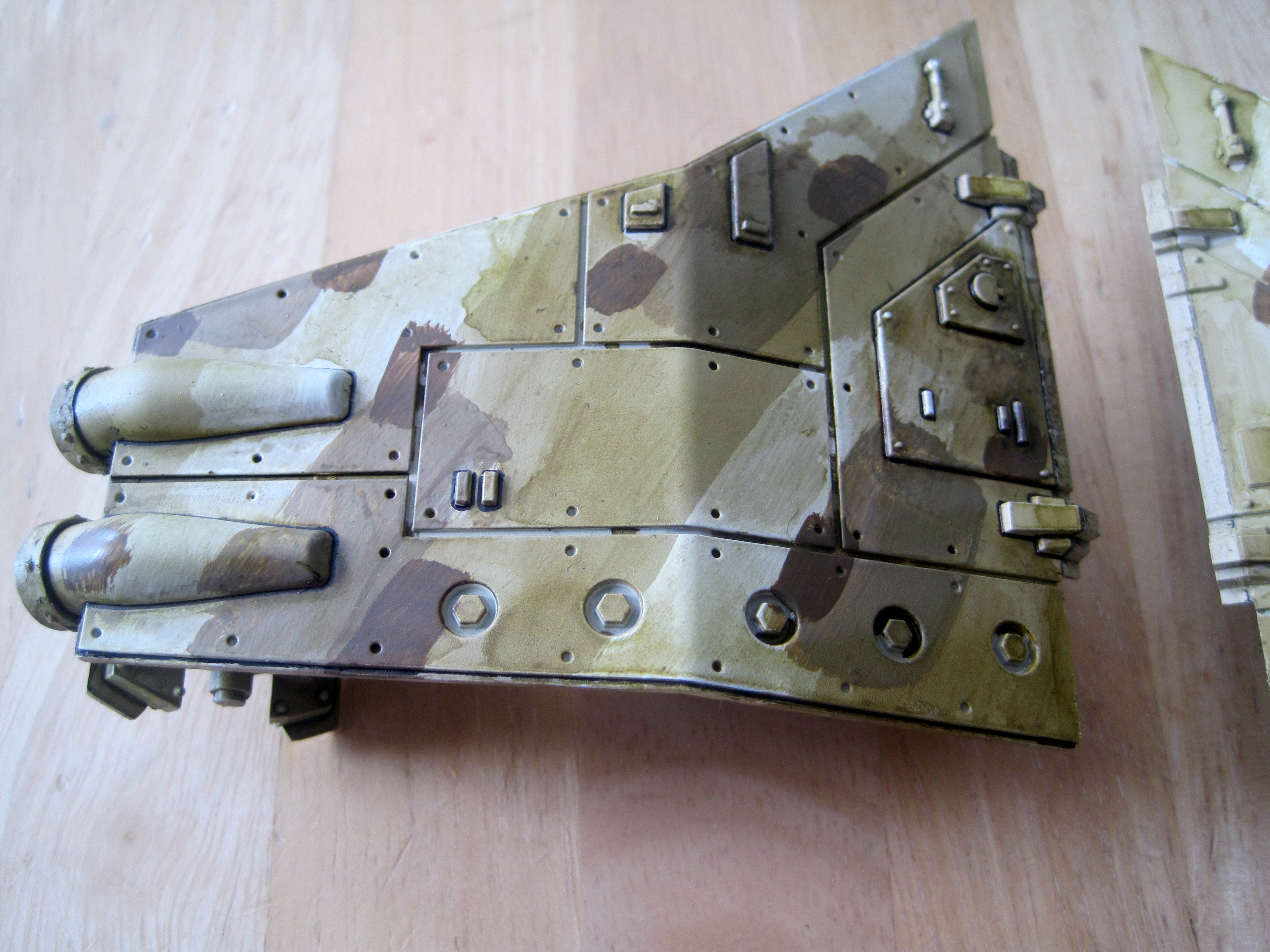 I started dark lining the desert valkyrie. I will be inking the "tracks" with a dark brown ink. The following pictures show the difference between lined and unlined sections. The lining doesn't translate well to photos, but it makes the model pop a wee bit more.