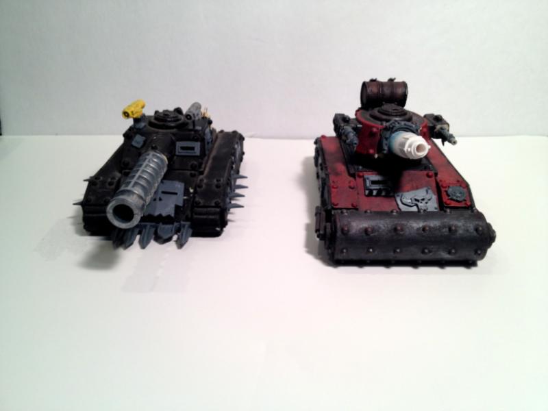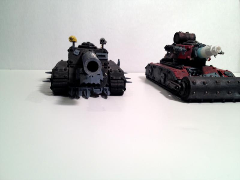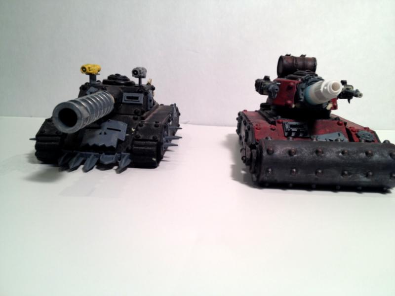 Next up, some Orky tanks. A buddy of mine used to make these based on Epic ork tanks. I used them as the base, they'll belooted wagons, one has a boom gun, the other can be a boom gun or a scorcha. The ludicrously large boom gun is somethign from a hardware store that screamed "I should be a boom gun, I'm only $1.19!"