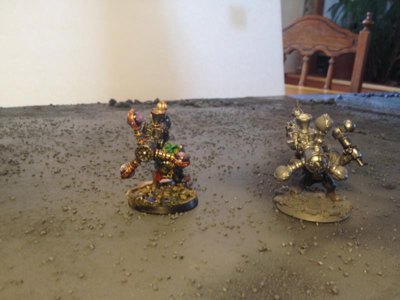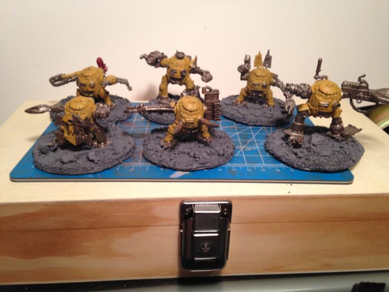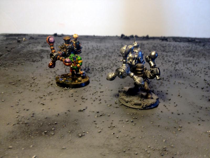So they are quite small compared to the new ones from GW, but I made the bases the same size. You have to figure that if there are TWO big meks running around, they have to have a grip of lovable grotties that would love to get into a little tiny armored suit and run amok.