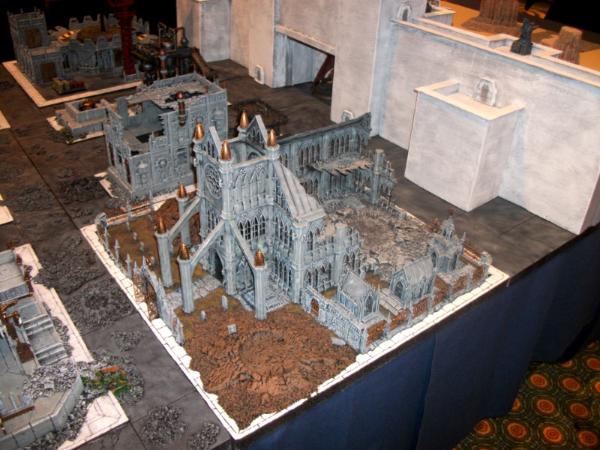 This guy bought the actual Forgeworld tiles, painted them up very nicely, and built and painted buildings for the tiles. One of the buildings he made was this one (the bigger one in the pic):