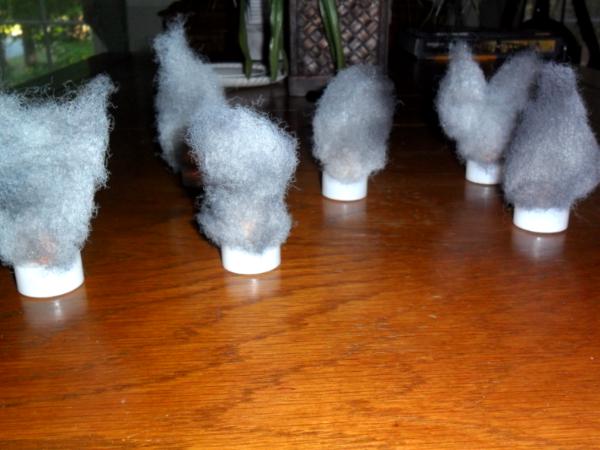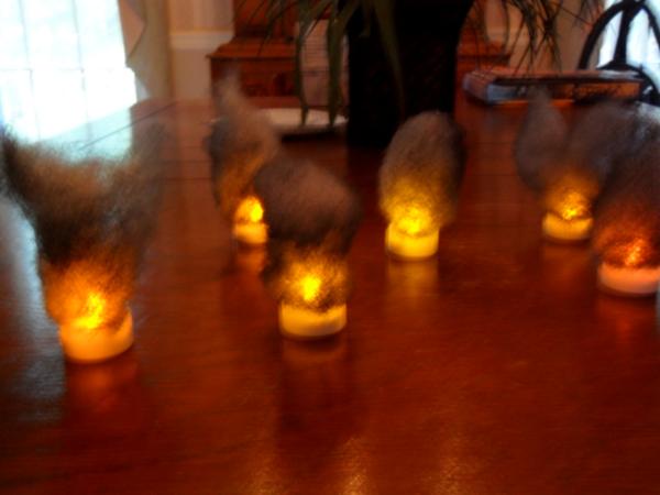 Turns out you just need some electric tealight candles, some stuffing and primer/paint. So I went to a Walgreen's (corner drug store), got a 6 pack for $5, took some stuffing I had, and went outside. I formed the stuffing into appropriate shapes (as opposed to inappropriate ones?) and went to town on them with white, gray, and black spray primers/paints. A little superglue later and they're on top. I may use some hairspray to hold the shape better and I will paint the e. candle base black but there you go!