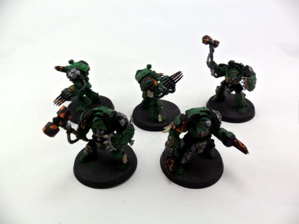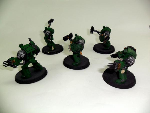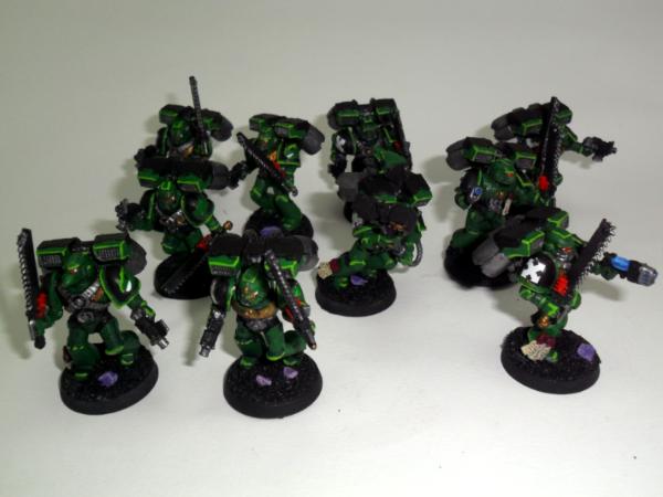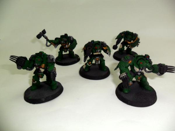 Next some assault terminators that I have. They'll likely split into 3SS 2 LC and 2SS and 3 LC for some variable punch and soaking. I am trying to think of ways to make more of a salamander feel without painting just flames on them. WIP!