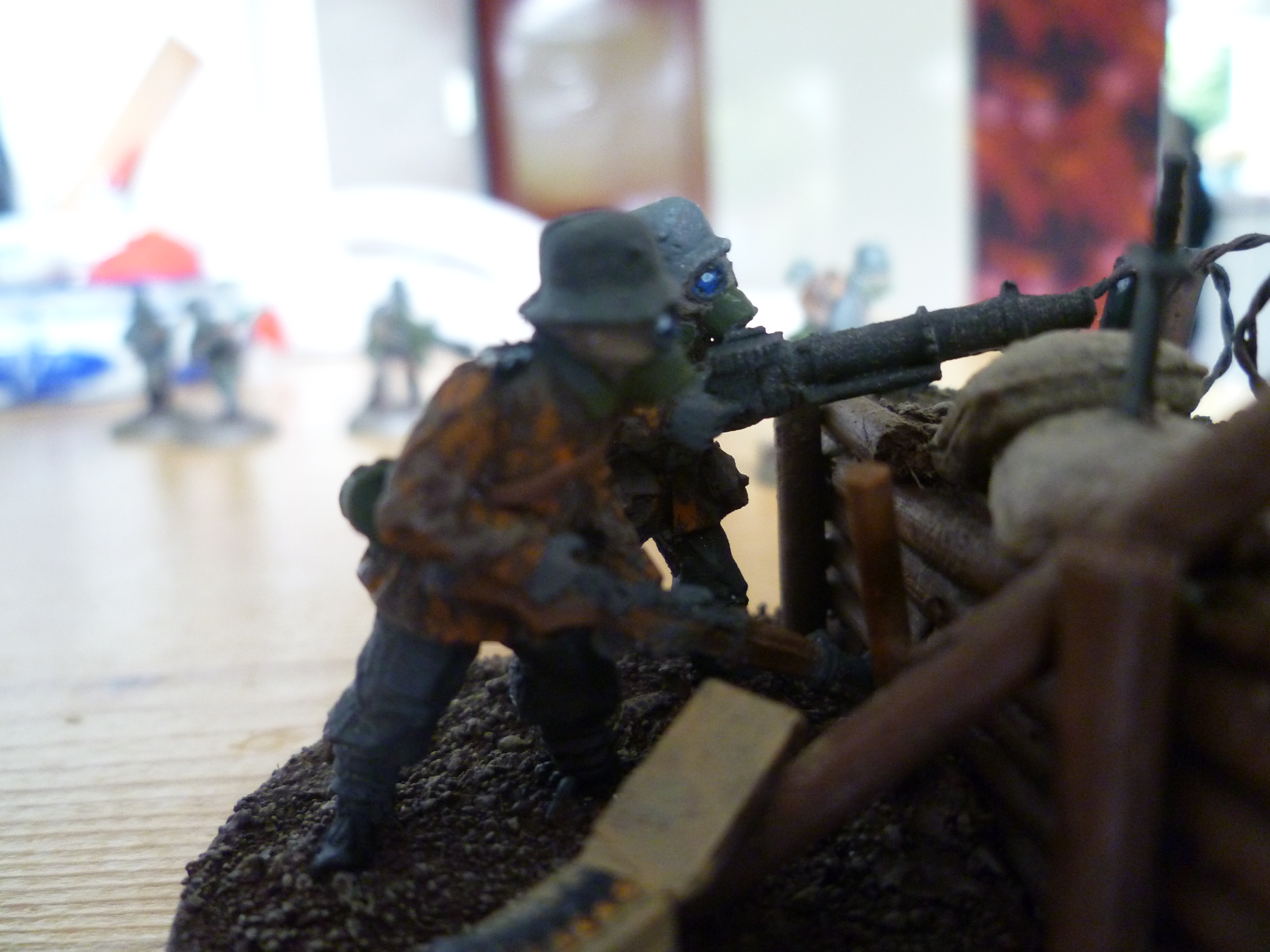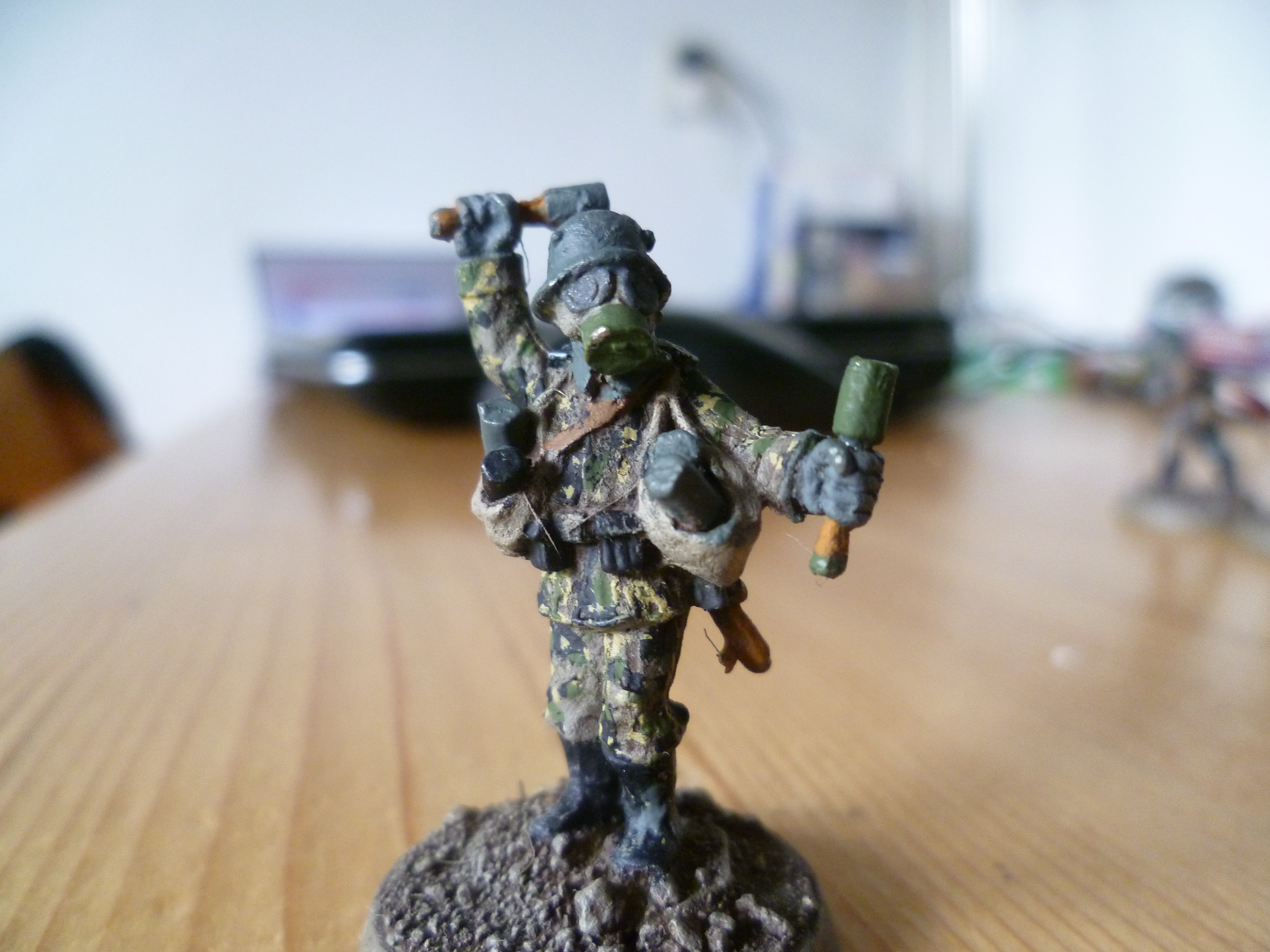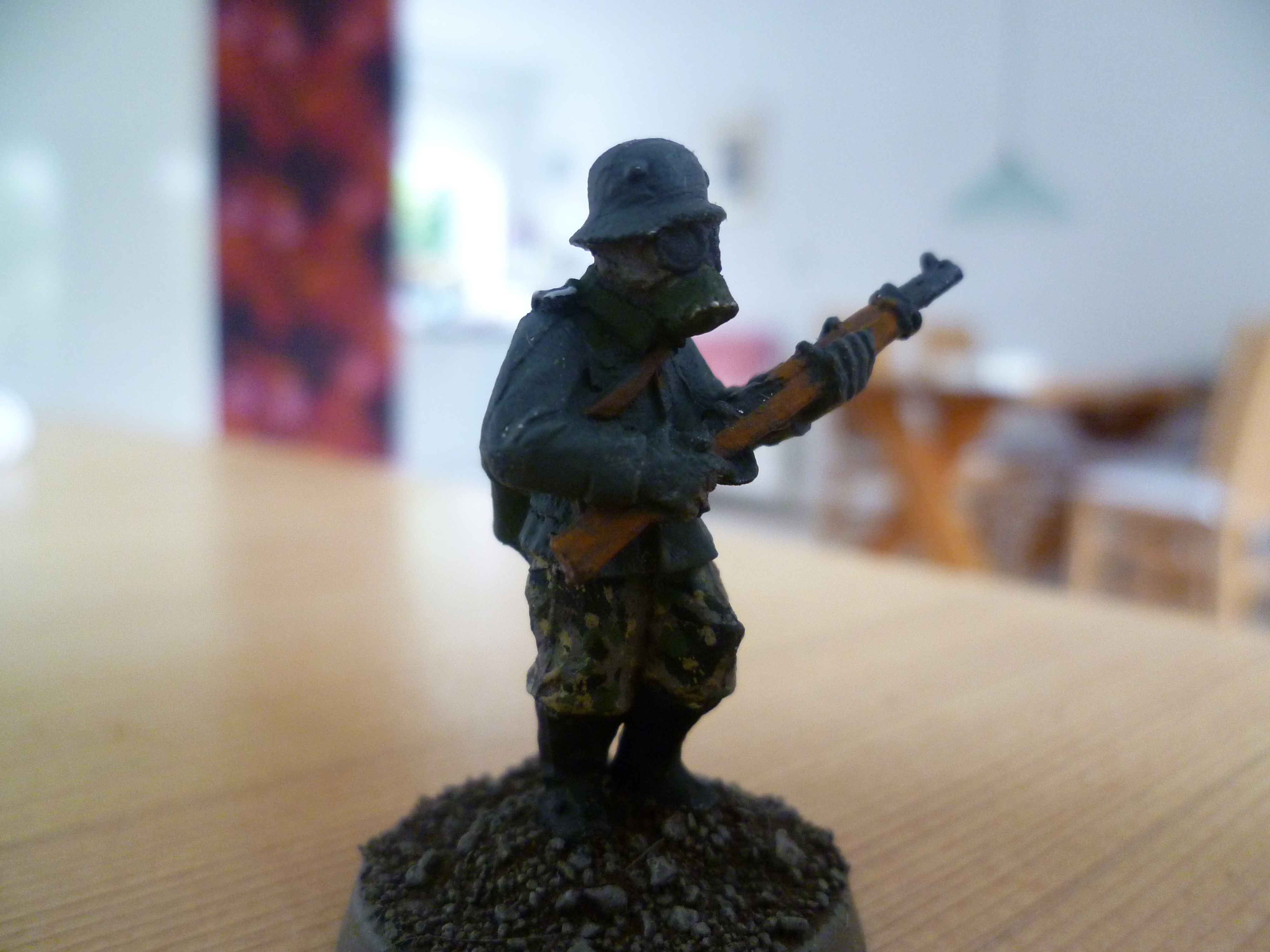 The pointing guy has yellow/orange goggles and I painted the machine gun team with blue goggles. I painted these figures in a variety of Waffen-SS camo patterns.
