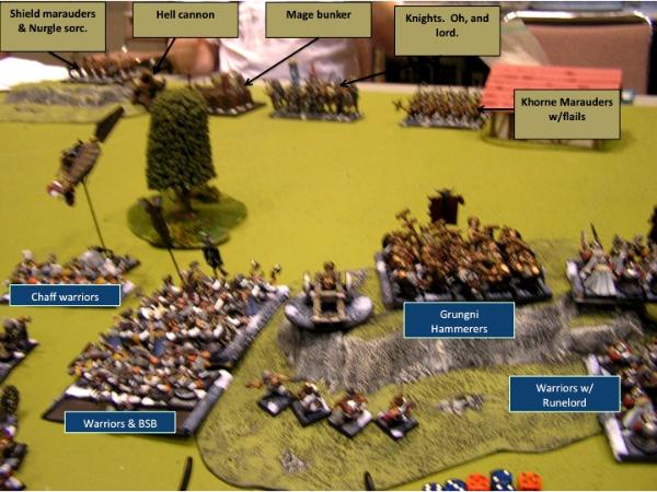 The plan would be to hang back, kill the hell cannon if possible, a couple knights if I could, and get hammerers into the mage bunker to kill wizards for extra VPs. My problem with this list was that war machines were terrible at killing the knights and Tzeentch Ironcurse icon warriors. Inevitiably, the lord would hit my lines with his stubborn Ld 9 and slowly kill of an entire unit, then run through whatever he wanted. Things get much, much worse if the bunker goes 3+ ward, stubborn.