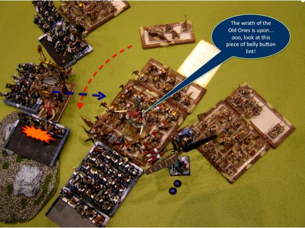I have a bit of a rough choice- I can charge my hammerers into the flank of the saurus bunker directly, or hit the salamander and overrun instead. The latter is worth 75 VPs, but a bad roll on wounds (allowing the Slann to provide a modified Ld10 coldblooded re-roll check) or a bad overrun leaves the warriors on their own next turn, and I’ll need to generate as much kills as possible to keep them in the game. In the end, I skip past the salamander and go for the main event.