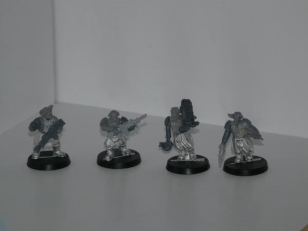 lol... you know... great minds think alike^^ and about dapper... i think i will in due time make some of them look not so daper at all^^ thanks archroy, if you know more cool gaelic vocabulary i would be very interrested... by the way the production of the black devils goes on and on... here are again some newish cannonfodder... a very tired possible plasmagunner...note the gun currently not glued on....just a mockup for now...do you recon this pose could work? name of this sergant is unknown currently but his nickname is "the swan"...for he has such nice and flowing hair...he cares and combs it and is overall the most well kept of the wild bunch... he is just loading through a freshly energy cell...  i really like the studded look on his torso... groupshot of the currents... cheers, vik