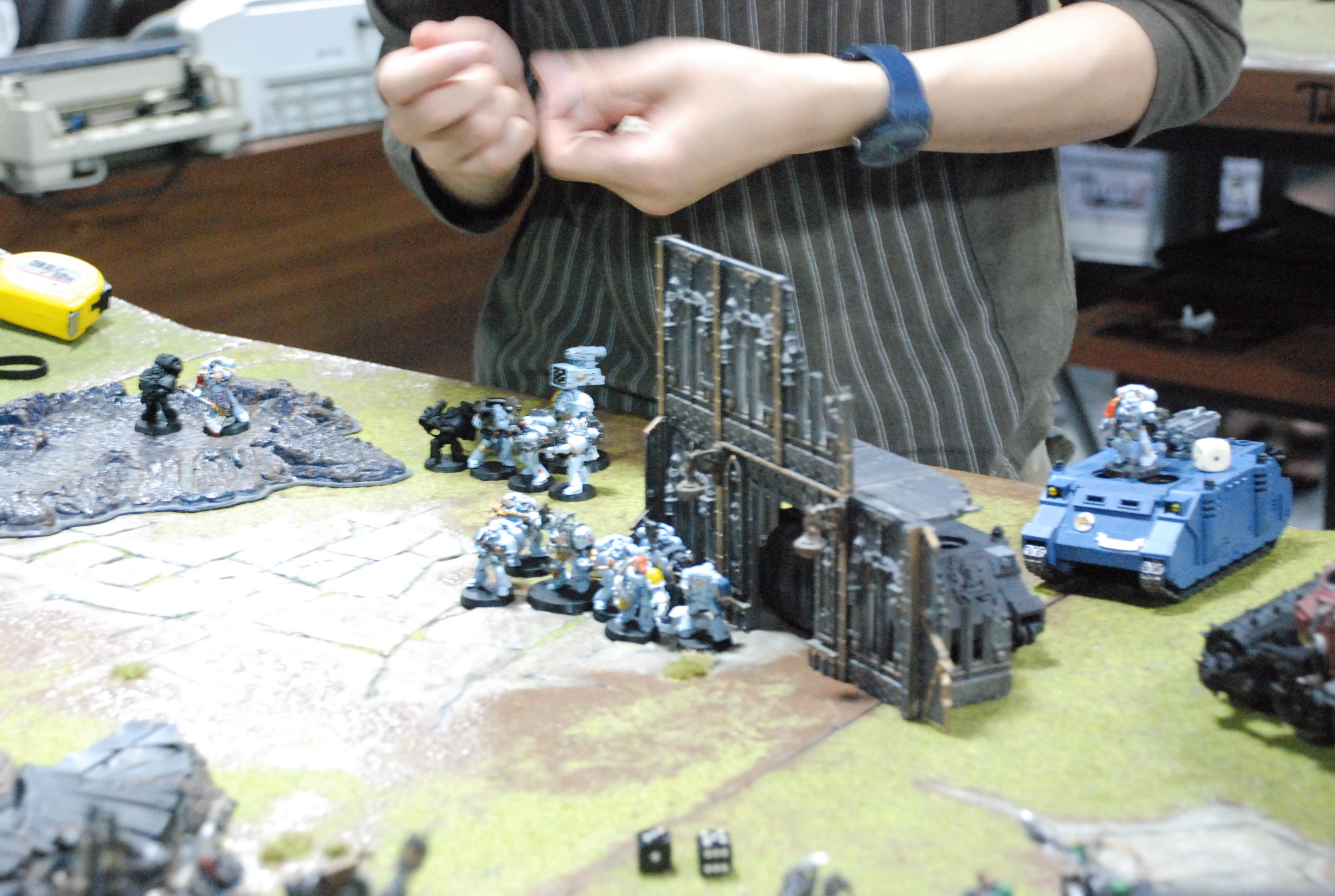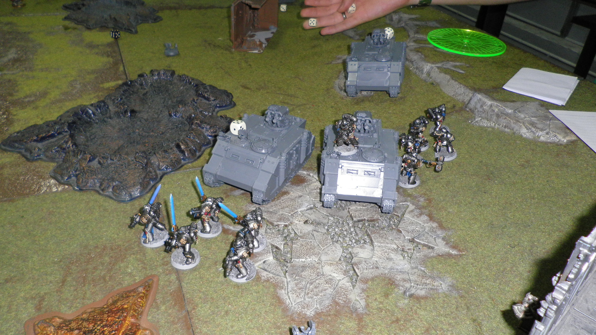 I manage to wreck the other two Razorbacks on his offensive wink, his lead strike squad fell to shooting; his purifiers got within 10-12 inches of my Strike squad in a rhino – I disembarked 2 inches, moved 6” toward them and assaulted – Cast hammer hand (he does not as he does not want to risk losing his hammer) (note he had 4 guys in the squad) – I managed to cause 4 wounds in the assault wiping out his purgation squad)