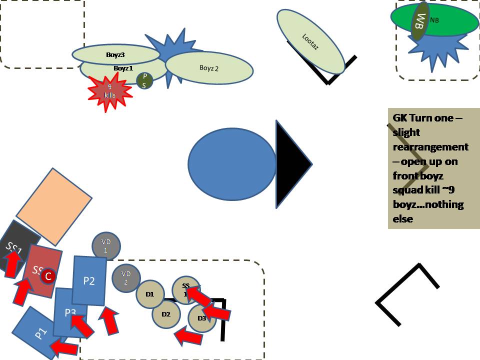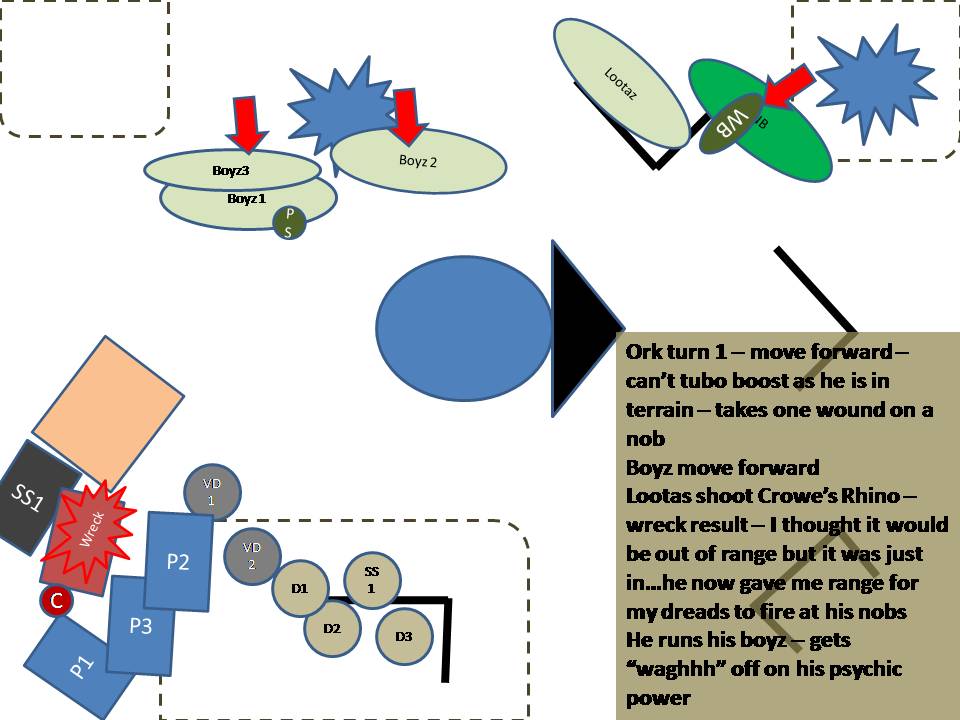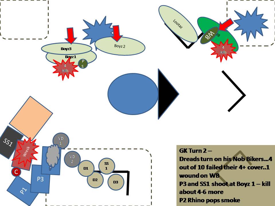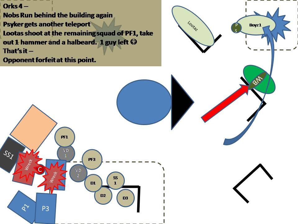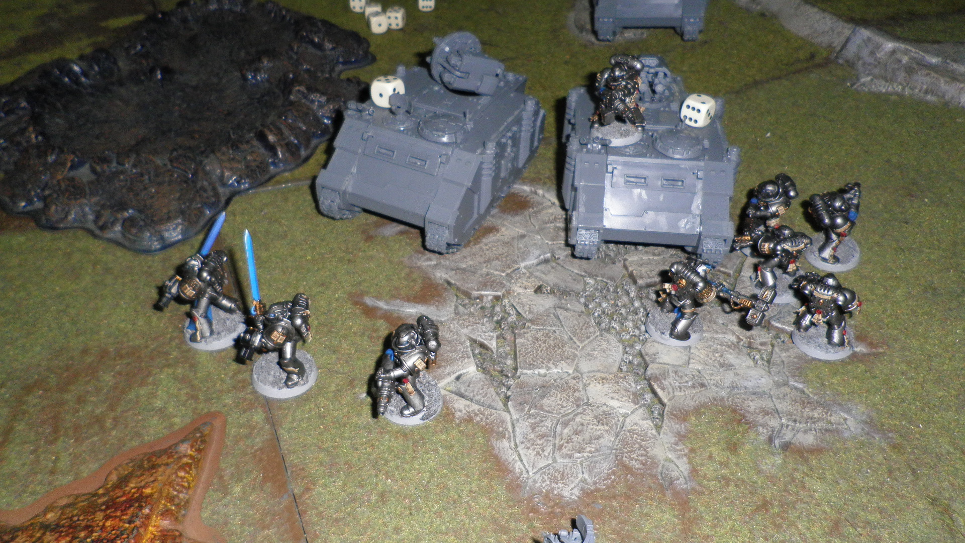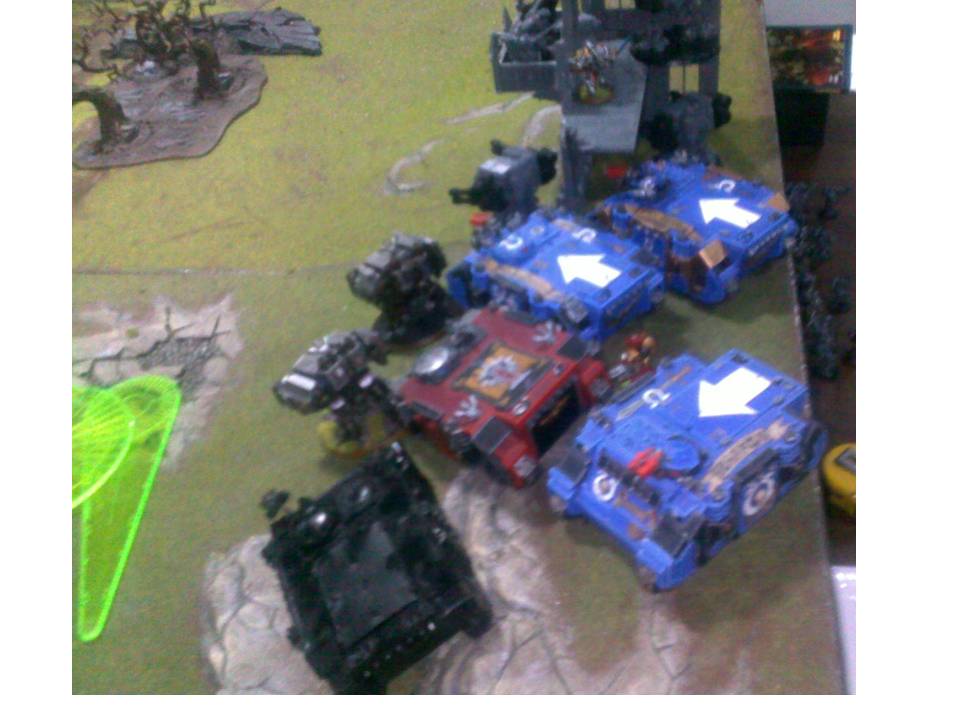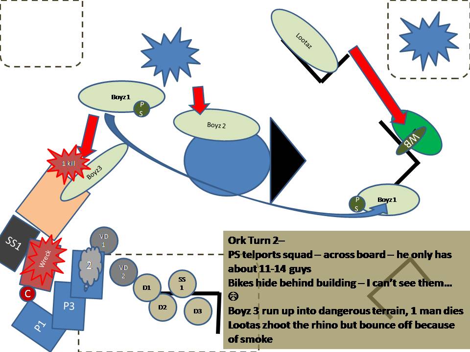 SS gets out and moves forward… other SS razorback moves behind the wrecked razorback for cover…purgartros move forward and will run up behind the razorback for cover - he is putting pressure on my objective :(
